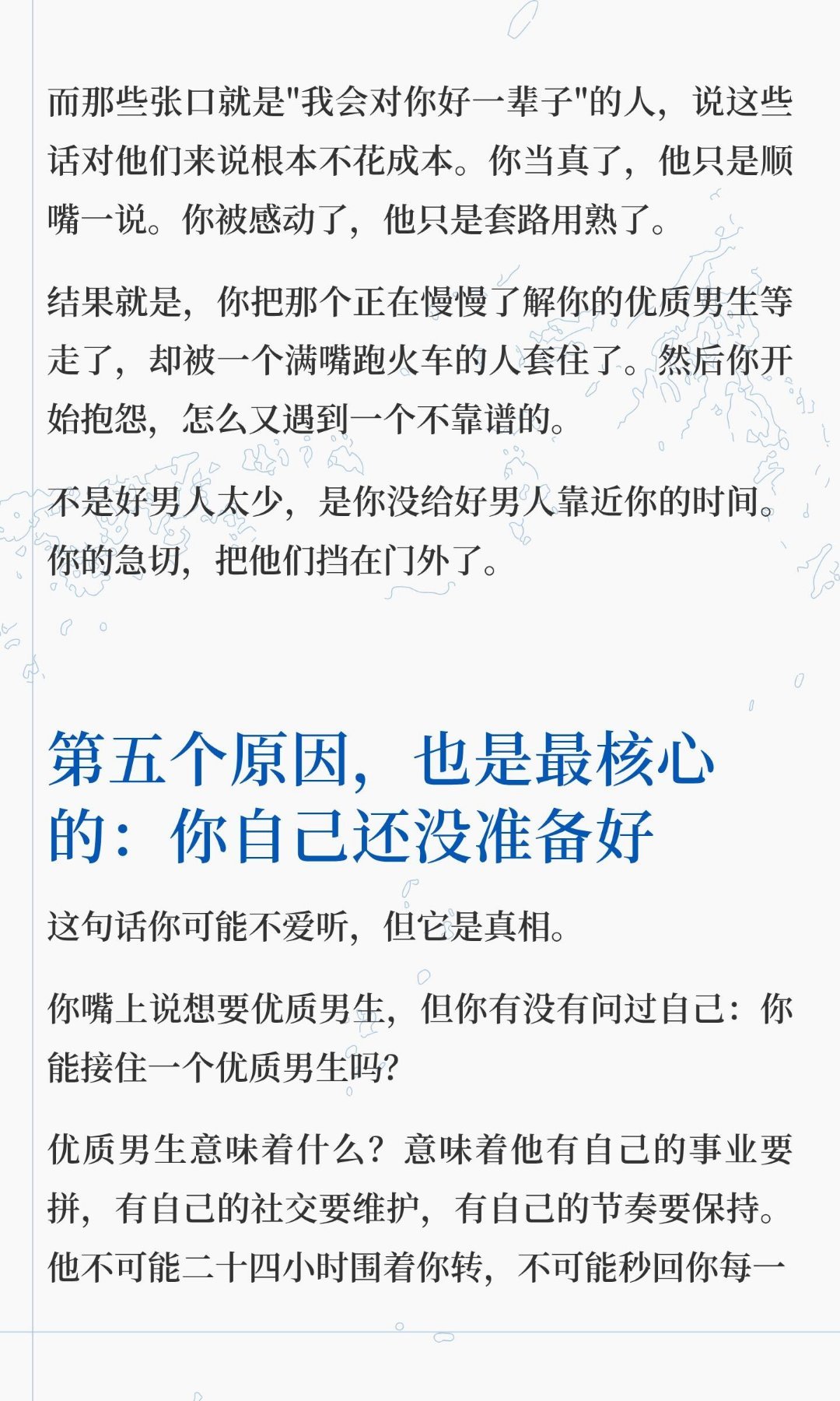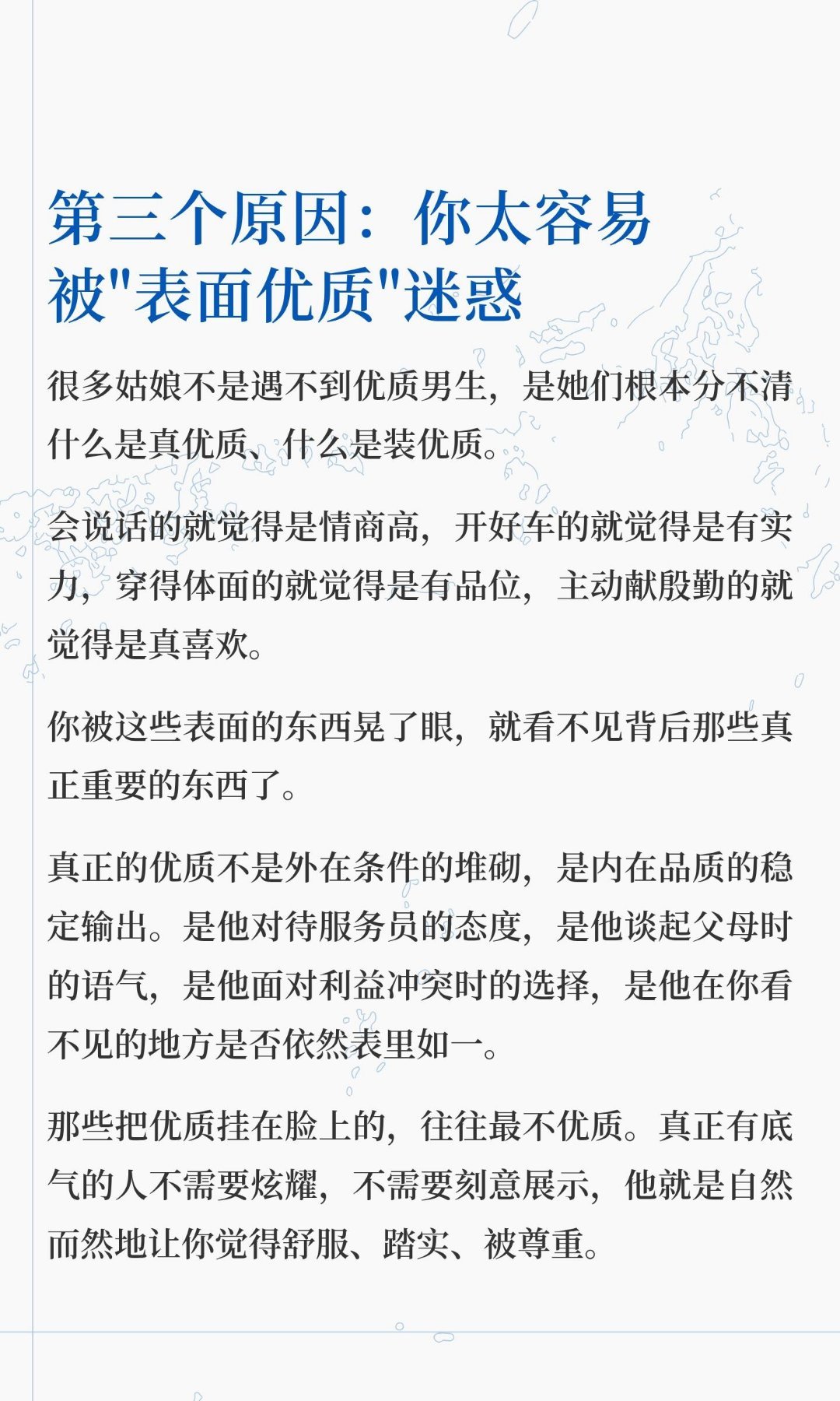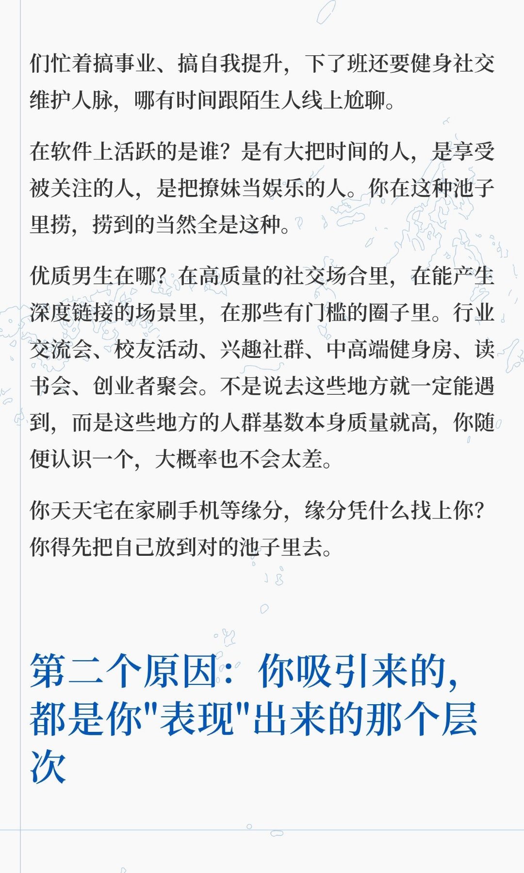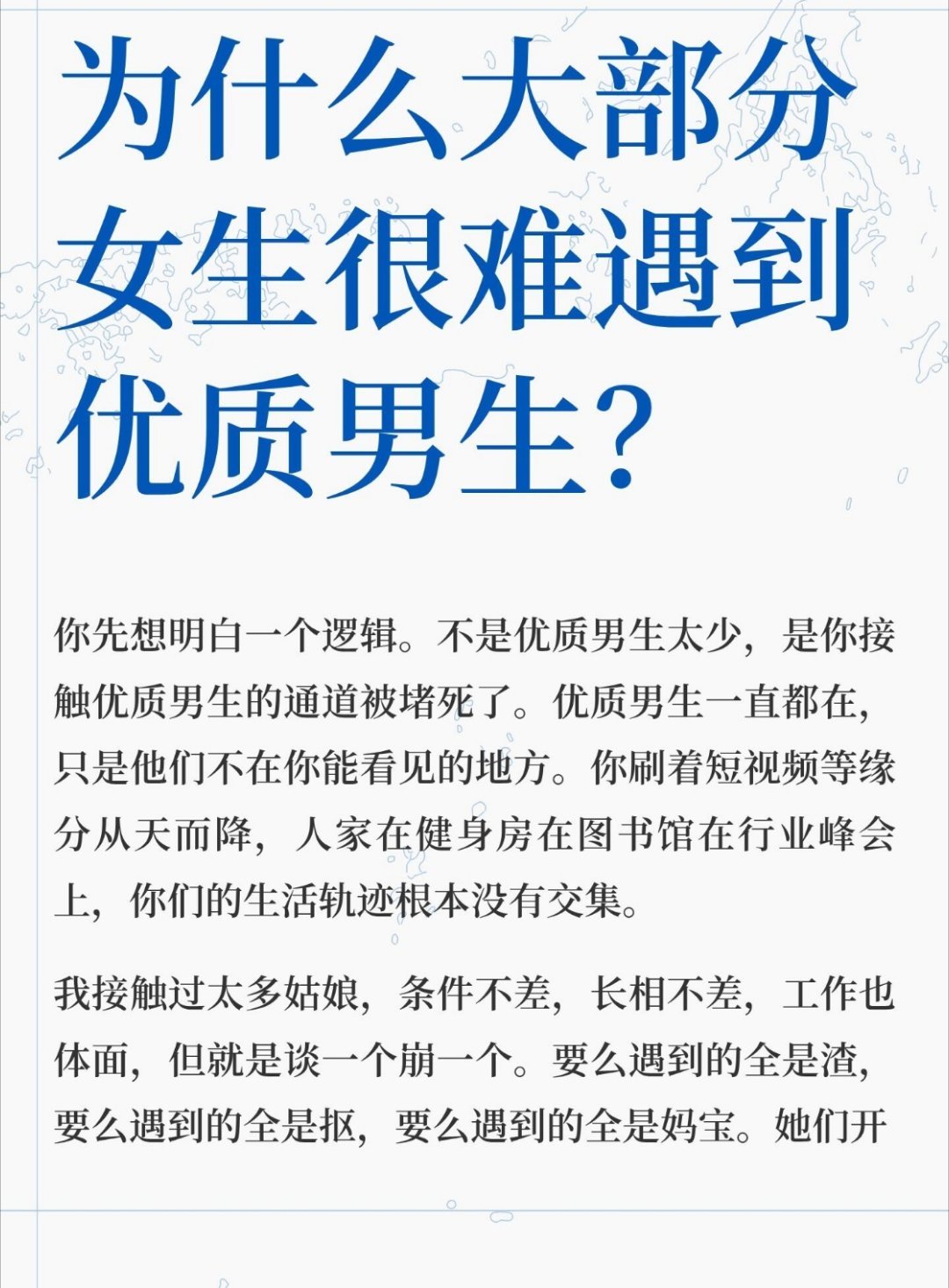 为什么大部分女生很难遇到优质男生?优质男生不在你刷短视频的地方,而是在高质量社交场合。改变筛选方式,提升自己,才能遇见真正优质的人。感情是双方共同成长的过程,先让自己成为更好的人,自然会吸引到合适的人。