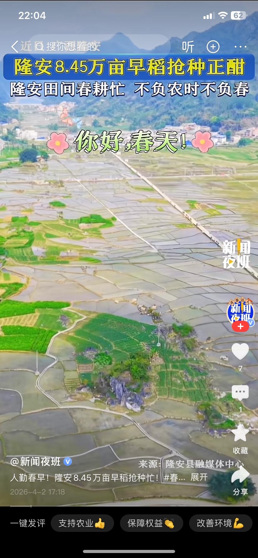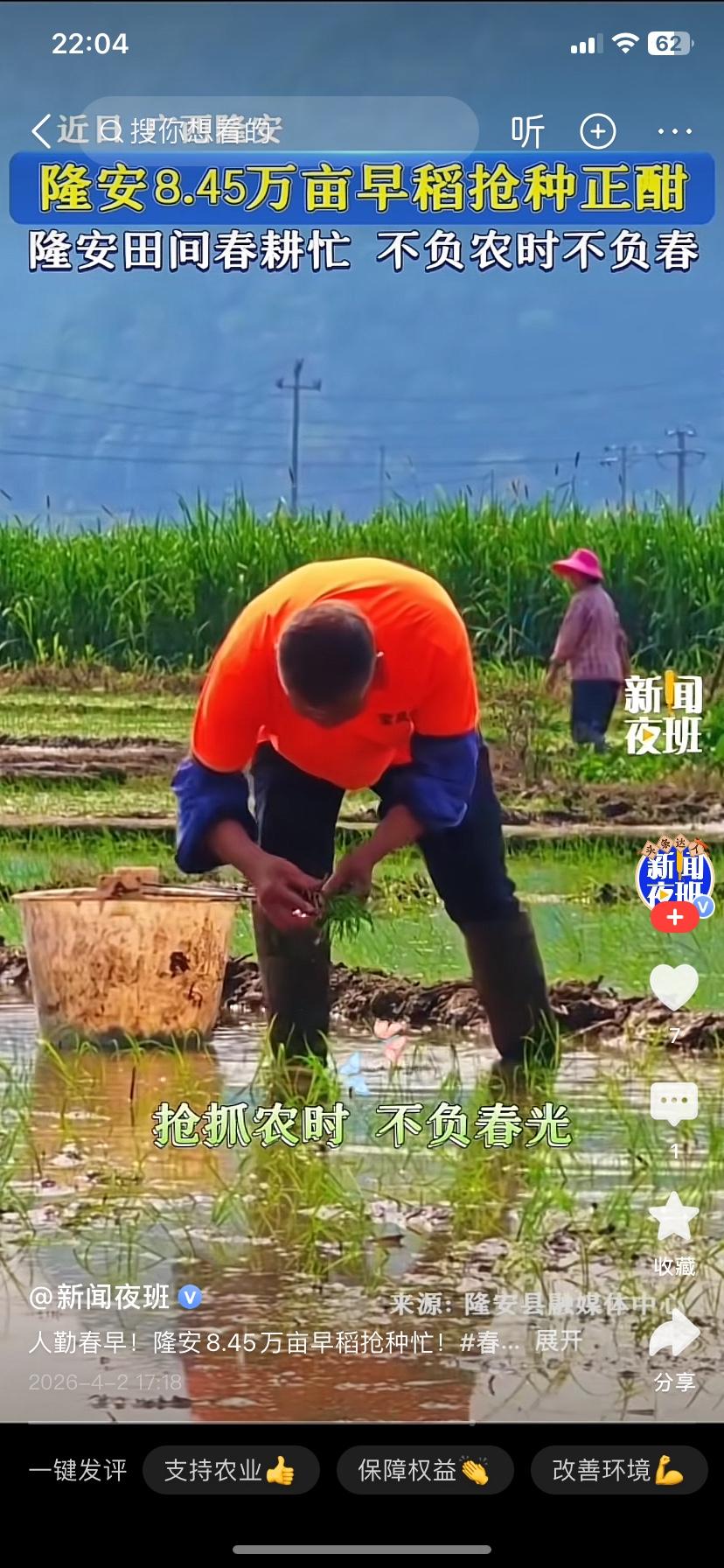 ,人勤春来早!隆安8.45万亩水田奏响早稻抢种“春耕曲” 春风拂沃野,春耕正当时。当春日暖阳洒满隆安大地,广袤的田间地头早已是一派热火朝天的景象,全县8.45万亩早稻抢种工作全面铺开,农户们抢抓农时,与春光赛跑,勾勒出一幅生机盎然的春耕生产画卷。 走进隆安县各乡镇的连片稻田,泥土的清香扑面而来,田间处处是忙碌的身影。农户们挽起裤脚、躬身田间,熟练地分秧、插秧,指尖翻飞间,一行行嫩绿的秧苗整齐排列;田埂上,旋耕机轰鸣穿梭,翻耕泥土、平整水田,农机作业的轰鸣声与农户的欢声笑语交织,奏响了活力满满的春耕序曲。在都结乡等种植核心区域,连片稻田里更是人机协同、分工明确,耙田、育秧、插秧各环节有序推进,原本空旷的水田,正快速被绿油油的秧苗覆盖。 为确保早稻种植不误农时、稳产增收,隆安县提前谋划、精准发力。农技人员下沉一线,走进田间地头手把手指导农户科学育秧、规范插秧,破解种植难题;农资储备提前到位,种子、化肥、农药等物资足额供应,用水统筹精准调配,全力保障春耕生产需求。同时,当地紧抓“冷尾暖头”的有利气象条件,引导农户抢晴播种,还推行高效轮作模式,让冬闲田变身增收田,为粮食增产筑牢根基。 春耕是全年农业生产的第一仗,8.45万亩早稻种植,既是隆安严守粮食安全底线的务实举措,更是农户们期盼丰收的美好希冀。眼下,抢种工作仍在加速推进,一株株秧苗扎根沃土,孕育着秋日的丰收希望,也为全年粮食丰产丰收打下了坚实基础。