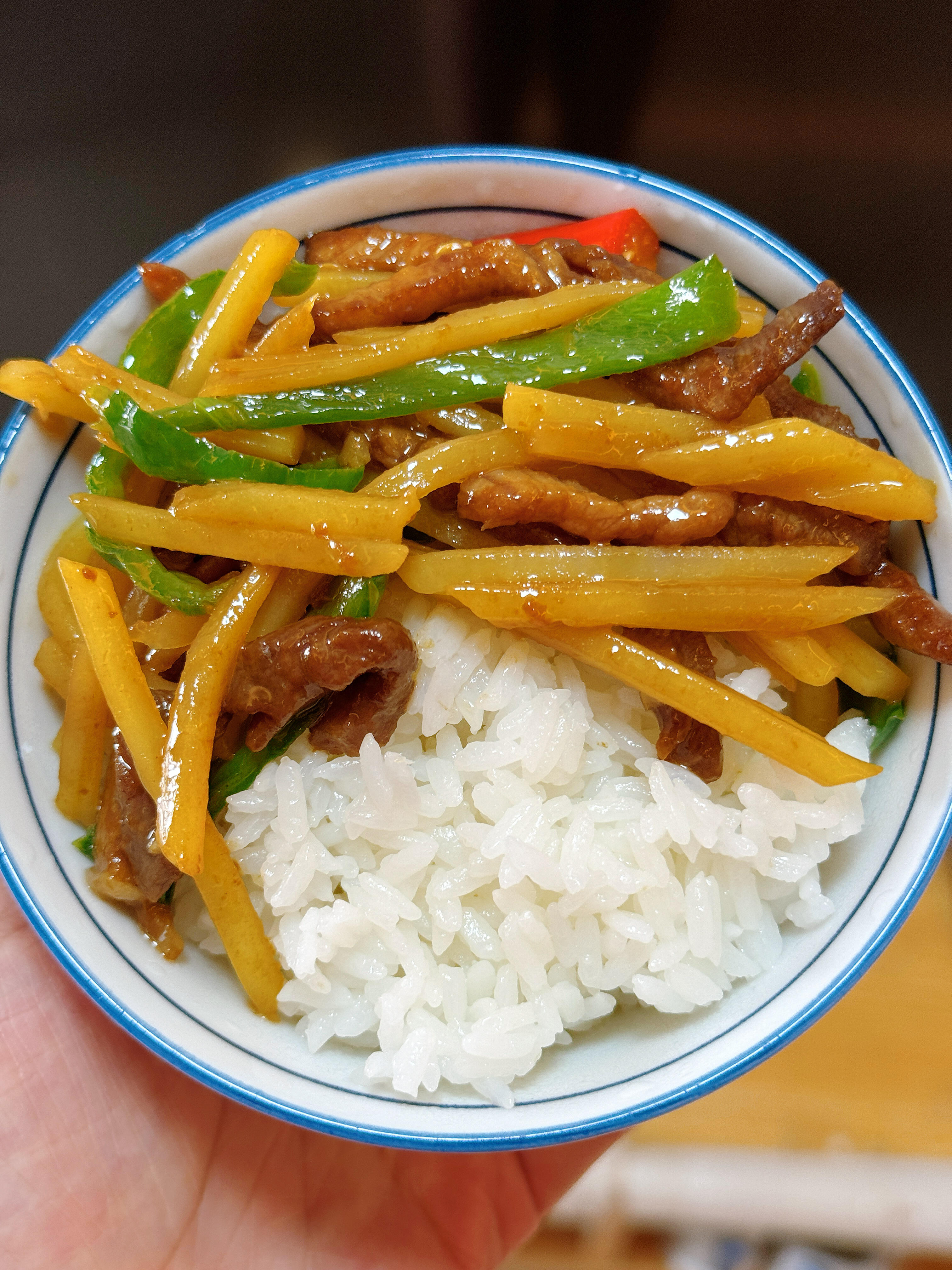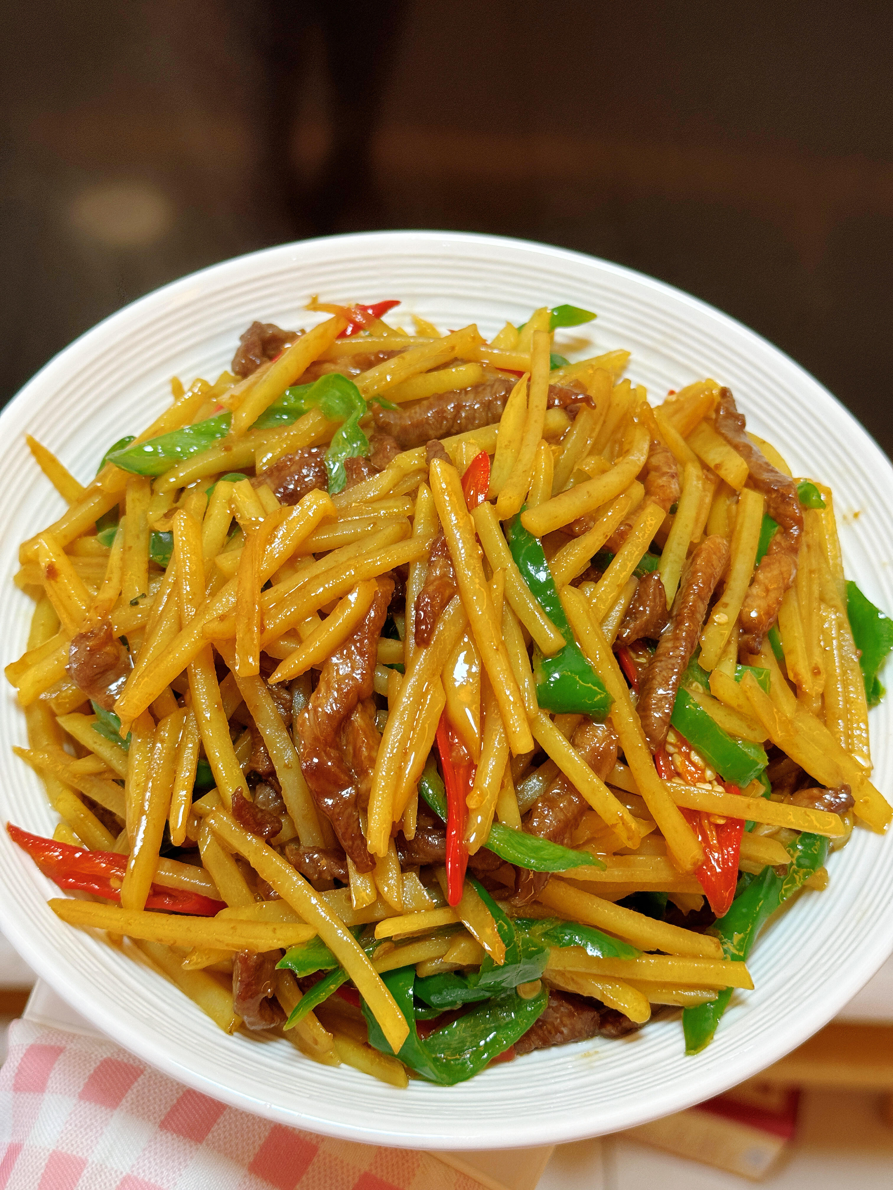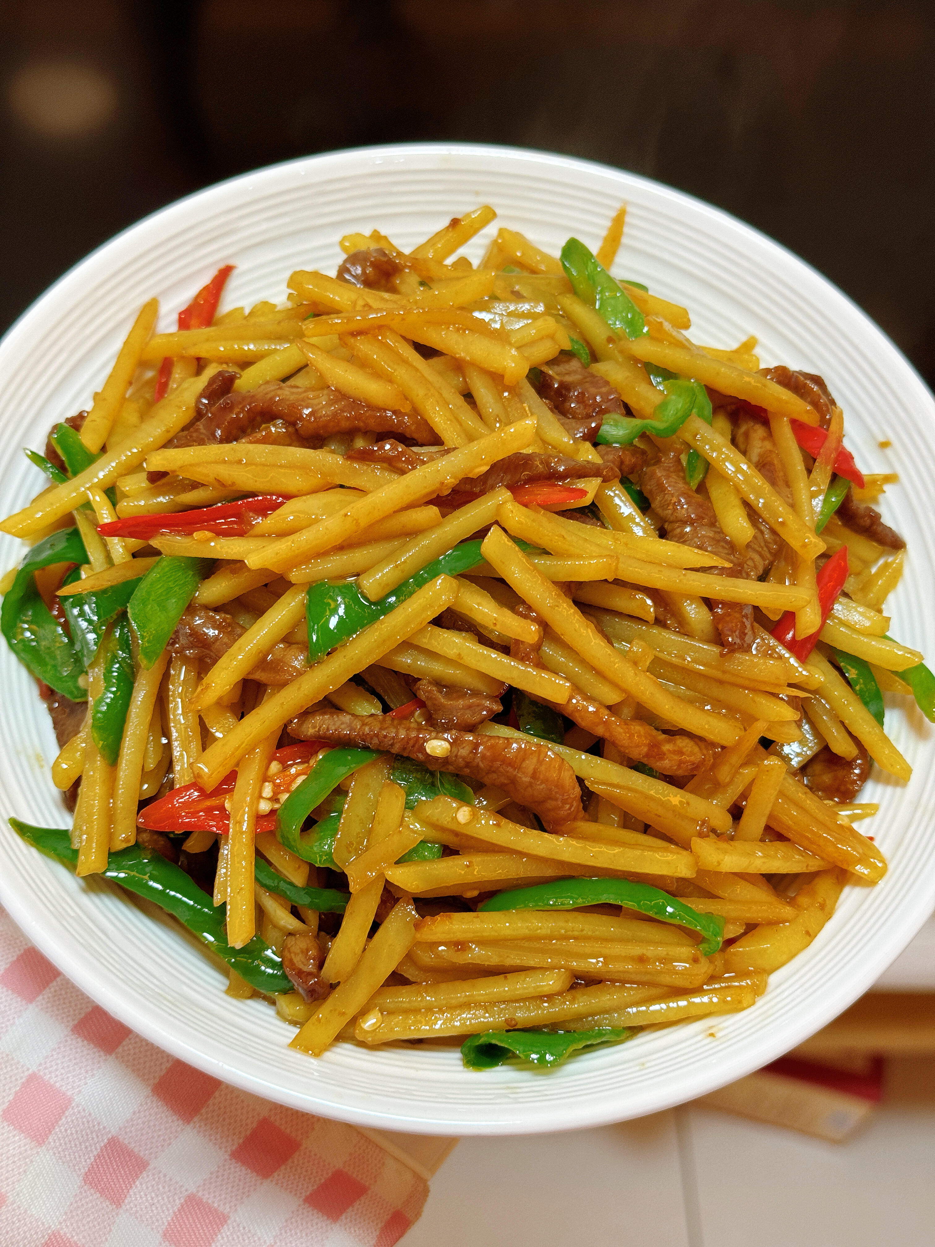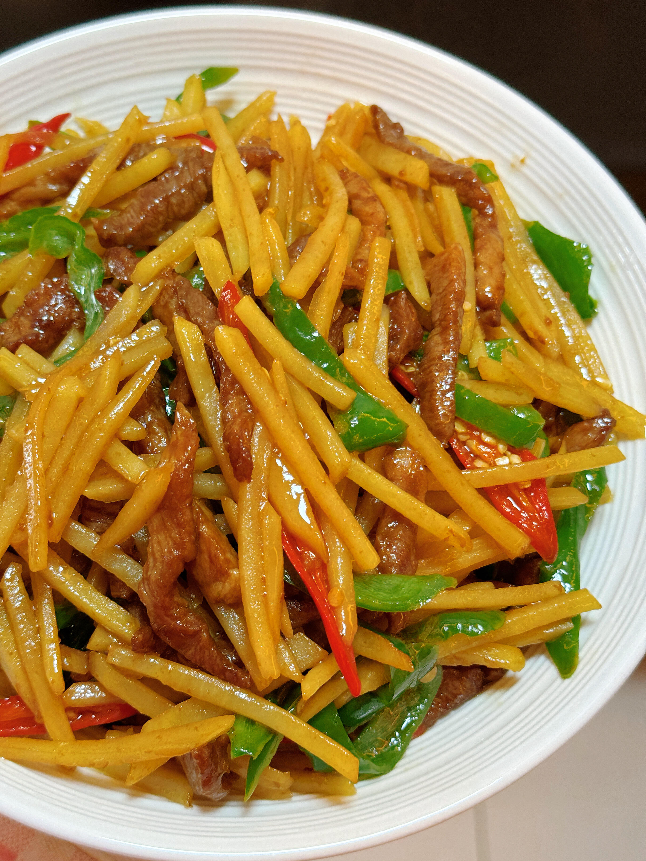 谁懂啊!这个土豆丝炒肉丝真的很好吃❗️ 这盘土豆丝炒肉丝真的是米饭杀手, 脆爽的土豆丝滑嫩的肉丝配上青红椒提味,咸香入味, 一口下去直接香迷糊了!做法巨简单, 厨房小白也能一次成功,我家每周都要做,每次都能多吃两碗饭! 做法分享给你们: 1️⃣猪肉切丝放入蒜瓣生抽淀粉少许老抽,抓匀腌制10分钟。土豆擦丝过一下水洗掉淀粉,青椒小米辣切丝放在土豆一起(辣椒切过之后不要过水) 2️⃣起锅烧油,油热后放入肉丝滑散,肉丝变色后放入辣椒丝土豆丝,加盐调味,炒匀。 放入生抽和鸡精再次爆炒均匀。土豆丝熟了即可出锅! 从土豆丝下锅开始算,全程大概炒了三分钟, 总之喜欢脆点的就少炒一会,喜欢软面一点的就多炒一会儿。 答应我,一定要试试这个做法,超下饭拯救没胃口, 肉丝辣椒丝土豆丝一起搭配鲜香味美, 真的好吃!厨房小白都能做出拿手美味