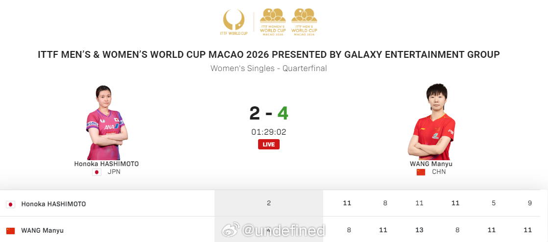 【世界杯王曼昱4-2桥本帆乃香晋级四强】王曼昱vs桥本帆乃香澳门世界杯20262026澳门乒乓球世界杯 4月4日澳门,女子乒乓球世界杯1/4决赛,王曼昱4-2(8-11/11-8/13-11/8-11/11-5/11-9)击败日本桥本帆乃香,晋级四强,半决赛将对阵韩国申裕彬。