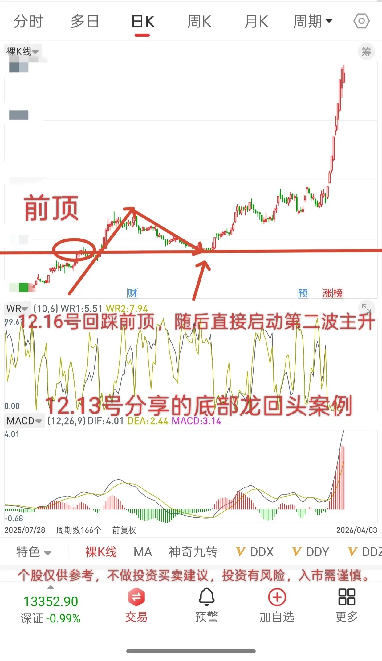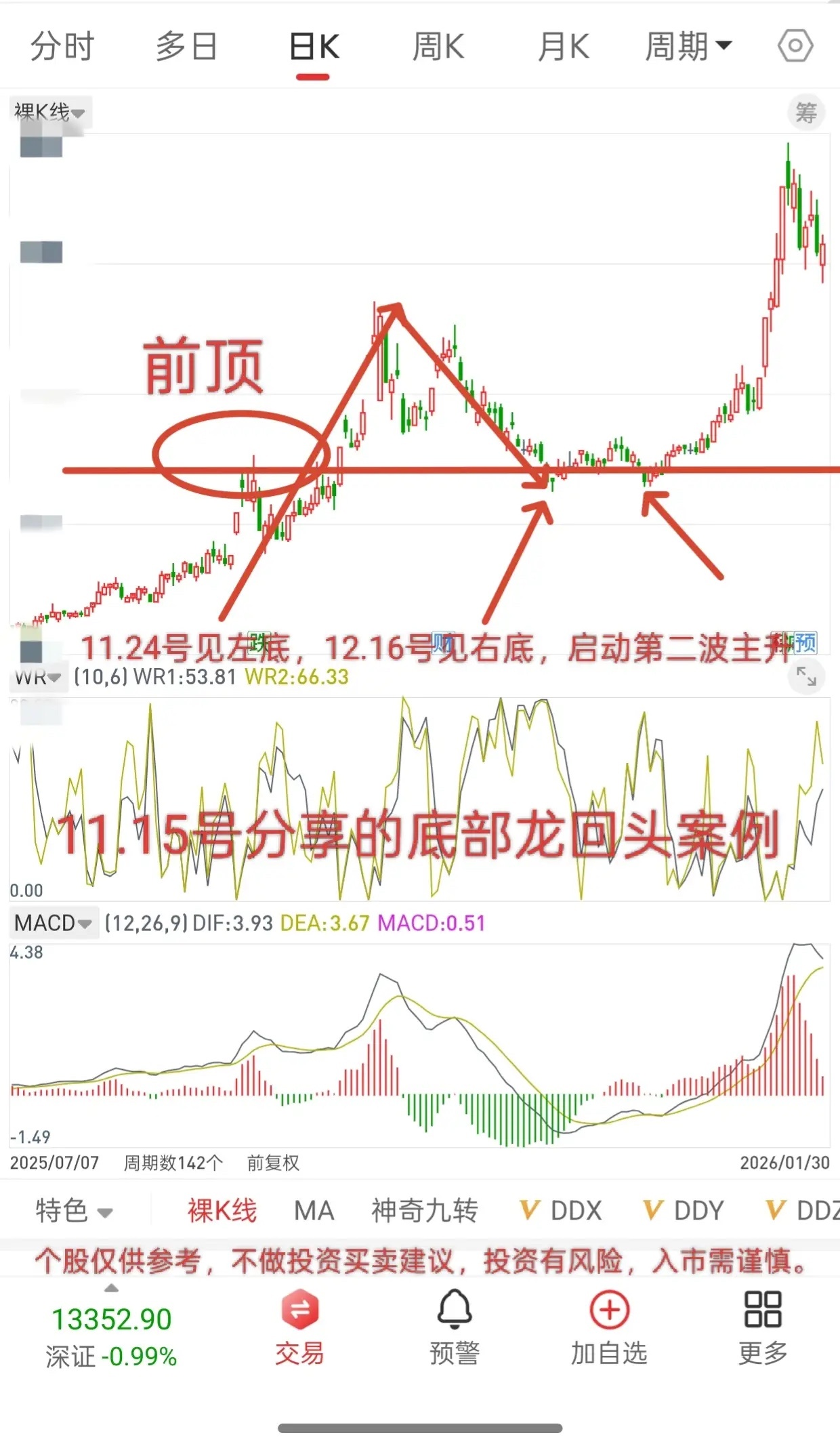 去年11.24-12.16,大盘产生左底和右底,但是这期间产生很多底部龙回头,我昨晚说分三种,第一种是11.24号见左底,然后没有跟随大盘筑双底,直接率先启动第二波主升;第二种是11.24见左底,12.16见右底,然后启动第二波主升,跟大盘一致;第三种是12.16号见底,然后直接启动第二波主升,(对应下图)。