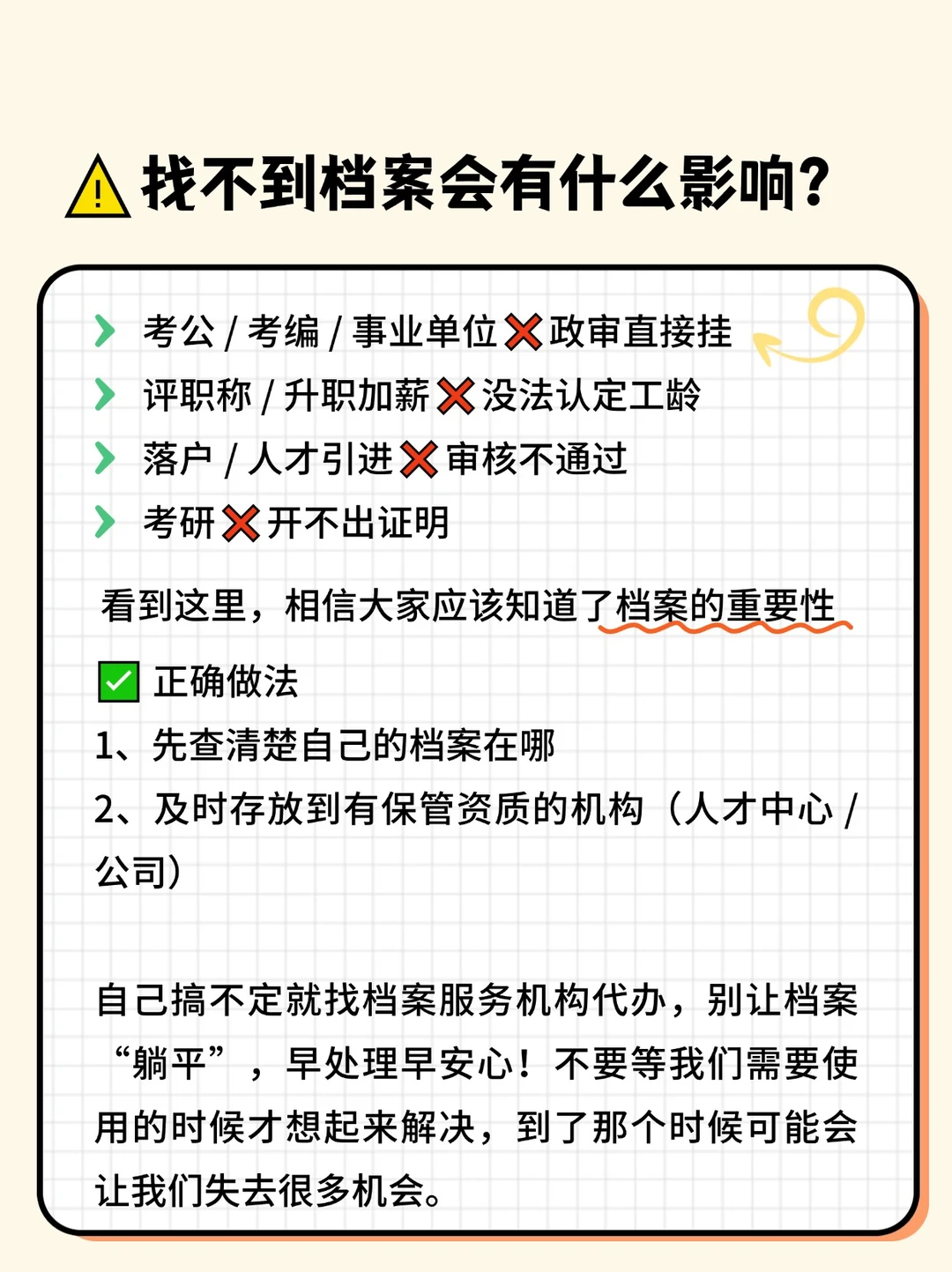 自己搞不定就找档案服务机构代办,别让档案 “躺平”,早处理早安心!不要等我们需要使用的时候才想起来解决,到了那个时候可能会让我们失去很多机会。