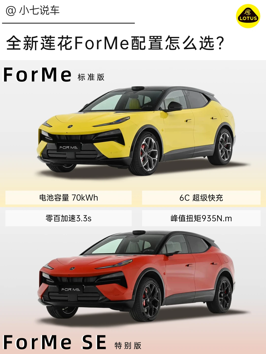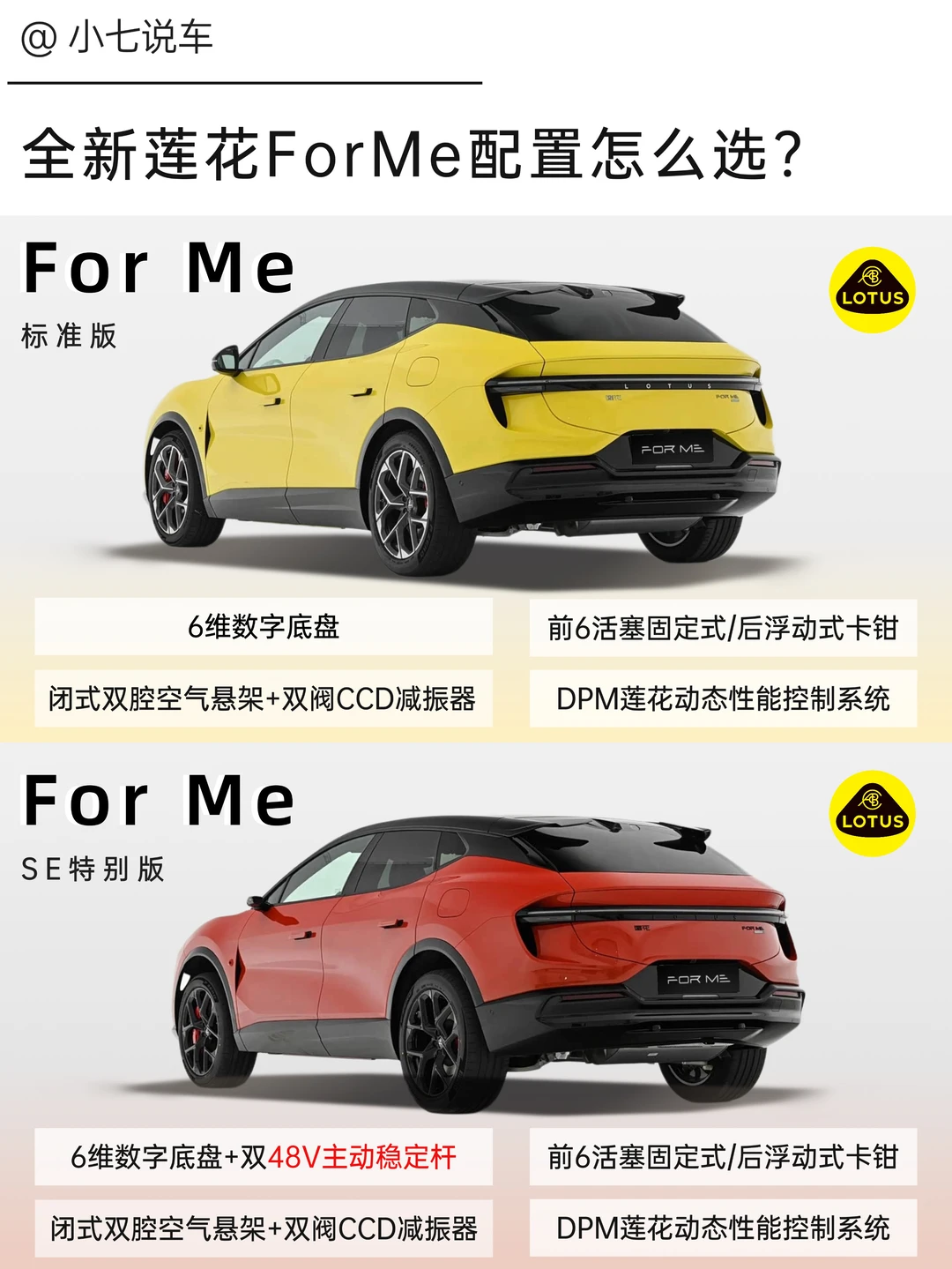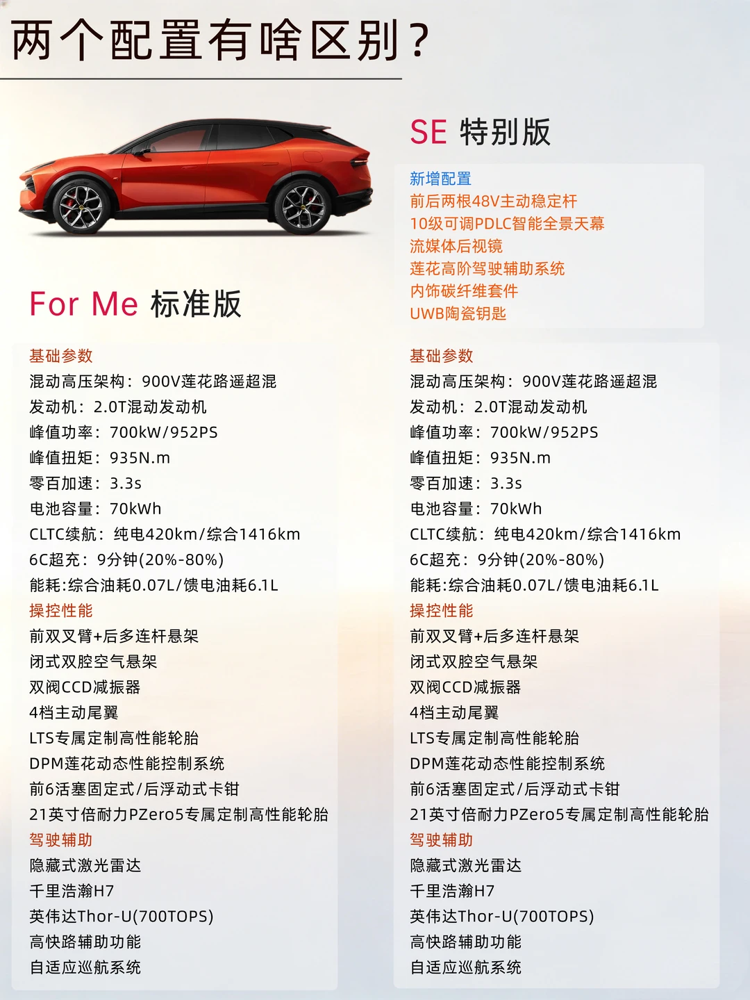 提到超跑,大家往往想到直线加速、极致爆发、硬核底盘调校,却很少与家用舒适挂钩。 这一次,全新莲花For Me将超跑灵魂,与SUV完美融合。 💰售价仅50.8万起,让你不必在激情与实用间妥协,真正做到:不做选择,全都要。 标准版和SE特别版,两款本无优劣,只为不同生活方式,提供最合适的答案。 👉🏻怎么选 先看相同点 ⭐️超混性能 这是一套性能与续航兼顾、全程稳定不打折的高效超混系统。 🔺900V高压平台搭配70kWh大容量电池,CLTC综合续航1416km;6C超级快充,9min补能20%-80%迅捷高效,长途出行无焦虑; 🔺952匹马力,零百3.3秒,馈电依旧稳定3.5秒,性能全程在线。 ⭐️超美设计 🔺5米1车身做出低趴贴地气场,整台车像穿高定西装的“西装暴徒”; 🔺大五座+超大后备箱,全家露营出游轻松拿捏! 🔺搭配8条真风道、同级唯一主动尾翼+隐藏式激光雷达,颜值拉满,还大幅提升行驶稳定性 ⭐️超驾控 🔺搭载Brembo前六活塞制动卡钳,百公里制动仅33.9米,倍耐力LTS专属定制高性能轮胎,强劲抓地力更稳更安心; 🔺双腔空气悬架+双阀CCD减震,舒适与运动无缝切换、从容适配; 🔺全系标配6维数字底盘,每一次转向反馈都干脆利落、精准随心。 - 两款区别 ✅For Me标准版 经常出游、看重超跑个性与驾驶质感,标准版已媲美很多燃油超跑顶配;五座大空间、100%软质真皮+KEF音响、千里浩瀚H7智驾,日常用车全覆盖 ✅SE特别版 🔺驾控拉满:前后48V主动稳定杆,跑山过弯侧倾更小,贴地感更强,带来赛道级稳控 🔺终身免费高阶智驾,长途高速有效缓解驾驶疲劳 🔺座舱升级:PDLC调光天幕+碳纤维内饰+陶瓷钥匙,仪式感拉满,追求极致性能也注重细节体验,适配热爱驾控的各类场景。 - 👀总结一下 要超跑质感、家用稳妥,直接选标准版,拥有与SE相同核心性能,纯粹超跑驾控底子,家用不妥协;🔺要极致操控、山野户外、全维格调,加5万冲SE,整车质感与体验再攀新高。 👌🏻既怀揣超跑级精准操控,又不辜负乘坐舒适;既能纵情山道劈弯,亦能容纳生活的从容静好。 莲花For Me,做到了。