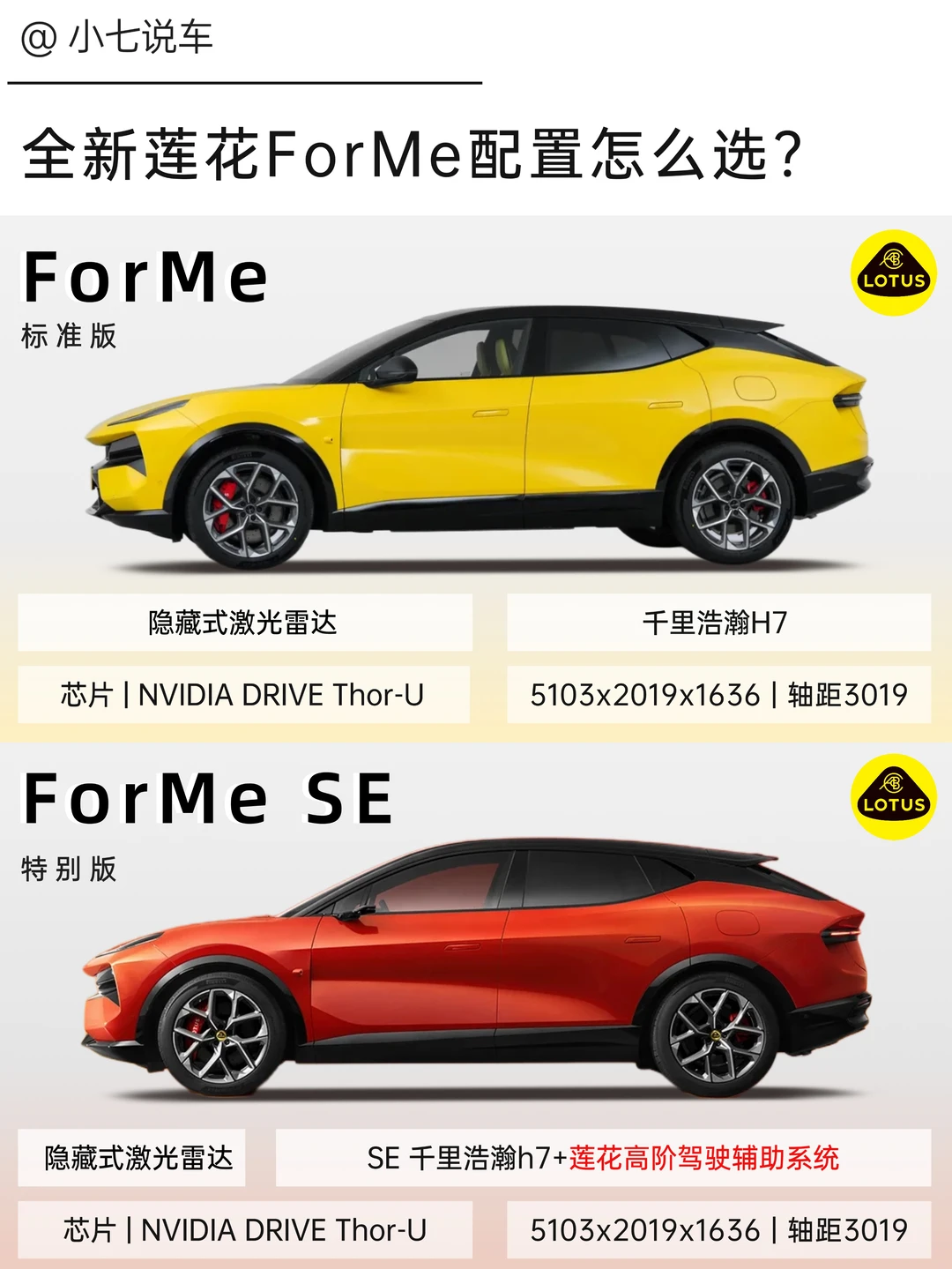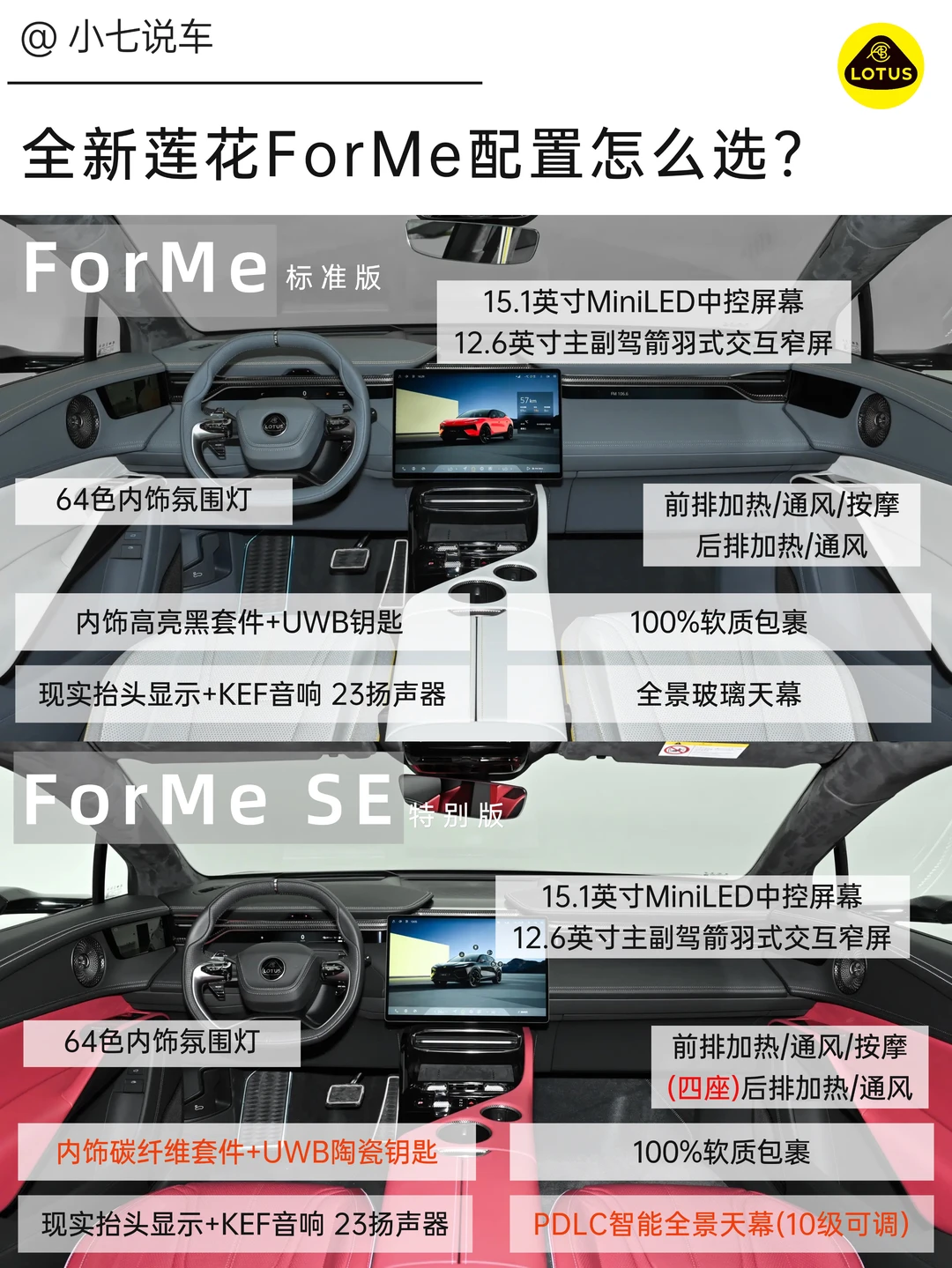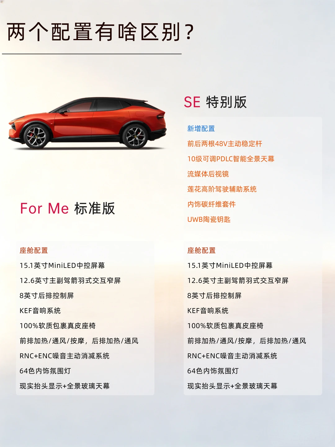 提到超跑,大家往往想到直线加速、极致爆发、硬核底盘调校,却很少与家用舒适挂钩。 这一次,全新莲花For Me将超跑灵魂,与SUV完美融合。 💰售价仅50.8万起,让你不必在激情与实用间妥协,真正做到:不做选择,全都要。 标准版和SE特别版,两款本无优劣,只为不同生活方式,提供最合适的答案。 👉🏻怎么选 先看相同点 ⭐️超混性能 这是一套性能与续航兼顾、全程稳定不打折的高效超混系统。 🔺900V高压平台搭配70kWh大容量电池,CLTC综合续航1416km;6C超级快充,9min补能20%-80%迅捷高效,长途出行无焦虑; 🔺952匹马力,零百3.3秒,馈电依旧稳定3.5秒,性能全程在线。 ⭐️超美设计 🔺5米1车身做出低趴贴地气场,整台车像穿高定西装的“西装暴徒”; 🔺大五座+超大后备箱,全家露营出游轻松拿捏! 🔺搭配8条真风道、同级唯一主动尾翼+隐藏式激光雷达,颜值拉满,还大幅提升行驶稳定性 ⭐️超驾控 🔺搭载Brembo前六活塞制动卡钳,百公里制动仅33.9米,倍耐力LTS专属定制高性能轮胎,强劲抓地力更稳更安心; 🔺双腔空气悬架+双阀CCD减震,舒适与运动无缝切换、从容适配; 🔺全系标配6维数字底盘,每一次转向反馈都干脆利落、精准随心。 - 两款区别 ✅For Me标准版 经常出游、看重超跑个性与驾驶质感,标准版已媲美很多燃油超跑顶配;五座大空间、100%软质真皮+KEF音响、千里浩瀚H7智驾,日常用车全覆盖 ✅SE特别版 🔺驾控拉满:前后48V主动稳定杆,跑山过弯侧倾更小,贴地感更强,带来赛道级稳控 🔺终身免费高阶智驾,长途高速有效缓解驾驶疲劳 🔺座舱升级:PDLC调光天幕+碳纤维内饰+陶瓷钥匙,仪式感拉满,追求极致性能也注重细节体验,适配热爱驾控的各类场景。 - 👀总结一下 要超跑质感、家用稳妥,直接选标准版,拥有与SE相同核心性能,纯粹超跑驾控底子,家用不妥协;🔺要极致操控、山野户外、全维格调,加5万冲SE,整车质感与体验再攀新高。 👌🏻既怀揣超跑级精准操控,又不辜负乘坐舒适;既能纵情山道劈弯,亦能容纳生活的从容静好。 莲花For Me,做到了。