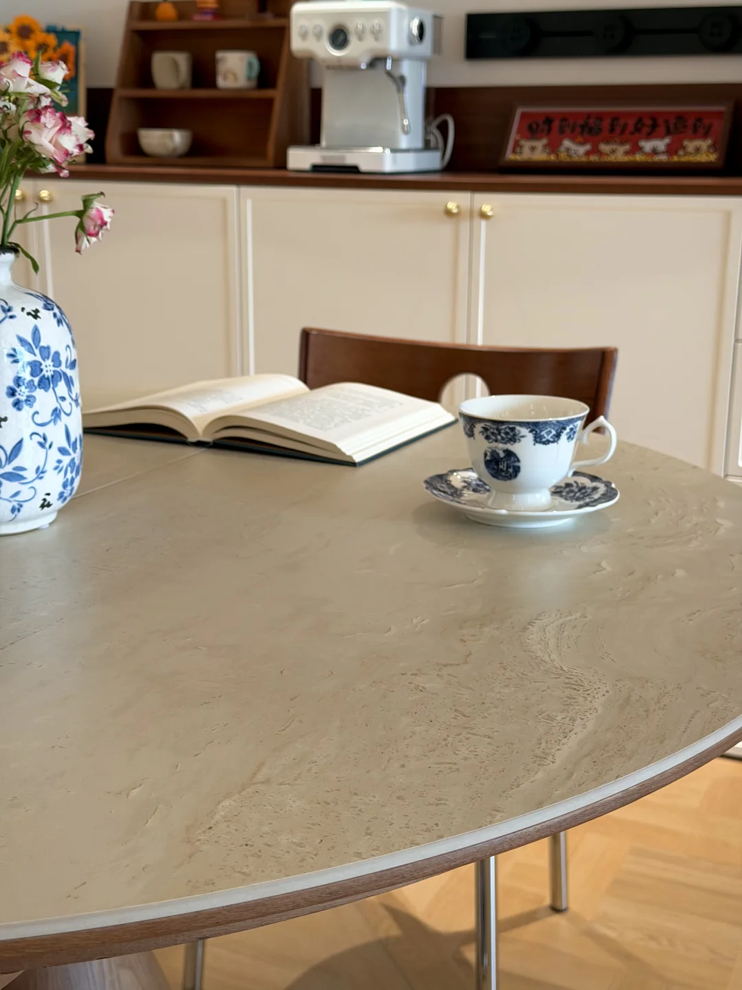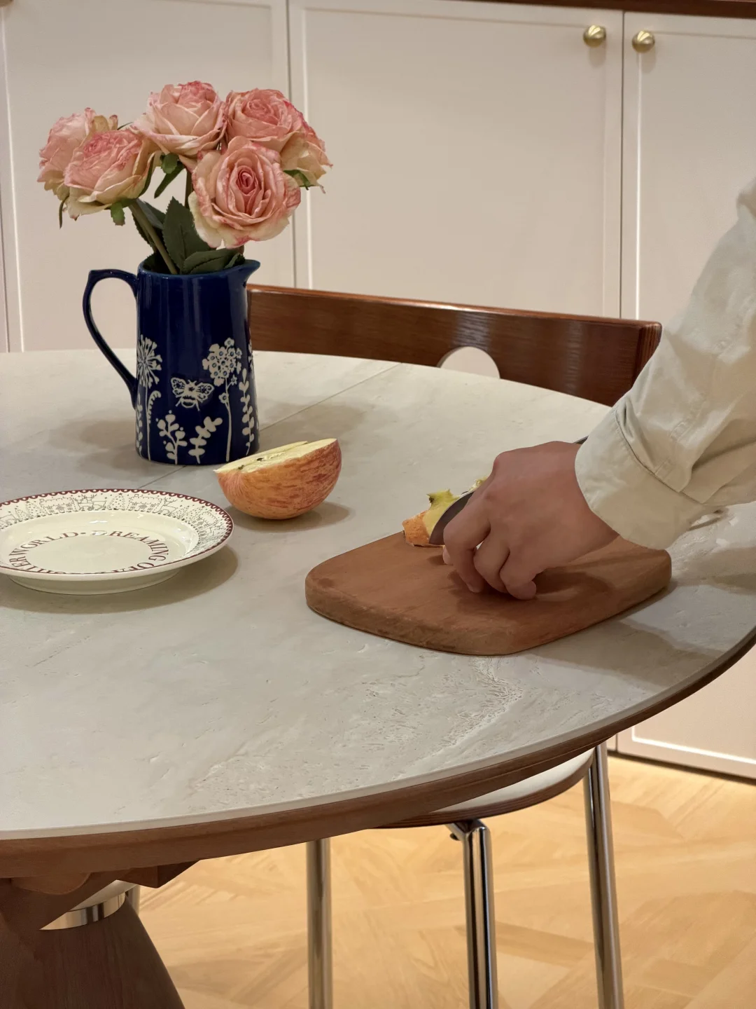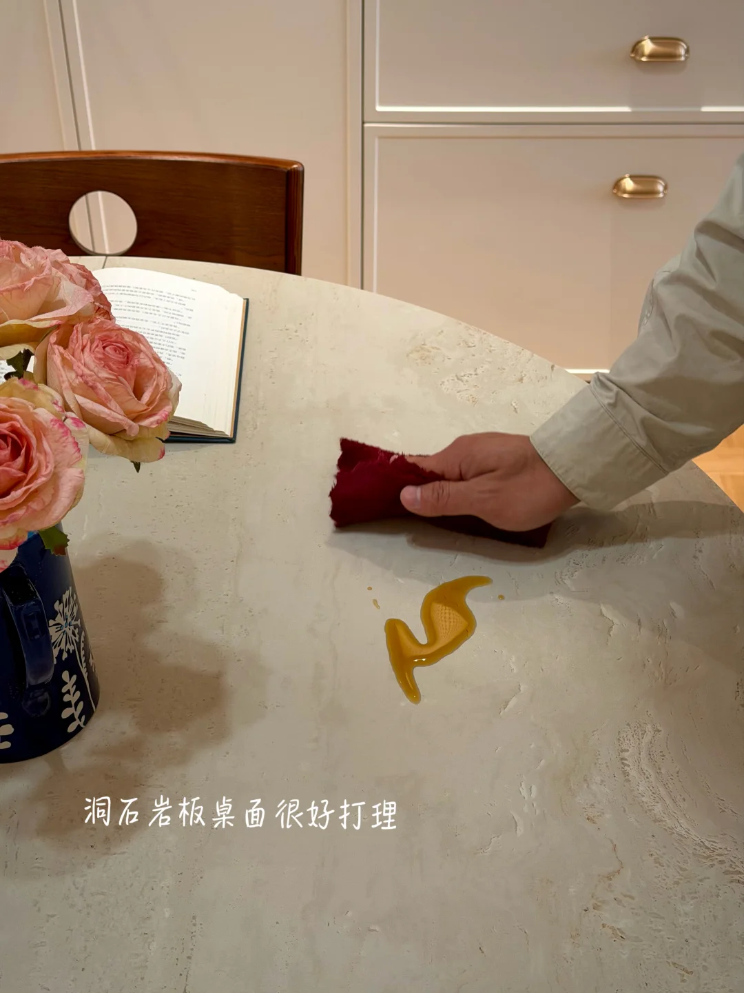 餐桌桌面是洞石岩板材质的,耐刮蹭还好打理!像日常直接在上面切个水果也完全没问题,日常油污擦一擦就干净了