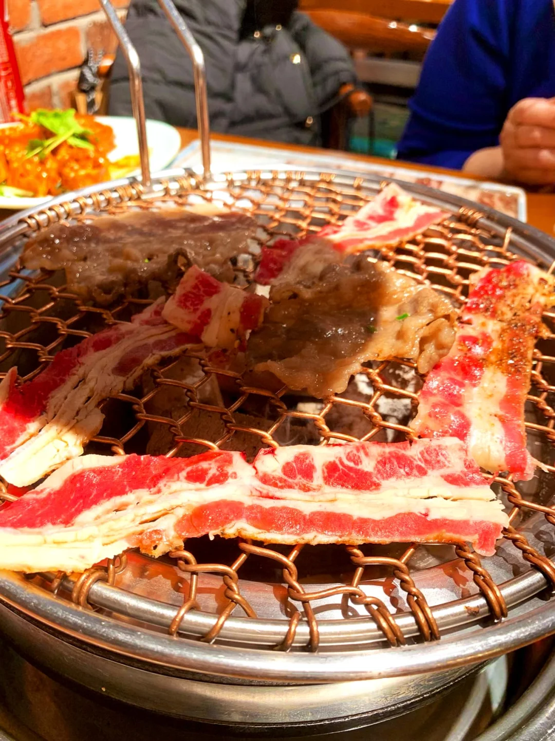• 厚切猪五花:烤得边焦里嫩,裹上蒜片、蘸满干碟,一口下去,碳水快乐直接拉满!