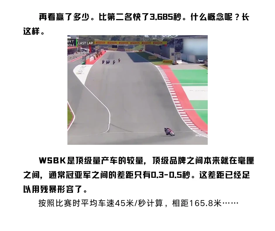 WSBK是顶级量产车的较量,本就毫厘之间,通常冠亚军之间的差距只有0.3-0.5秒。这已经足以用残暴形容了。