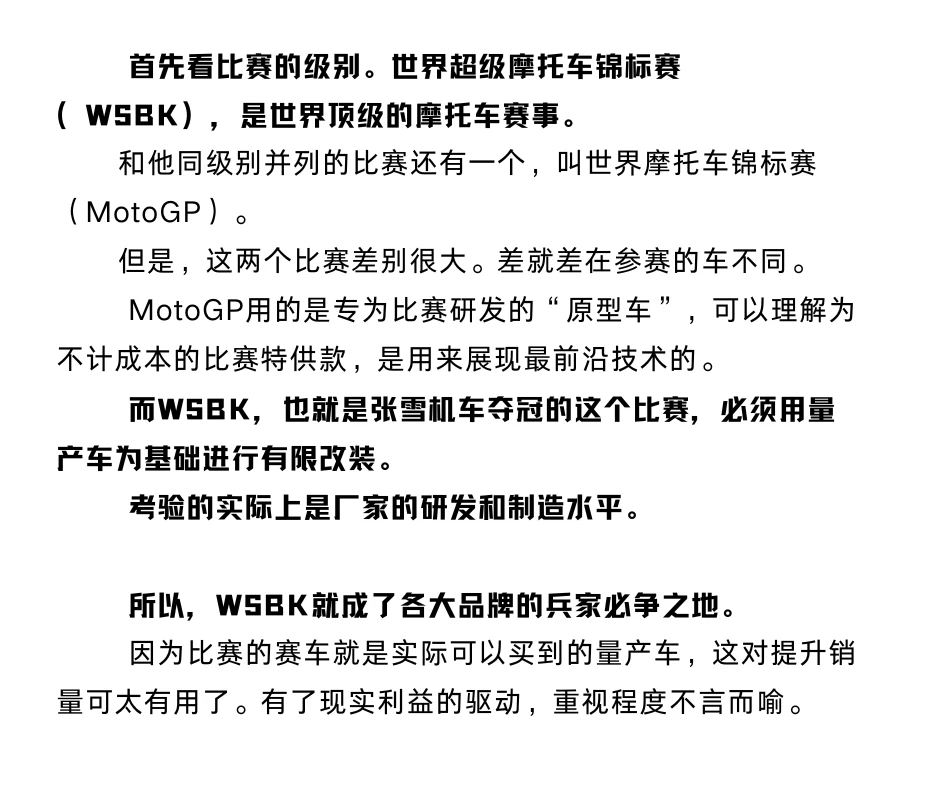 而WSBK,也就是夺冠的这个,必须用量产车为基础进行有限改装。考验厂家的研发和制造水平。