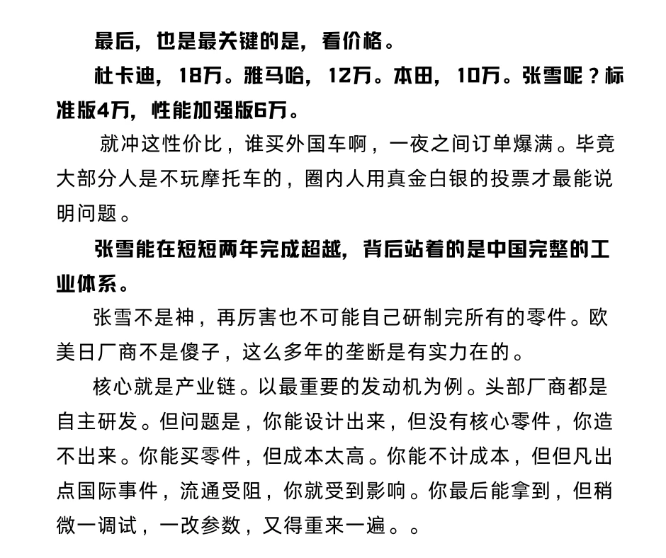 杜卡迪,18万。雅马哈,12万。本田,10万。张雪呢?标准版4万,加强版6万。一夜之间订单爆满。毕竟大部分人是不玩摩托车的,圈内人用真金白银的投票最说明问题。
