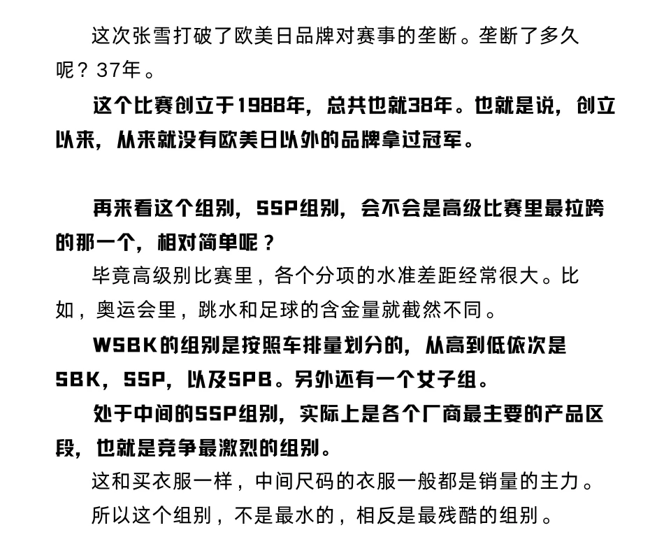 这次张雪打破了欧美日品牌对赛事37年垄断。要知道,这个比赛总共也就38年。。