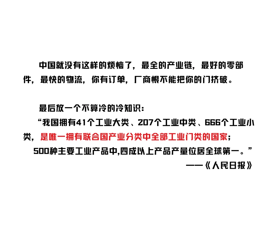 最后放一个不算冷的冷知识:“我国拥有41个工业大类、207个工业中类、666个工业小类,是唯一拥有联合国产业分类中全部工业门类的国家;500种主要工业产品中,四成以上产品产量位居全球第一。”——《人民日报》