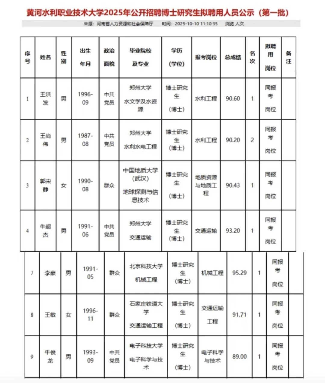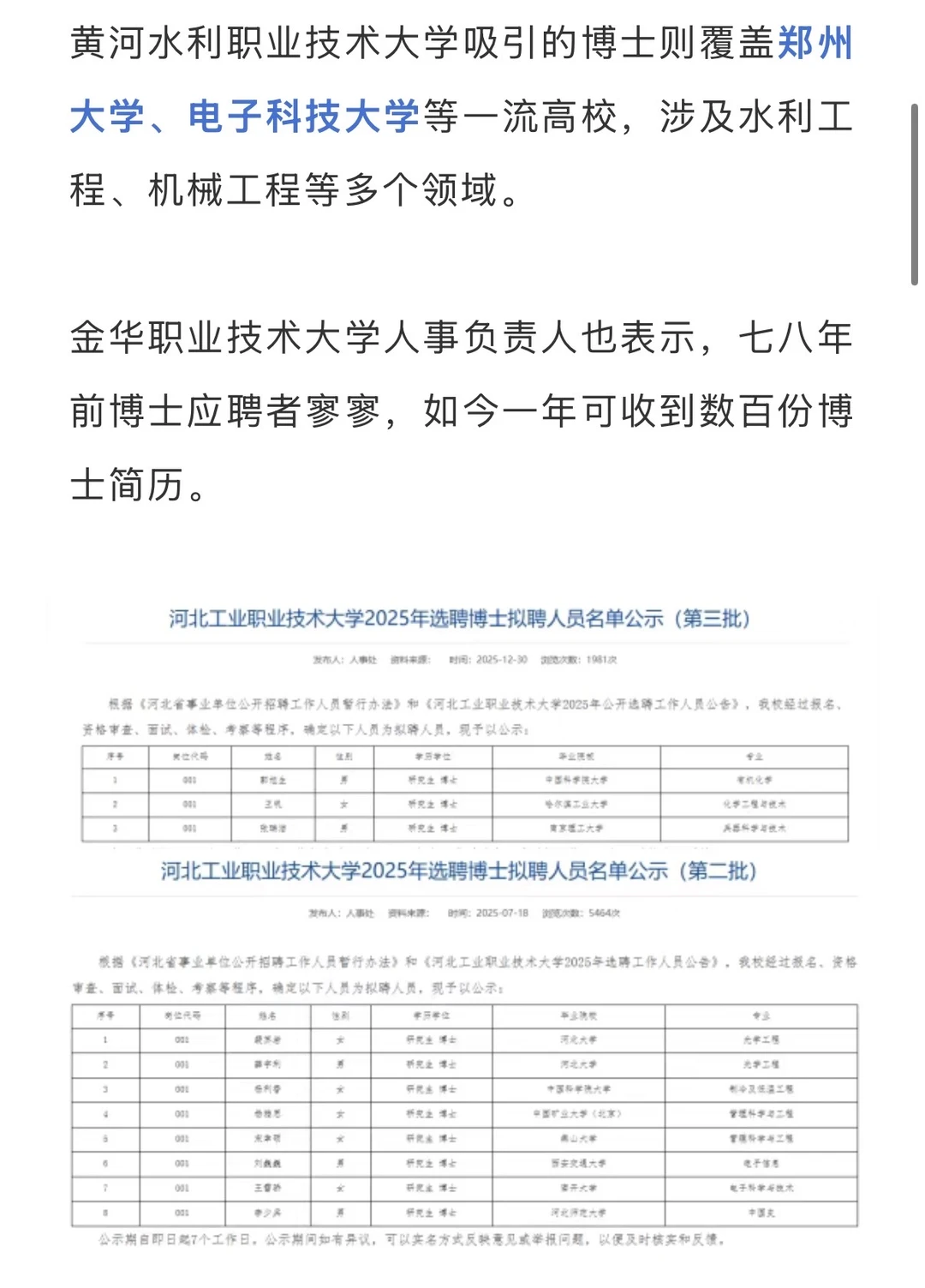 河北工业职业技术大学2025年拟聘博士中,不乏中国科学院大学、哈尔滨工业大学等顶尖高校毕业生。