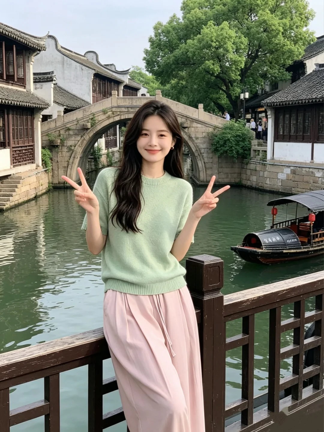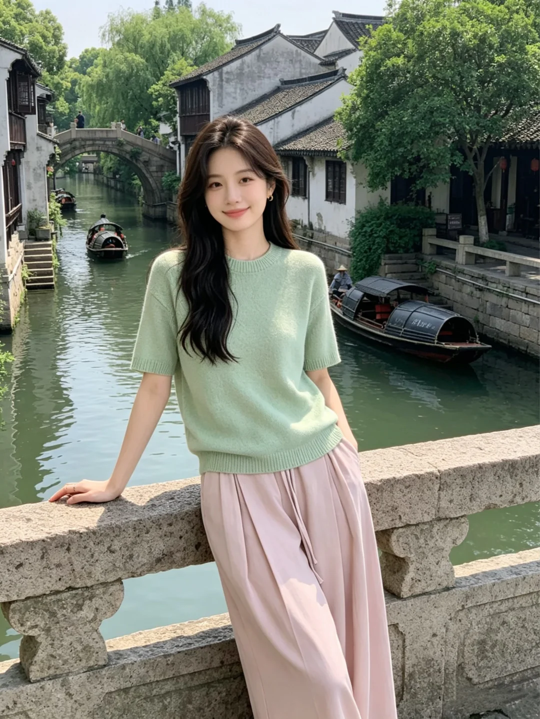 温柔穿搭风 薄荷漫波绿 治愈绿色系 清新色彩搭配 清新绿色系 粉色裤子 大自然色系 小清新穿搭 针织短袖 糖果色穿搭