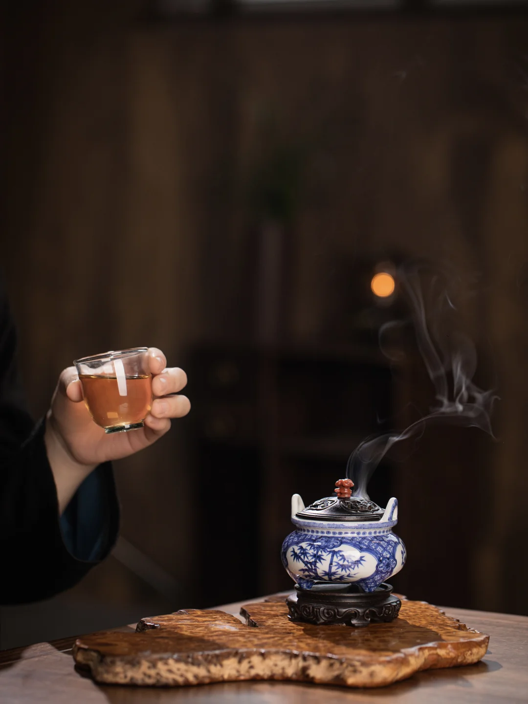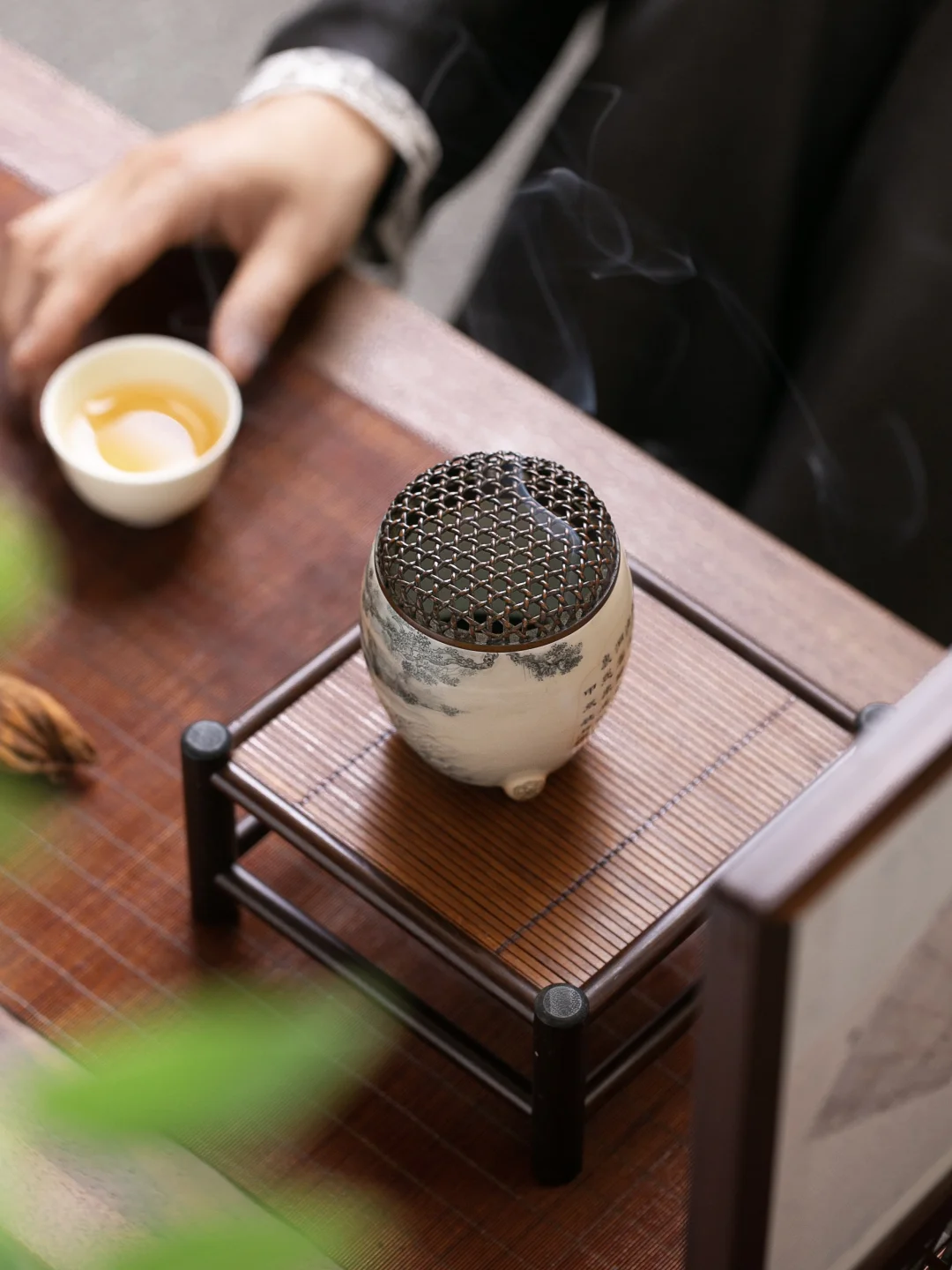 腰鼓形的炉身,铜网盖手工编织。点一片香,烟从网眼里漫出来,一缕一缕,像山间的雾。“林深见鹿”四个字在心头浮起,茶汤还在手里,心神已飘去那片深林。独饮的好处,就是可以随时神游。