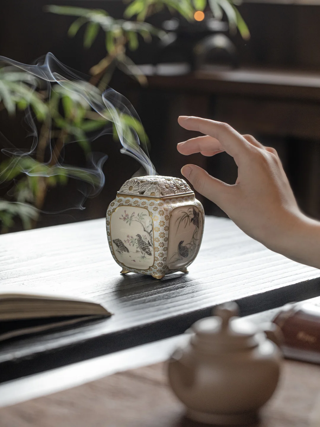 炉身开窗,窗里画着几只鹌鹑,或低头觅食,或回首顾盼,憨态可掬。错金银的雏菊在光下微微闪烁,添了几分田野间的生趣,却不显喧闹。茶喝到第三泡,看一看它们,心里便觉得踏实。