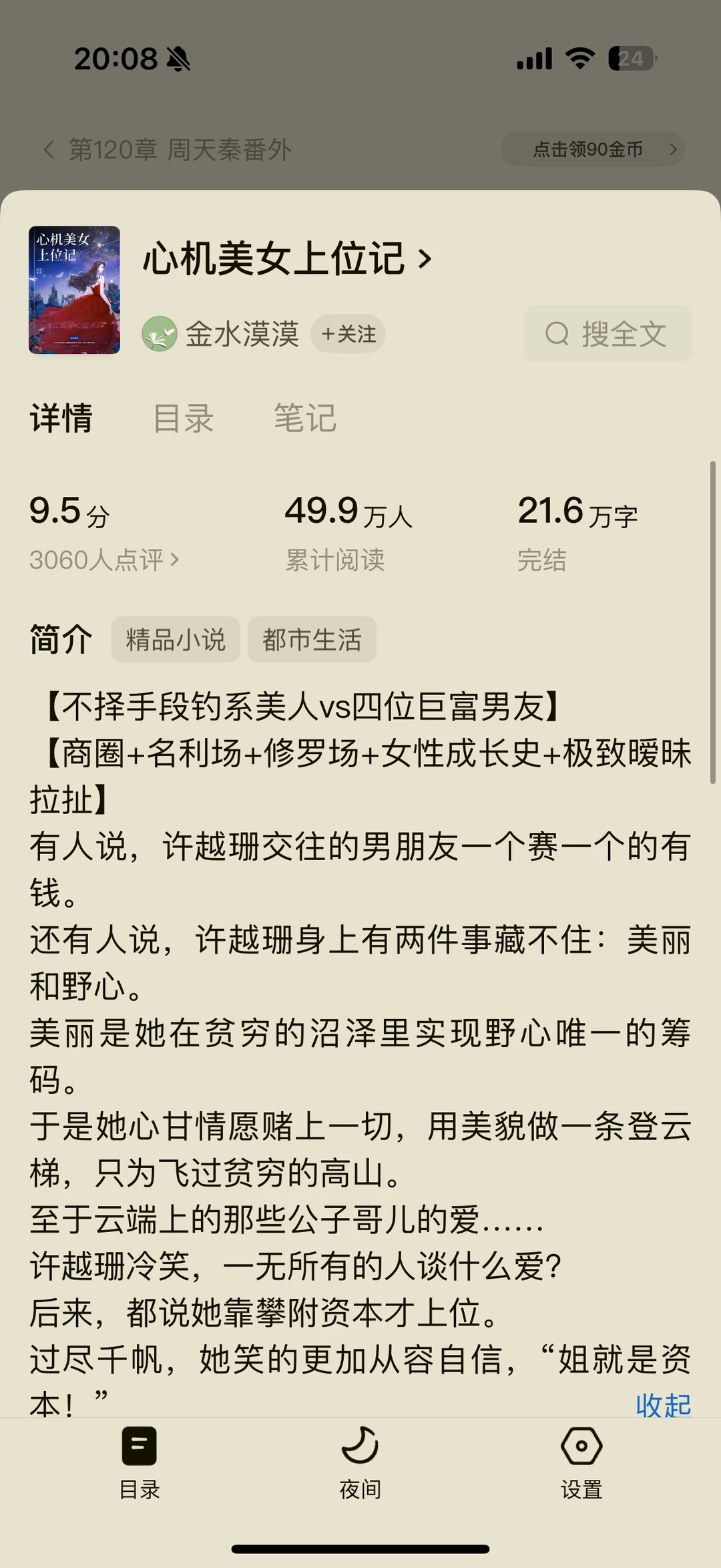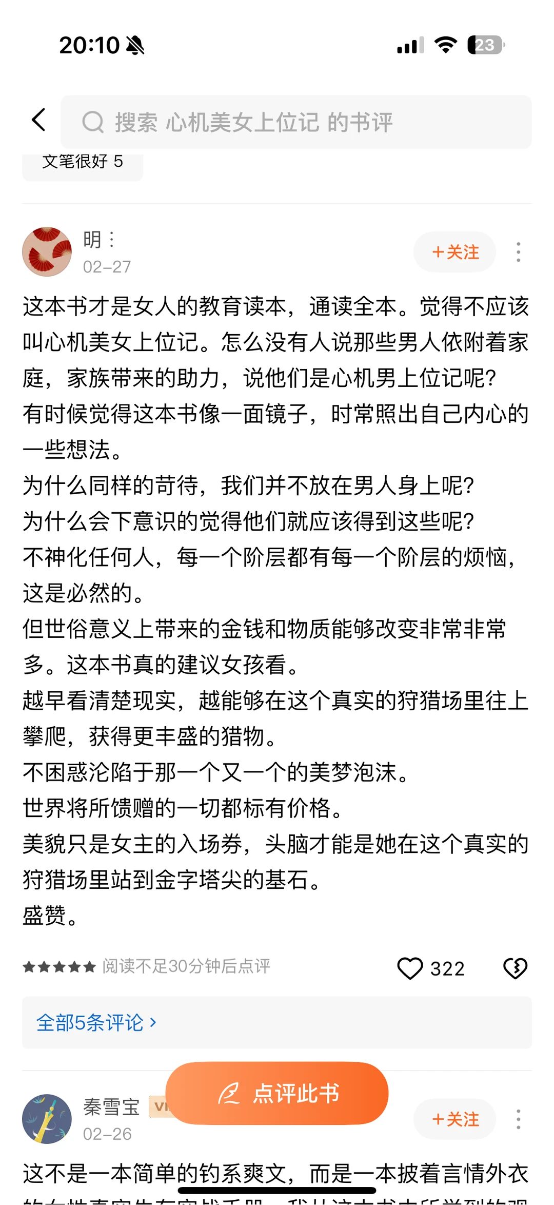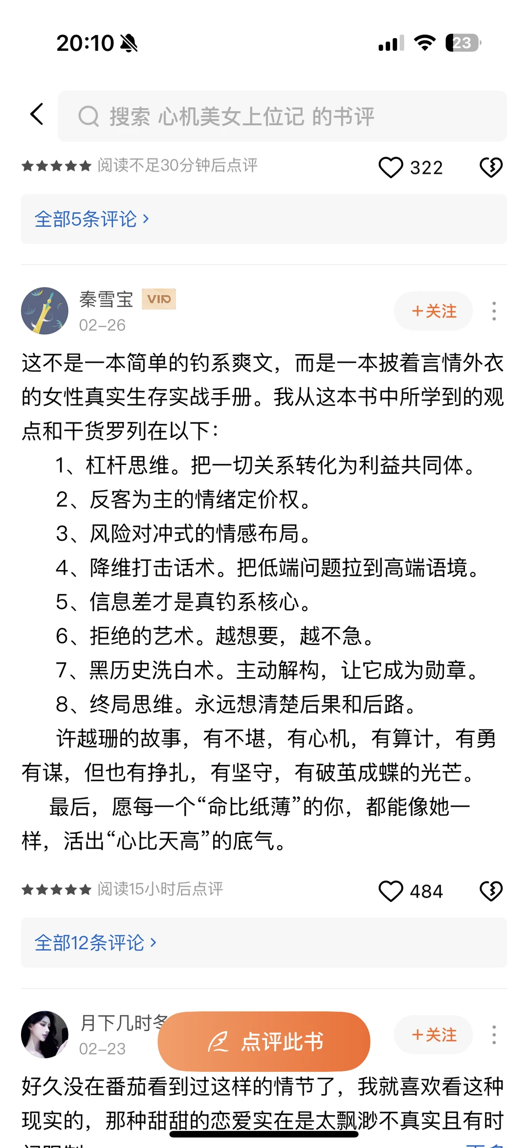 高智商女主,可以从一点点的细节当中联想全程,倒逼全过程。 可以看一下图二图三的评论,我真的非常建议大家来读一本,这本小说不像是一本言情小说,而是女主的智慧所在,面对别人的看法、反问如何回击,直视自己内心深处的欲望