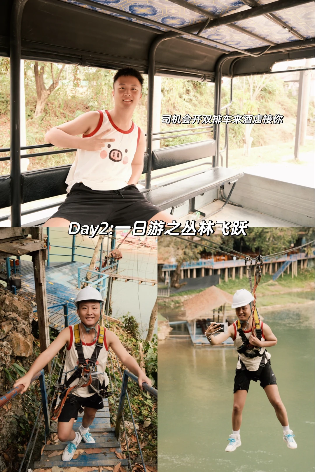 【Day2】一日团,各个旅行社价格和项目大差不差,可以选择:丛林飞跃+水上溶洞+水下溶洞+蓝色泻湖。4个项目左右会相对轻松一些,另外还有皮划艇蛮多人选,我们觉得和国内体验差不多就没去。傍晚回到市区,报名第三天的滑翔伞和热气球🪂