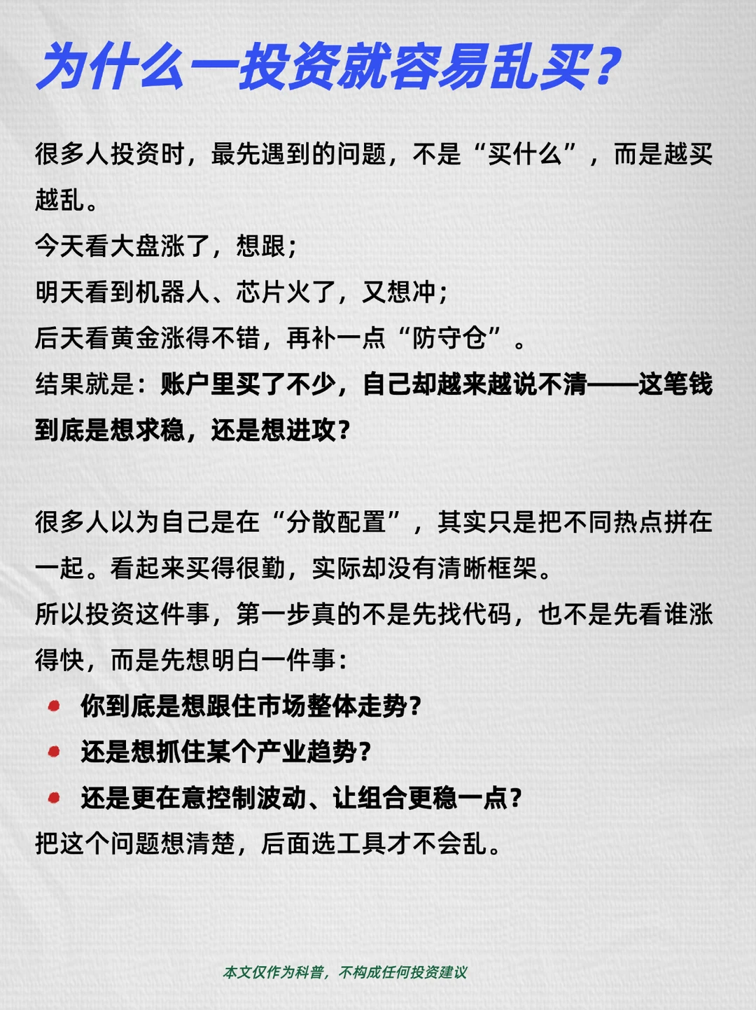 很多人投资时,最先遇到的问题,不是“买什么”,而是越买越乱。今天看大盘涨了,想跟;明天看到机器人芯片火了,又想冲;