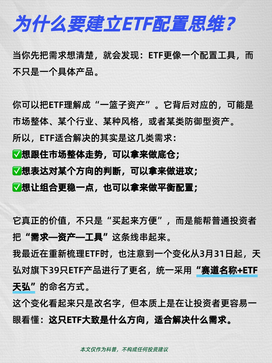 它真正的价值,不只是“买起来方便”,而是能帮普通投资者把“需求—资产—工具”这条线串起来。我最近在重新梳理ETF时,也注意到一个变化从3月31日起,天弘对旗下39只ETF产品进行了更名,统一采用“赛道名称+ETF天弘”的命名方式。