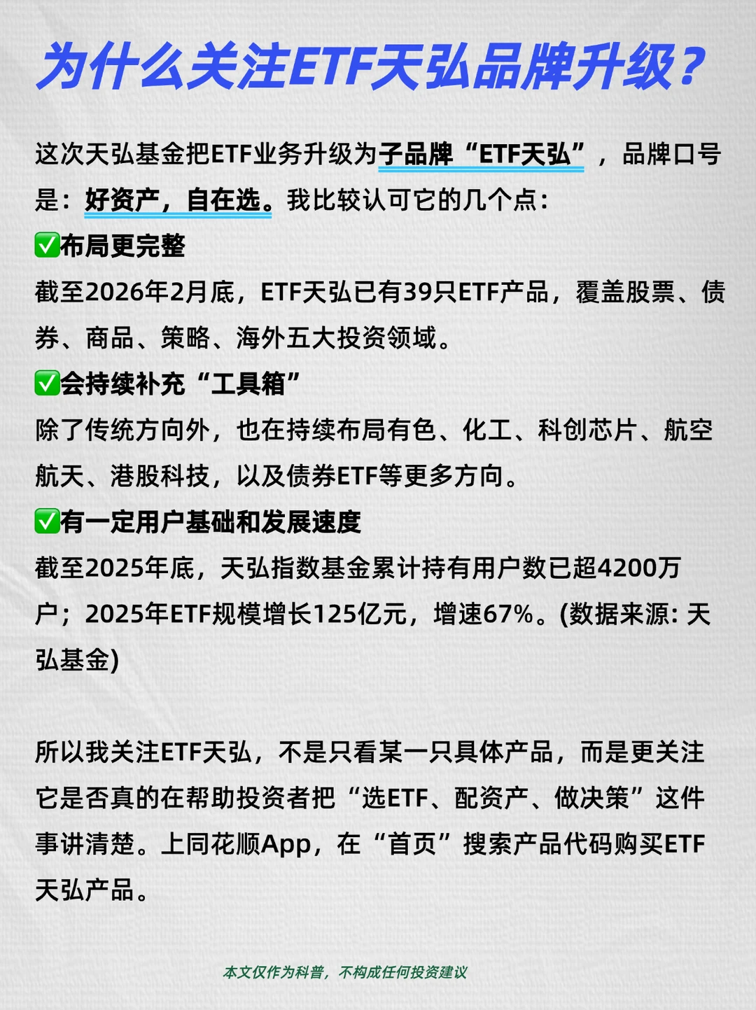 ✅有一定用户基础和发展速度截至2025年底,天弘指数基金累计持有用户数已超4200万户;2025年ETF规模增长125亿元,增速67%。(数据来源: 天弘基金)