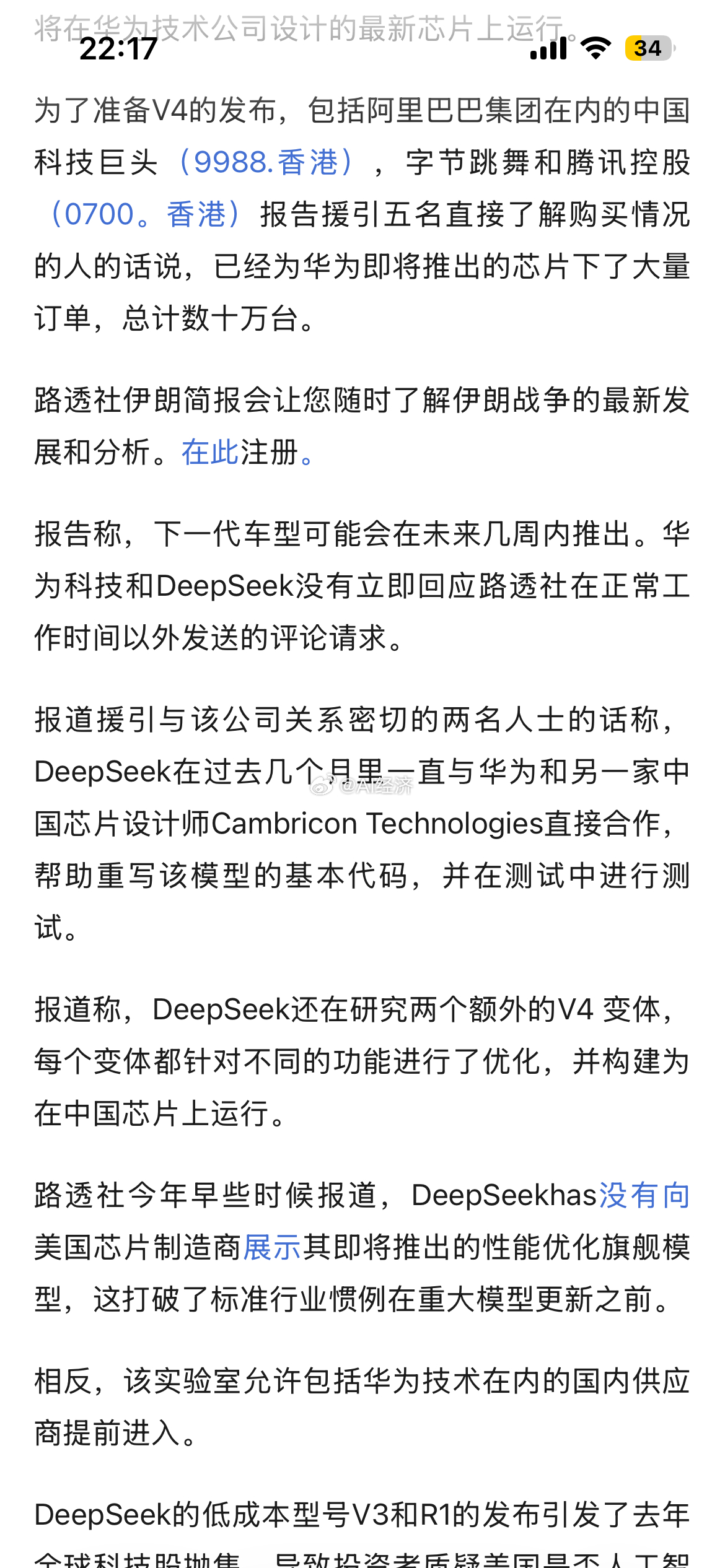 路透社:据The Information报道,DeepSeek的V4型号将在华为
