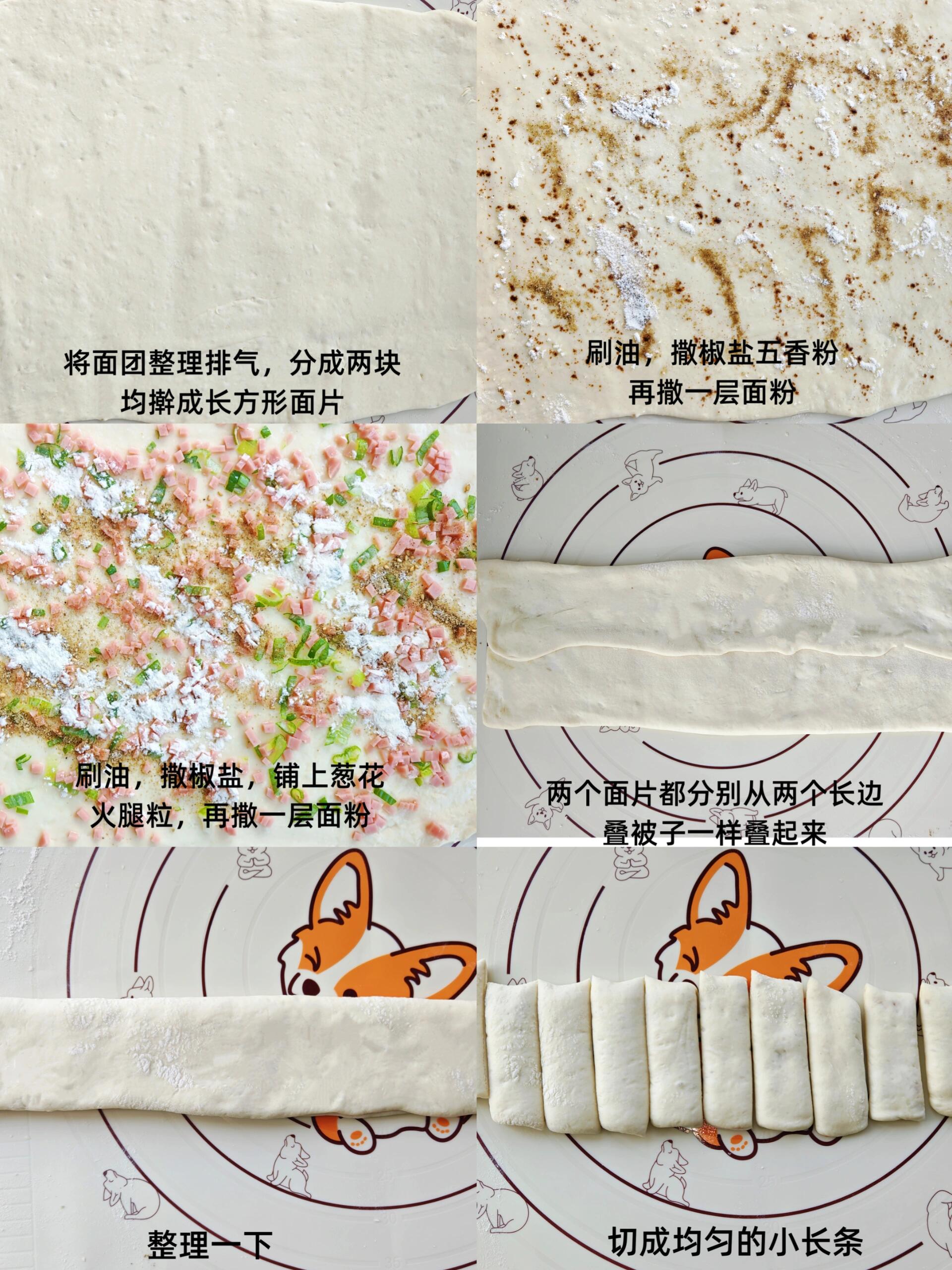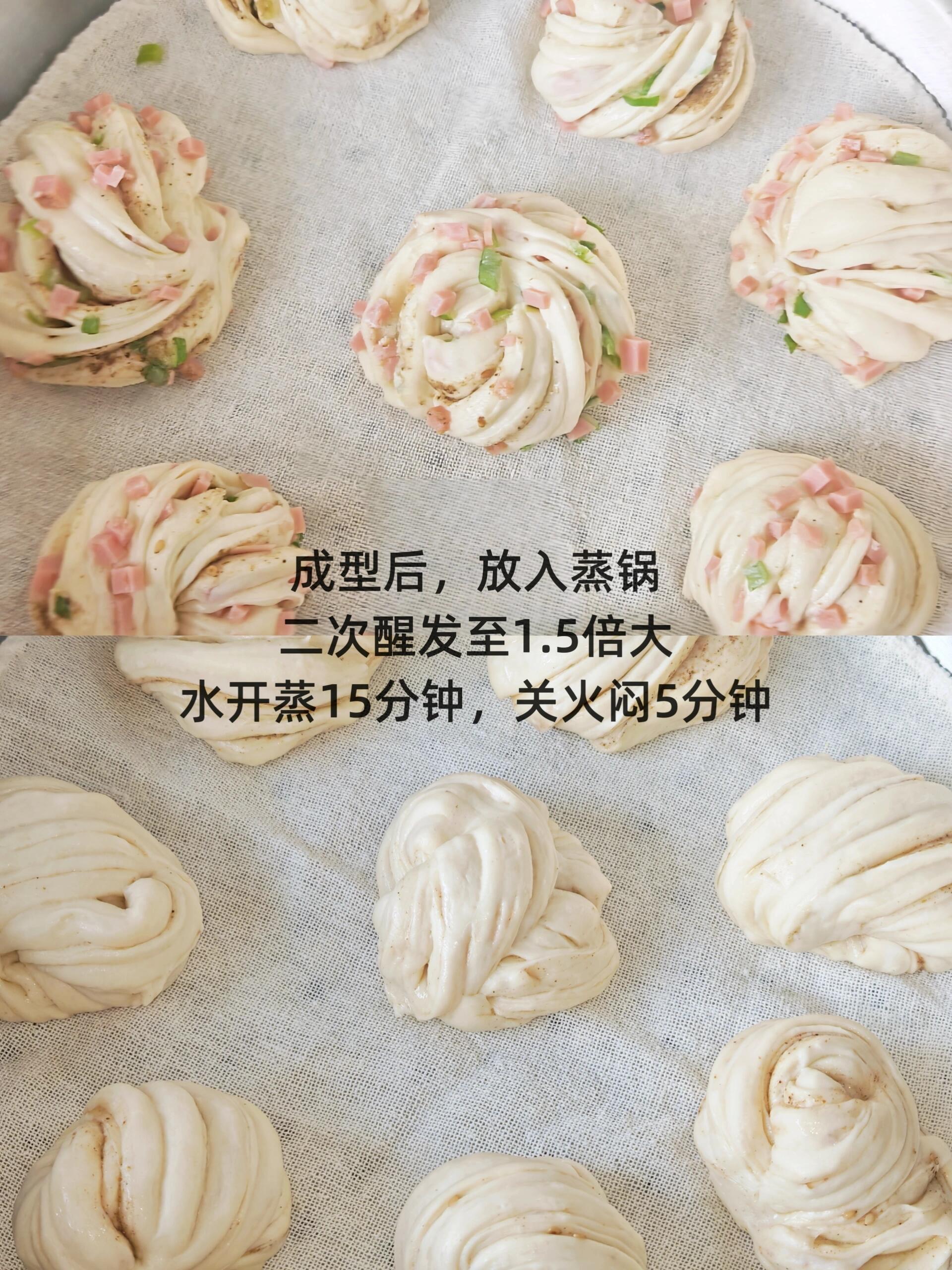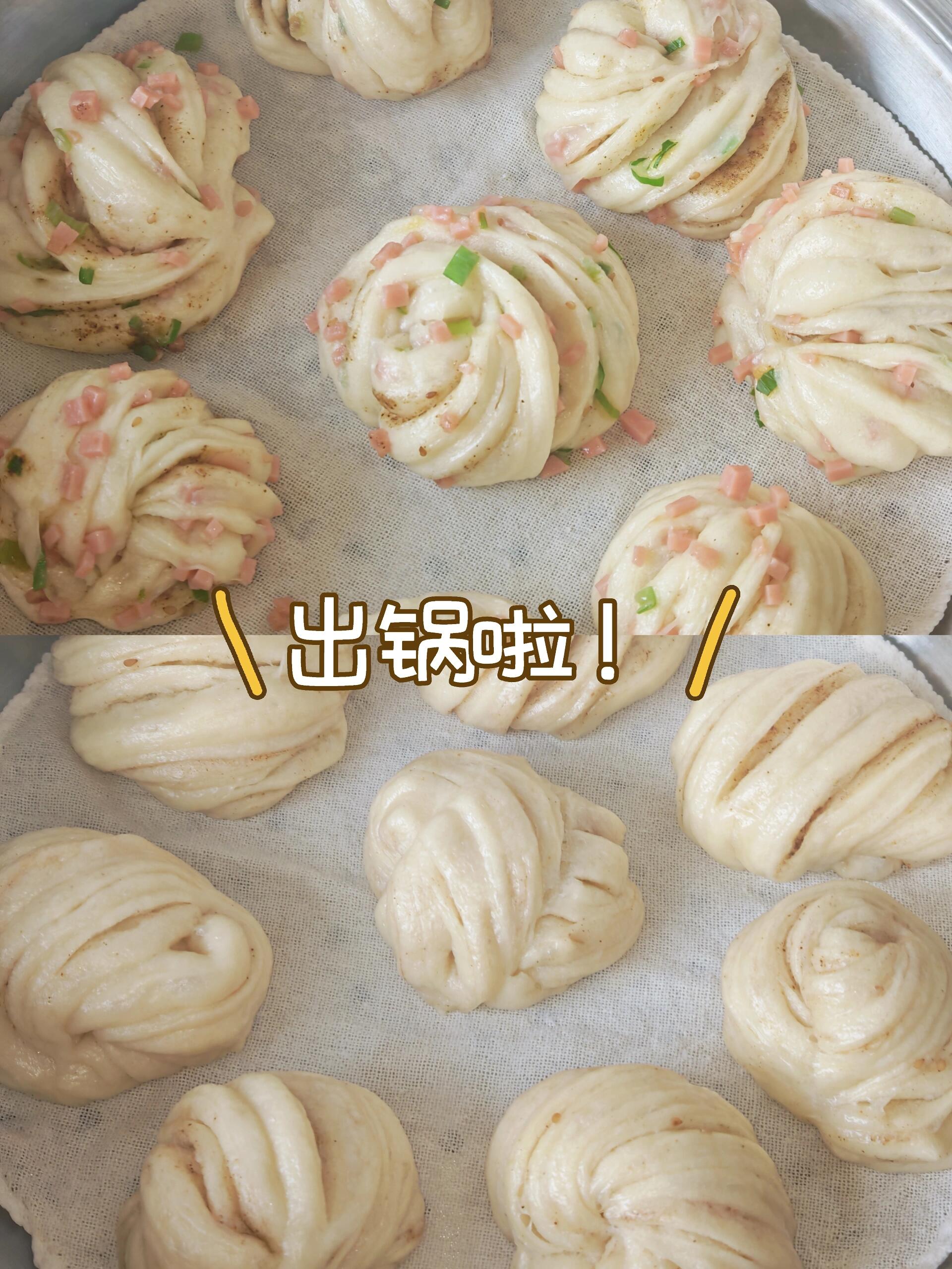 早餐别再出去买了!这花卷一口下去满嘴香,比肉包子还过瘾,做法竟然这么简单 家里有面粉的,强烈建议试试这款双口味花卷!今天在家折腾了一上午,出锅的瞬间全家都惊艳了。不得不说,花卷这种“千层”口感,确实比实心馒头更有魅力,一层一层撕着吃,越嚼越有劲。 今天做了两种口味,满足全家人的胃: 🧂纯椒盐款:经典咸香,口感扎实,吃起来是那种纯粹的麦香混合着花椒的微麻,越嚼越香,当主食绝了。 🌭火腿葱花款:这是“加料版”,每一口都能咬到火腿丁和葱花,鲜香浓郁,我家孩子最爱这个,连吃两个都不够! 做法其实并不难,只要掌握好那个“分层”的小窍门,新手也能一次成功。详细的教程给大家整理好了: 🥣【准备食材】 面团基础:普通面粉500g、酵母5g、温水280g(这个比例揉出来的面团软硬适中)。 调味灵魂:椒盐、五香粉、食用油、干面粉(没错,干面粉是分层的秘密武器)。 豪华配料:小葱花、火腿丁(切成小颗粒)。 👩🍳【保姆级做法】 第一步:和面发酵 把面粉和酵母混合均匀,分次倒入温水,搅成没有干粉的大面絮,再下手揉成光滑的面团。盖上保鲜膜,放在温暖的地方发酵到原来的2倍大。判断标准很简单:手指戳个洞,不回缩也不塌陷就是发好了。 第二步:分层调味(关键步骤) 发好的面团拿出来排气,分成两份。分别擀成长方形的面片,开始做口味区分: 椒盐原味:面片上刷一层油,撒上椒盐和五香粉,最后一定要再撒一层干面粉(这是花卷起层暄软的关键!)。 火腿葱花味:同样刷油、撒椒盐五香粉,然后铺满葱花和火腿丁,最后也撒上一层干面粉。 第三步:扭出漂亮造型 把两个面片分别从长边向中间折叠起来,整理成长条,切成均匀的小长条。 取两个小长条叠在一起。 用筷子在中间用力压一下。 捏住两头轻轻拉长,对折搭在筷子上。 捏住底端,筷子绕一两圈,手托着往下一压,抽出筷子,一个漂亮的螺旋花卷就成型啦! 第四步:蒸制出锅 做好的花卷放入蒸锅,别忘了进行二次醒发,体积变大到1.5倍左右再开火。水开后计时蒸15分钟,关火焖5分钟再揭盖(防止塌陷)。 💡敲黑板的小贴士: 关于分层:很多朋友做出来的花卷不分层,原因就是省略了撒干面粉这一步!油酥夹着干面粉,蒸熟后才会一层一层的,这个步骤千万别偷懒。 关于口味:火腿丁可以随意替换成肉松、烤肠丁,甚至做成甜口的,自由发挥空间很大。 关于保存:一次可以多做点,冷冻在冰箱里。早上起来不用解冻,直接蒸几分钟或者微波炉叮3分钟,一顿热乎乎的早餐立马搞定! 这花卷冷了也不硬,当早餐或者正餐的主食都特别棒。喜欢的姐妹赶紧点个收藏,有空给家人安排上!