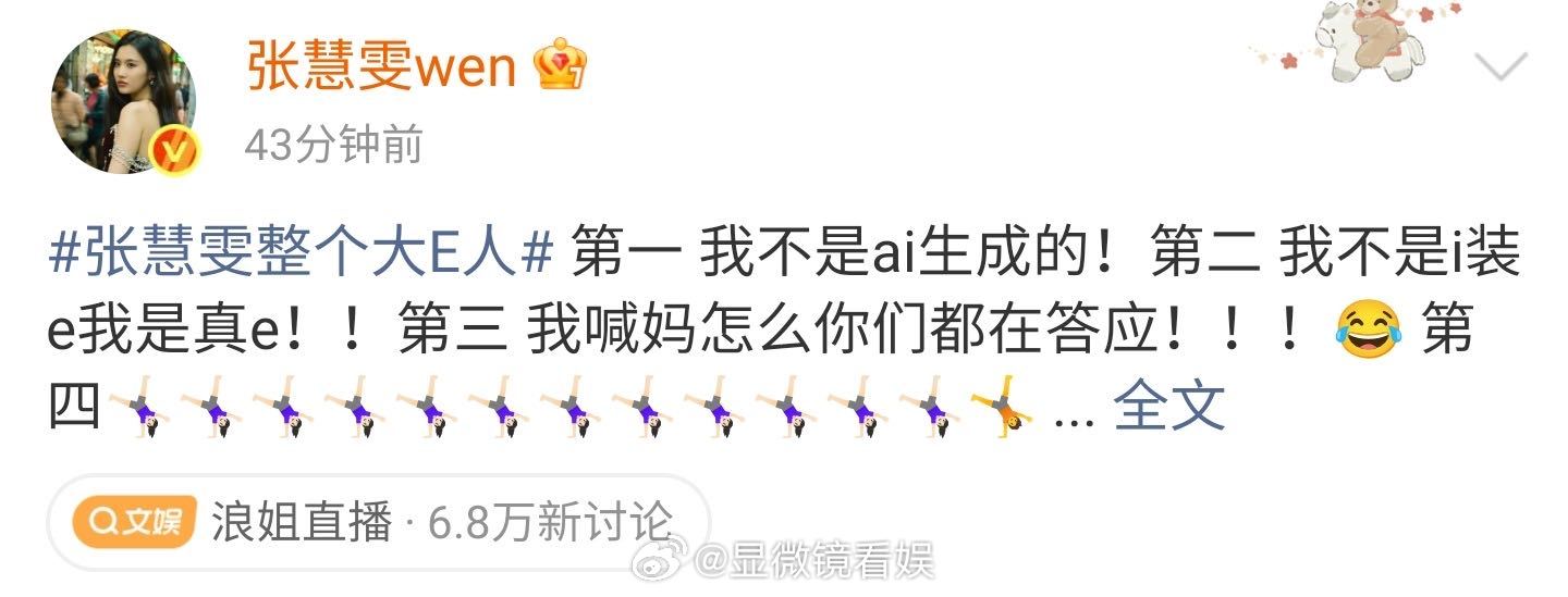 张慧雯回应整个大E人又被可爱到啦!看到自己被说是大E人的热搜,刚下舞台就火速回应