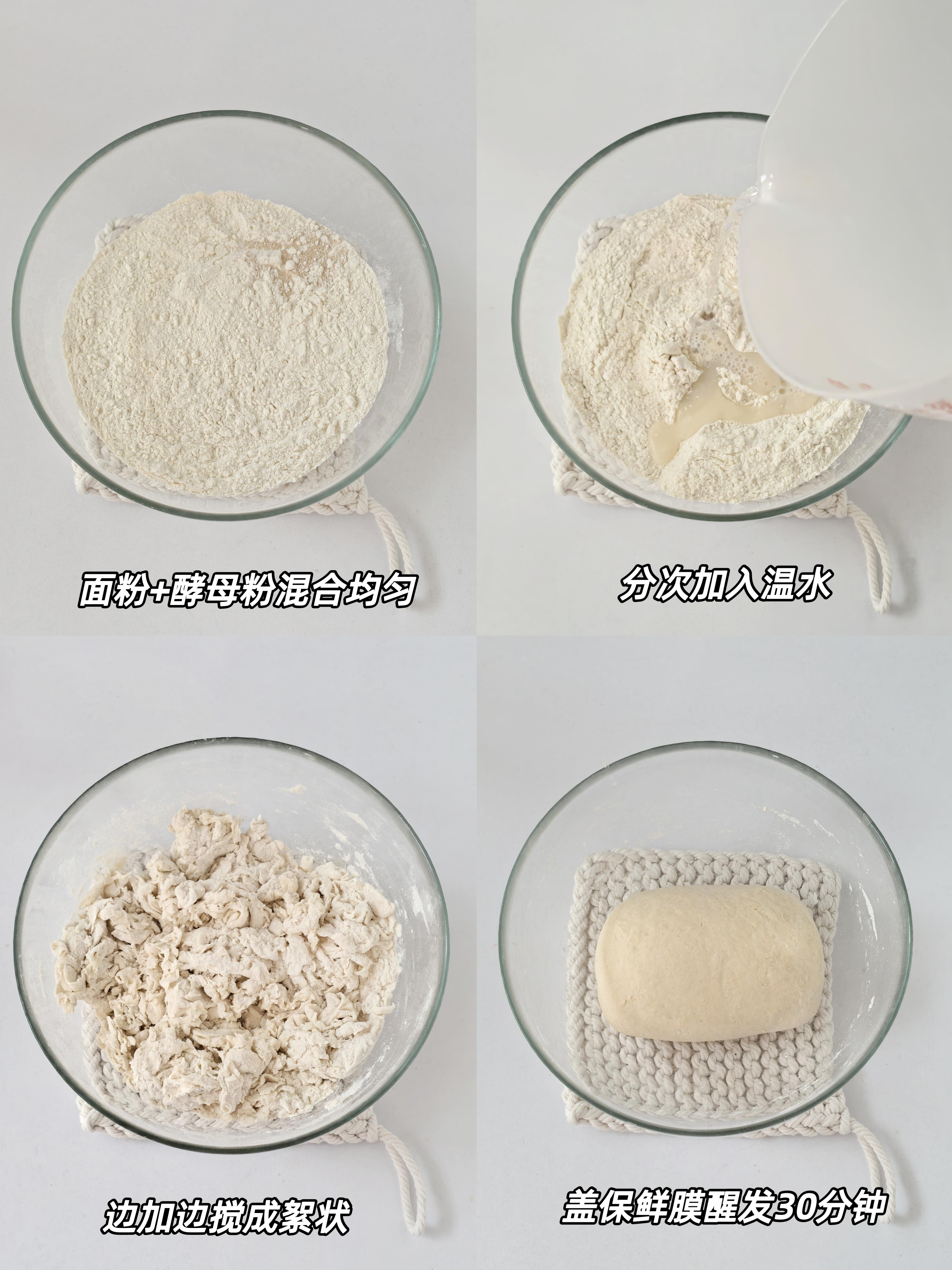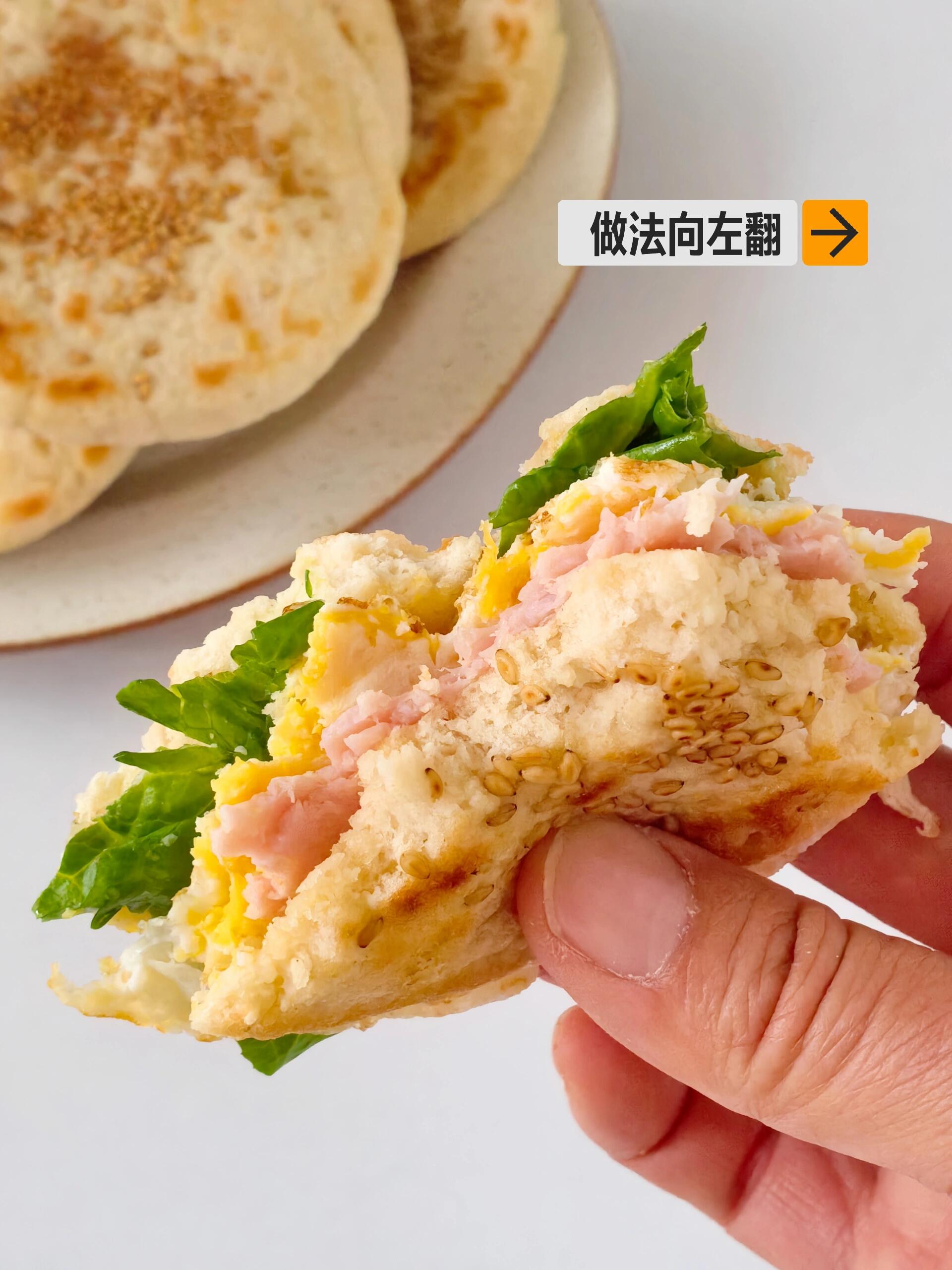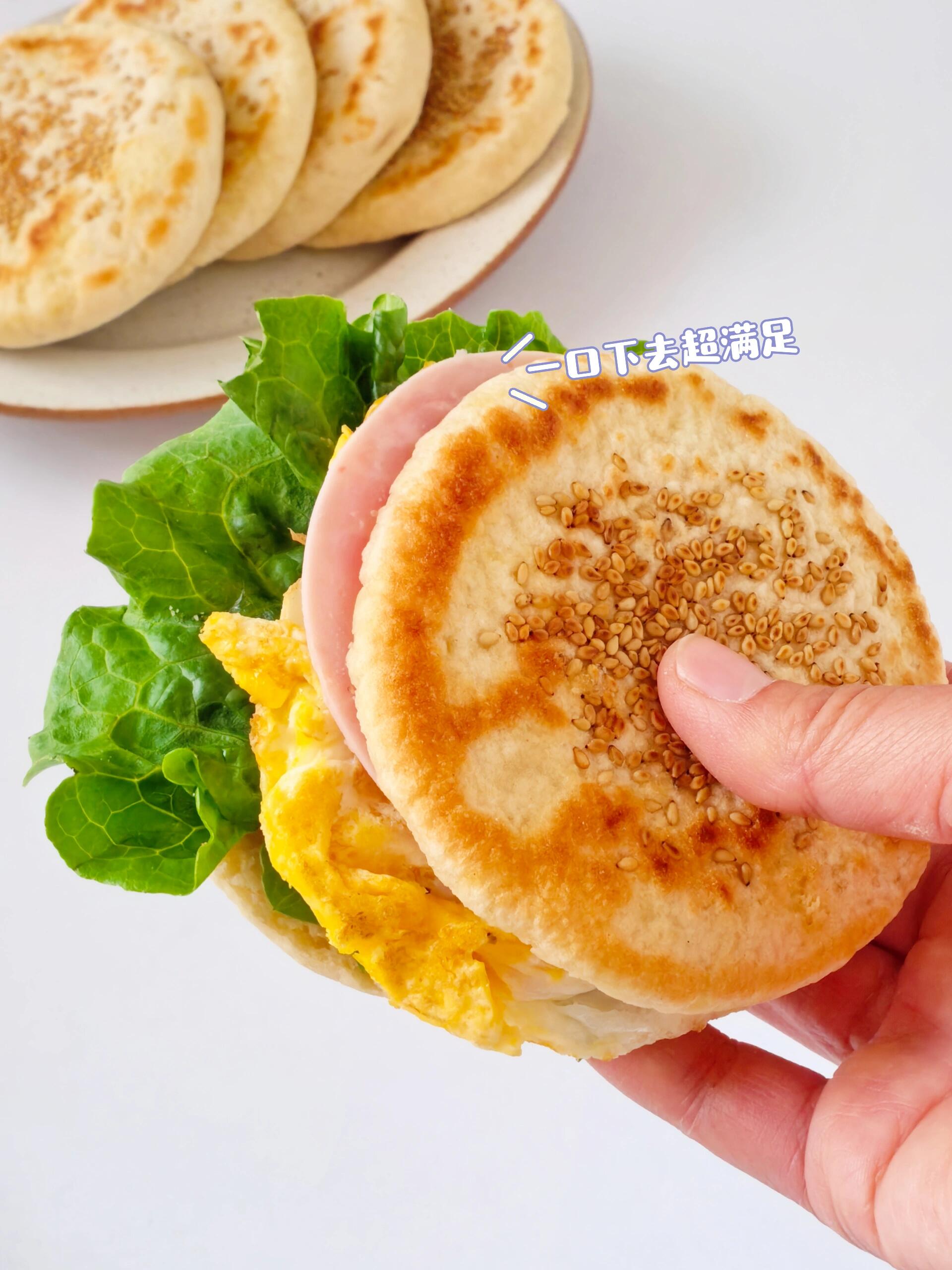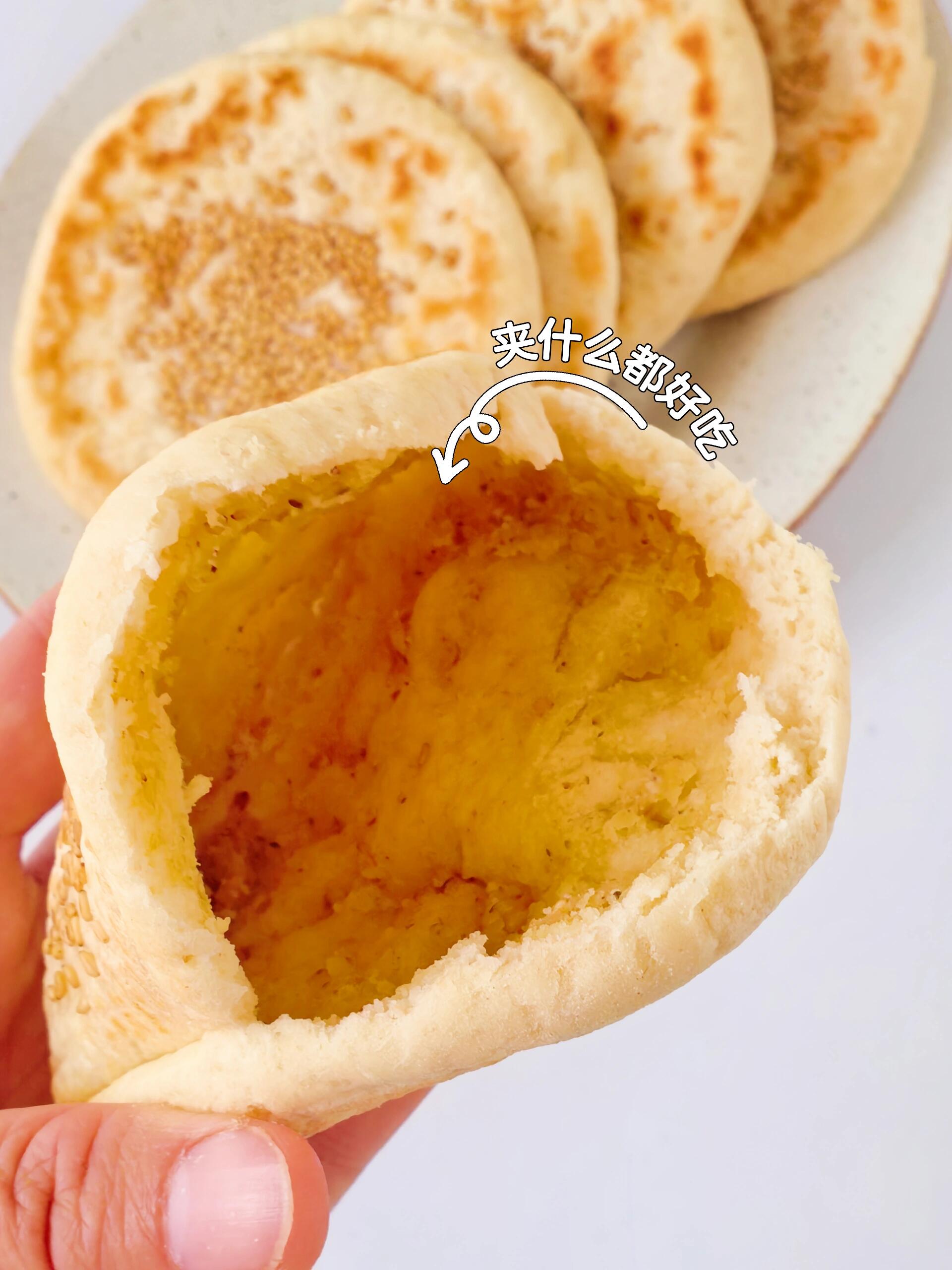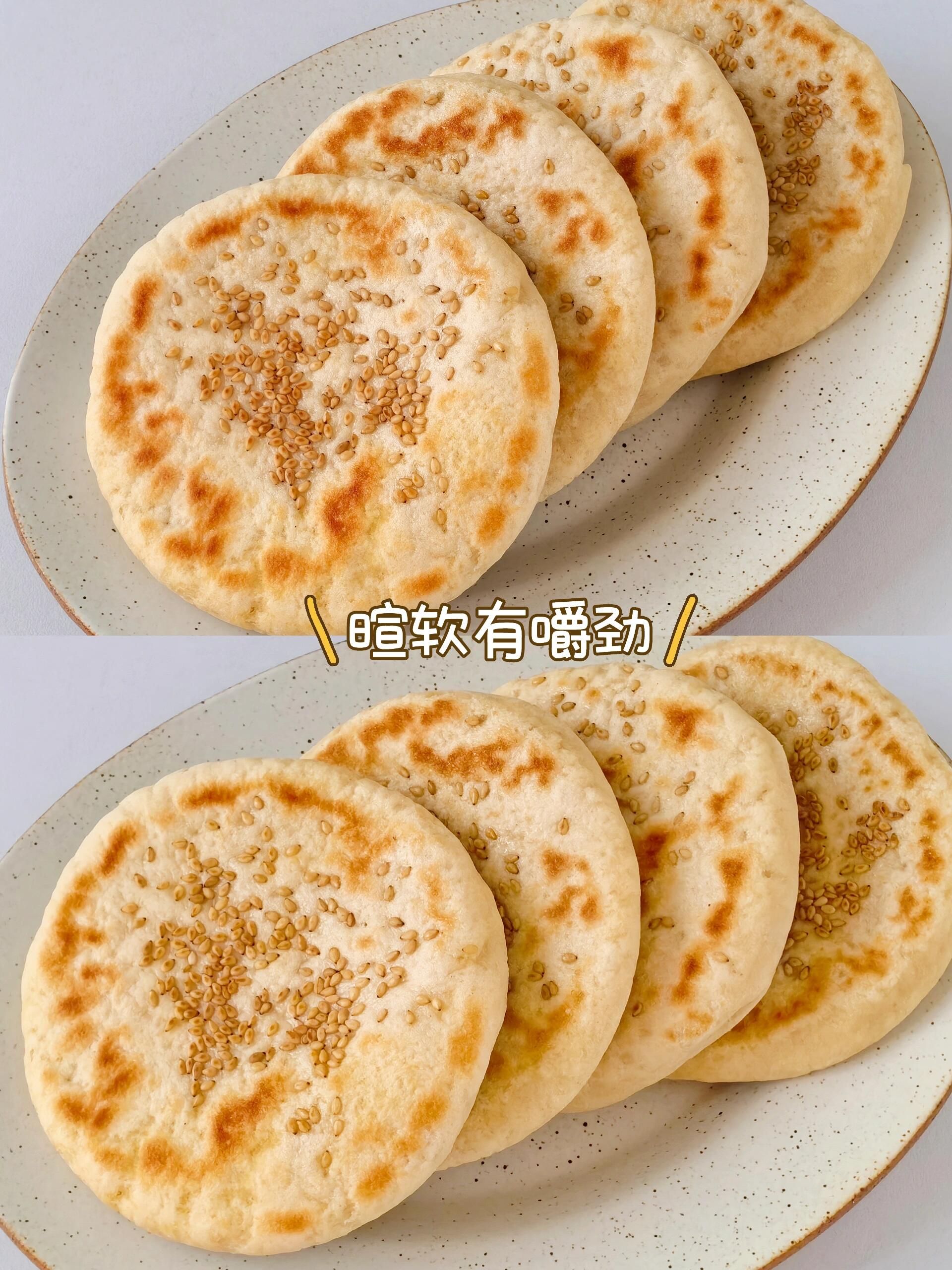 早餐界的“万能救星”!这个芝麻盐发面空心饼,夹啥都好吃,全家抢着要!🥯 谁懂这一口的含金量!不用像做面包那样费力揉出膜,也不需要烤箱,家里有个平底锅🍳就能做!做出来的饼外酥里软,个个空心鼓大包,不管是夹鸡蛋、夹红烧肉还是夹土豆丝,都好吃到爆!💯 👉 食材清单 中筋面粉300克、温水160克、干酵母2克、白芝麻少许(表面装饰用)。 👉 灵魂油酥(分层的秘诀) 碗里放3勺面粉、1勺芝麻盐混合,浇入4勺热油,搅拌成酸奶状的稀糊糊备用。 👉 制作步骤 1️⃣ 和面醒发 面粉里加酵母混匀,分次倒入温水,搅成面絮后揉成光滑面团。盖上保鲜膜醒发30分钟,注意不用发到2倍大,半发面口感更劲道。 2️⃣ 制作饼坯 醒好的面团排气搓条,分成6个均匀的小剂子。 取一个剂子揉圆按扁,擀成中间厚边缘薄的圆片,包入适量油酥收口。 再次擀成圆饼,表面喷一层薄薄的清水,撒上白芝麻,用手轻轻按压固定。 3️⃣ 平底锅烙制 平底锅烧热刷少许油,放入饼坯,中小火烙约1分钟。 待底部定型、微微金黄后翻面,继续烙至饼身鼓起大泡就可以出锅了。 💡 吃法小贴士 烙好的饼用刀从顶部划开,就是一个完美的空心口袋。想夹什么菜随你心情,一口咬下去,饼皮酥脆掉渣,内里吸满菜汁,早餐吃它太满足了!
