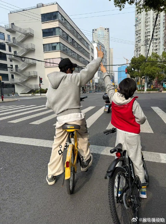 4月4日,黄晓明带儿子游玩,父子二人同框默契骑单车,画面温馨又幸福!照片中的黄