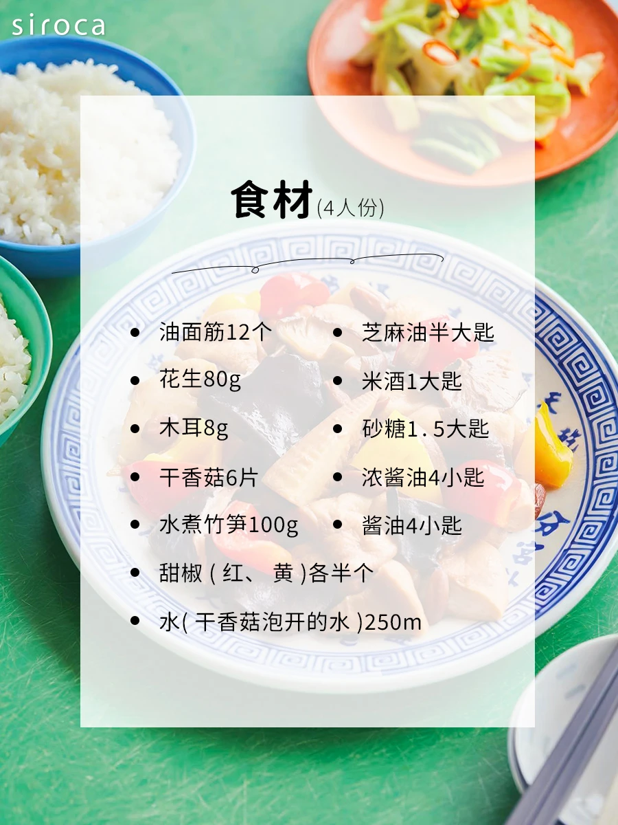 油面筋12个、花生80g、木耳8g、干香菇6片、水煮竹笋100g、红黄甜椒各半个
