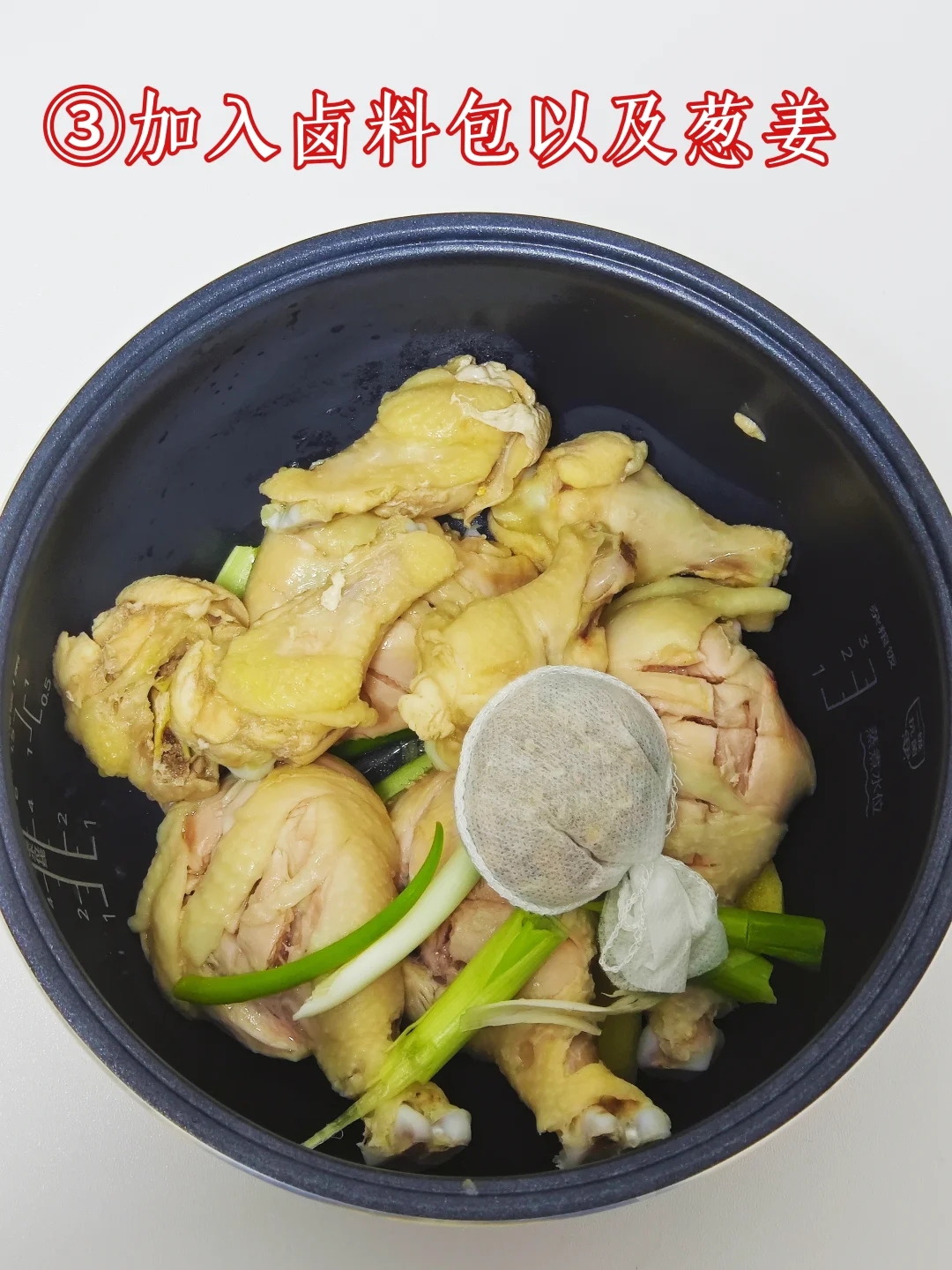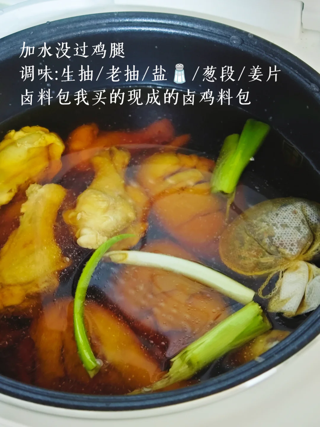 4️⃣电饭煲加入葱段姜片还有卤料包,我买的是现成的卤鸡料包,里面有花椒八角香叶白芷等等香料。
