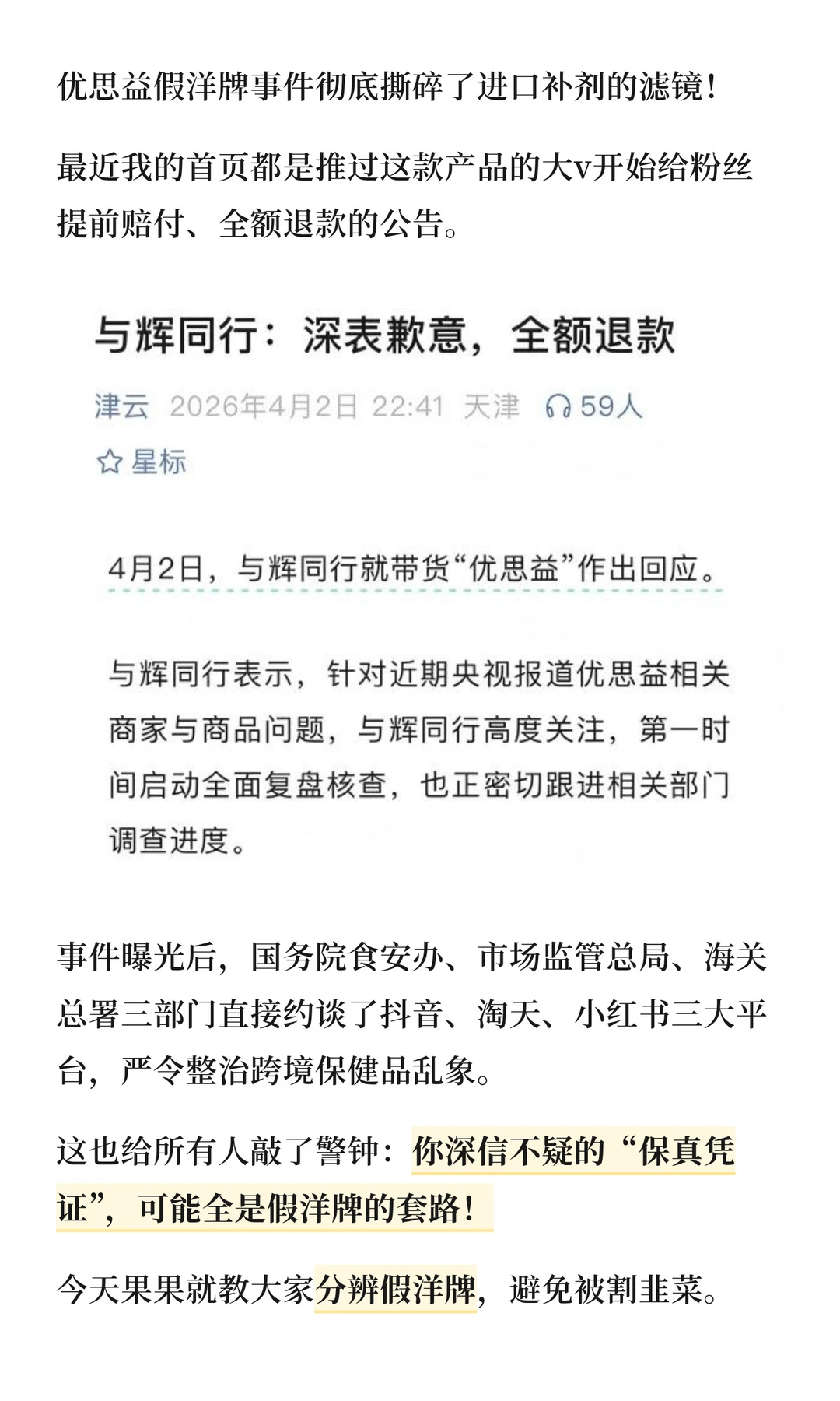没想到号称澳洲百年品牌的销冠补剂优思益,包装上的墨尔本工厂地址实际是汽车维修站,所谓原装进口全是国内代工厂生产,靠 “国内生产→香港贴标→保税仓发货” 的套路,并请了伊能静、与辉同行、吴昕等一众大v带货,伪装成洋牌收割国内消费者……