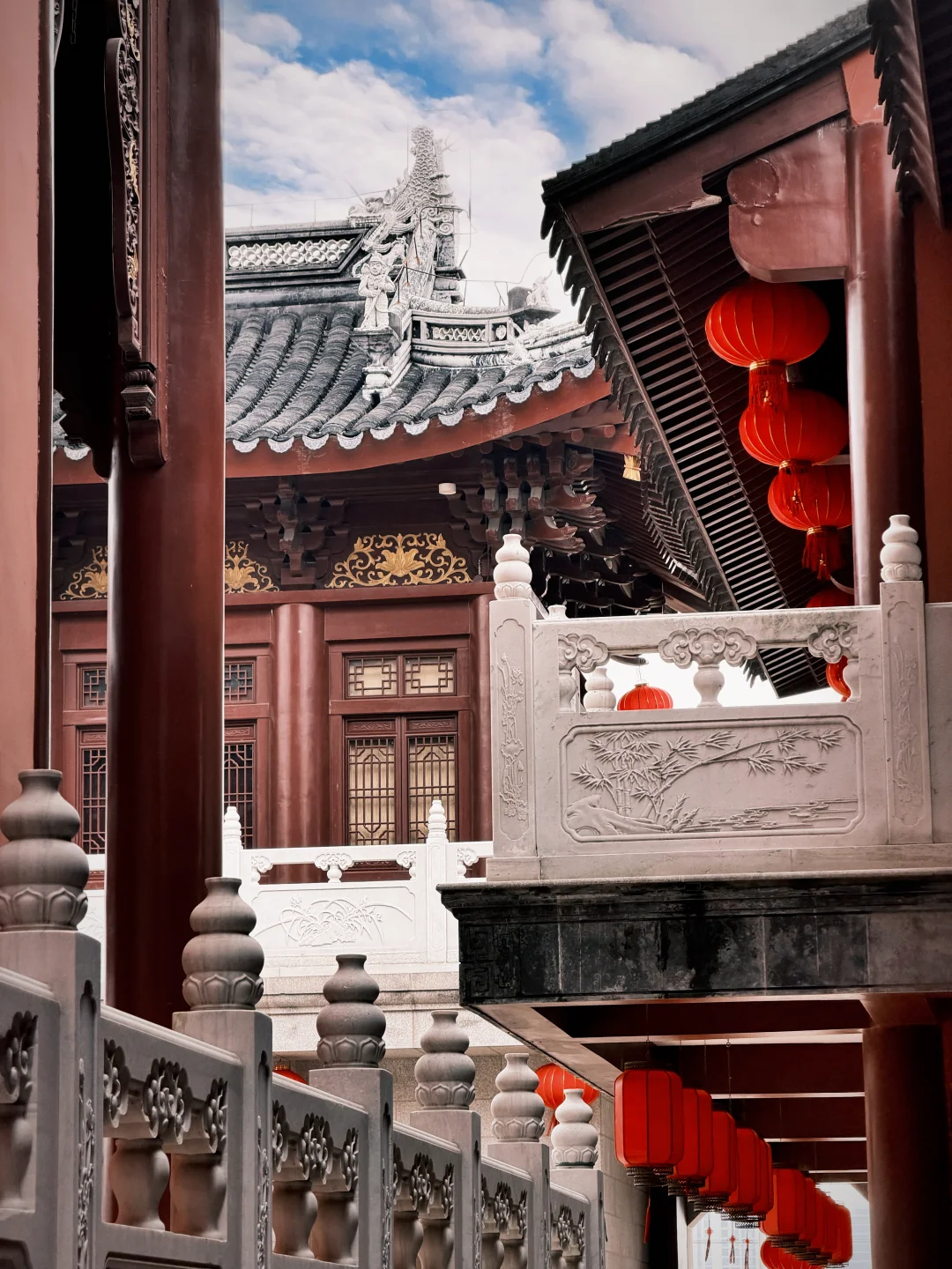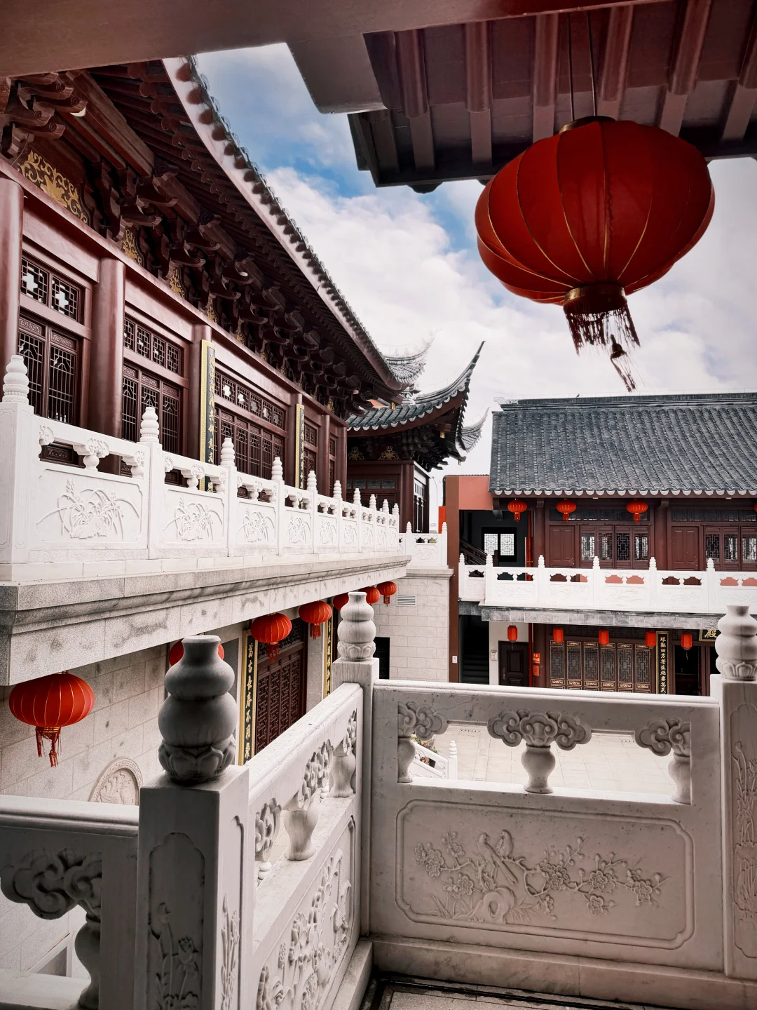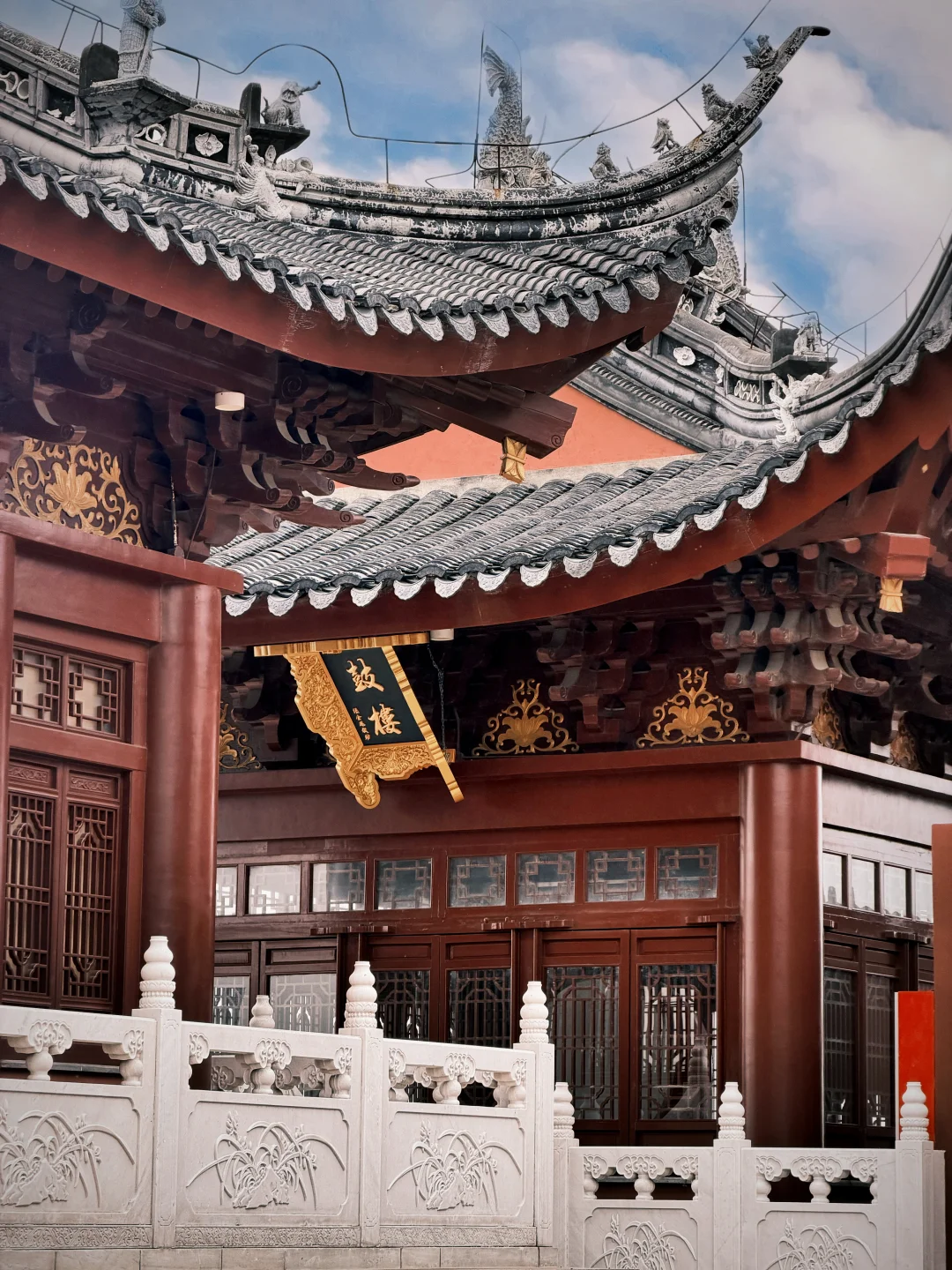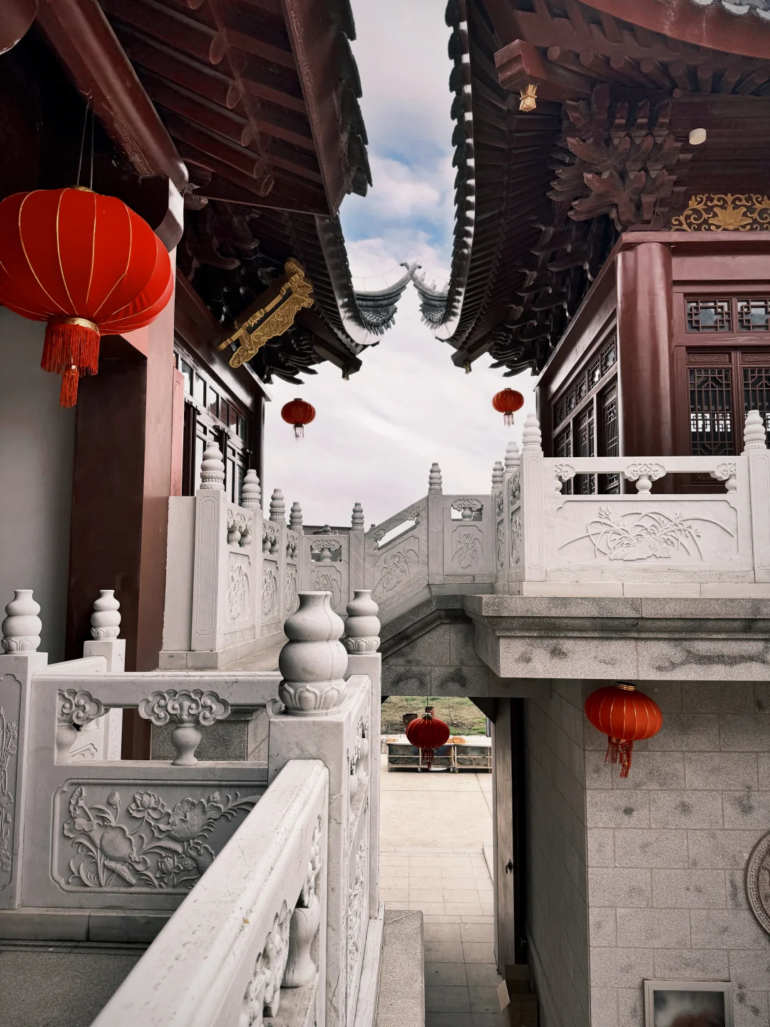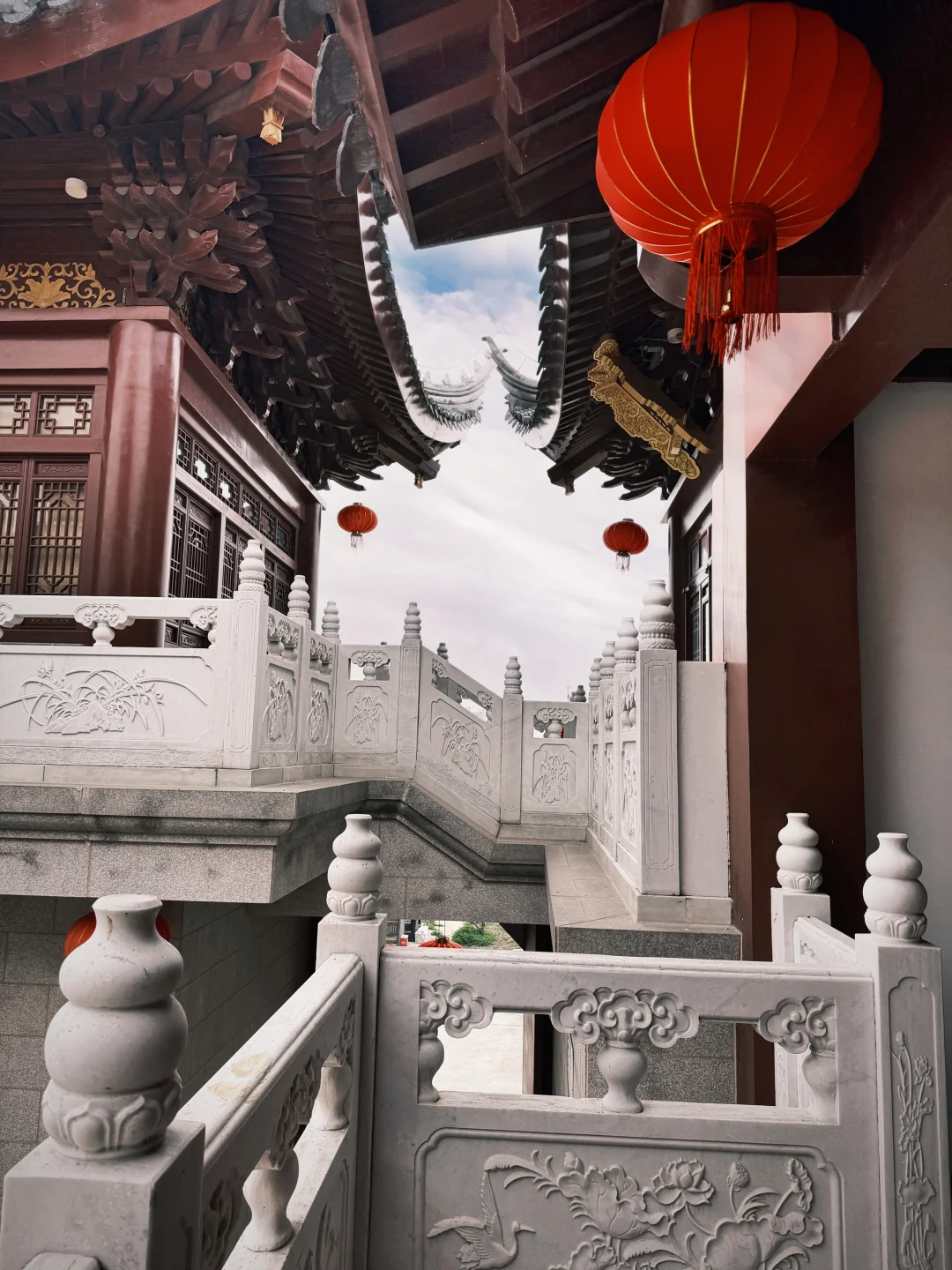 ☯️主殿为双层歇山顶,规格崇高,屋脊与檐角饰有仙鹤、祥云等祥瑞纹样。四角悬挂风铃,风起清音;门窗、梁柱多有传统木雕与彩绘,处处体现女性修行的温婉与庄严。