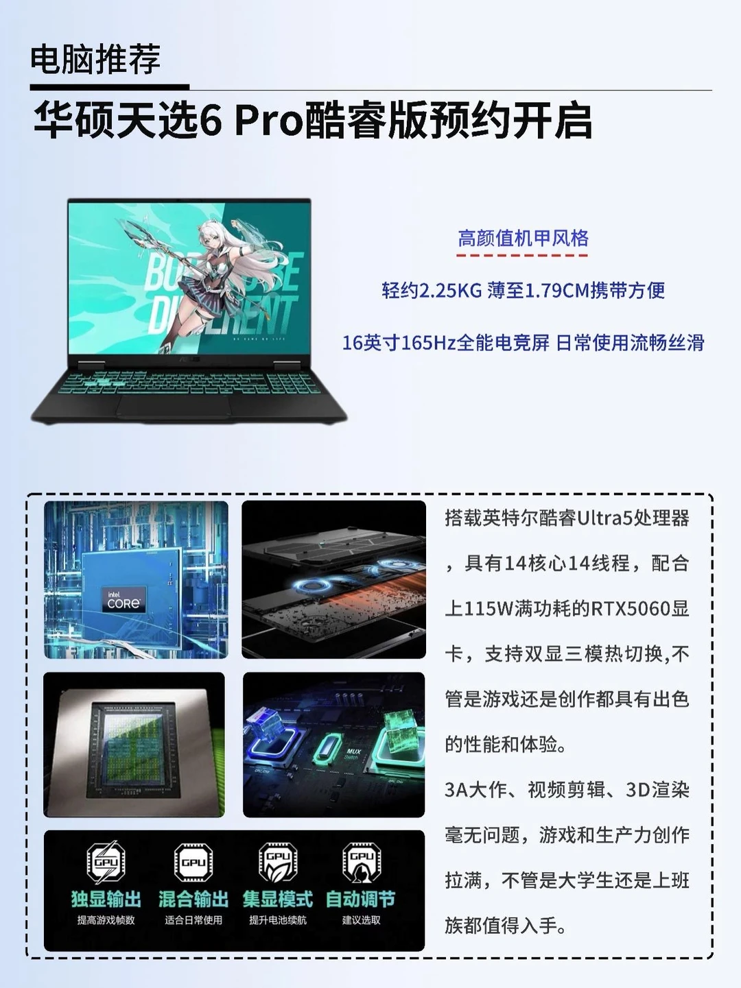 💻而且还有2.5K 165Hz高刷电竞屏、100W PD快充、高颜值机甲风设计、双显三模显卡热切换,3A大作、视频剪辑、3D渲染毫无问题,游戏和生产力创作拉满,不管是大学生还是上班族都值得入手