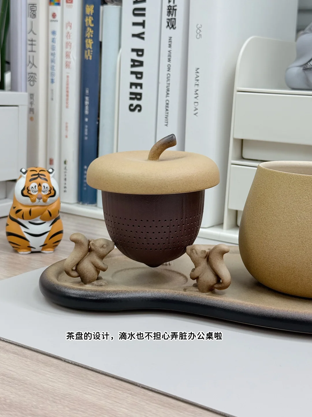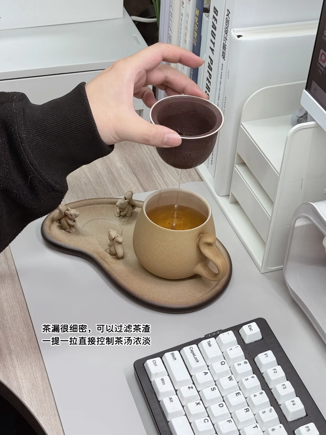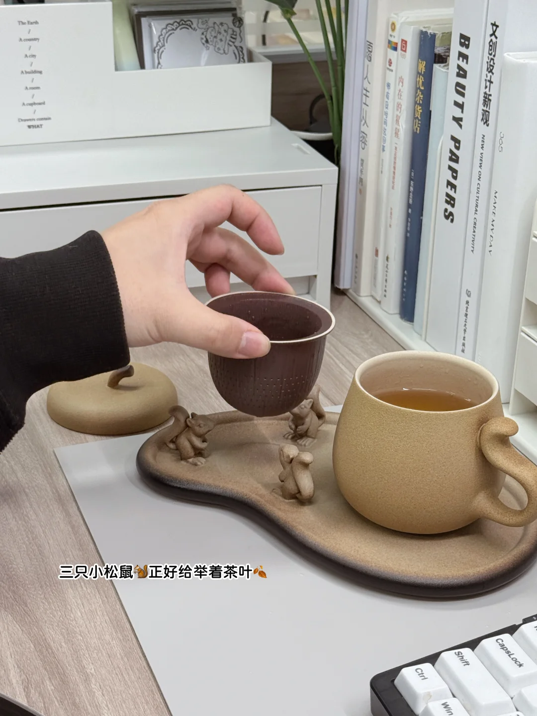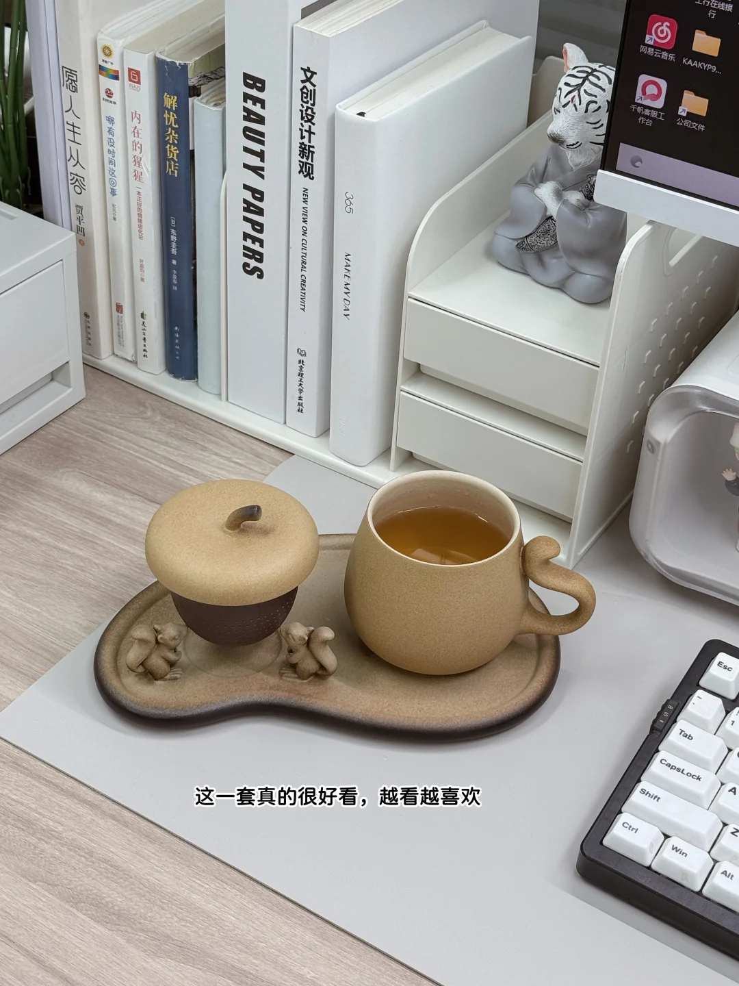 一直心心念念想在工位搞套茶具喝茶, 选了很久好看的都不是很方便,方便的又不太有仪式感。 这套算是很满意的了!1杯1盘1漏搞定办公室喝茶! 泡茶的茶漏可以直接放左边小松鼠上,又实用还很好玩儿😀 茶盘的设计滴水不会弄脏办公桌,还能放点小零食,很适合打工人了hhh 越看越好看,满意!
