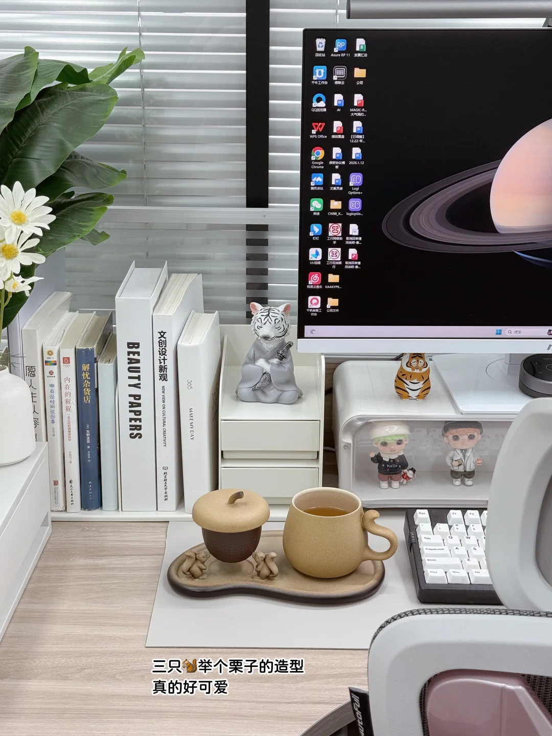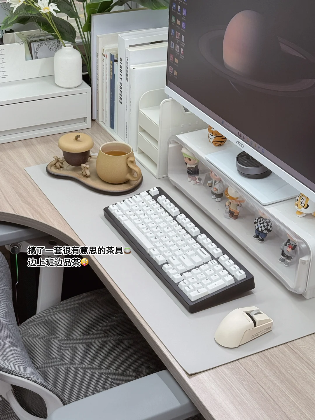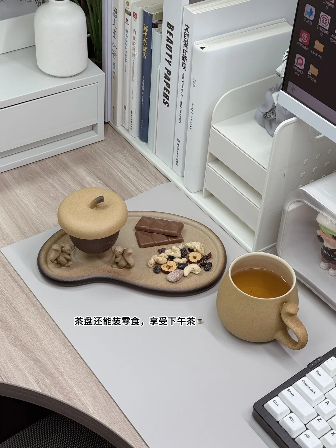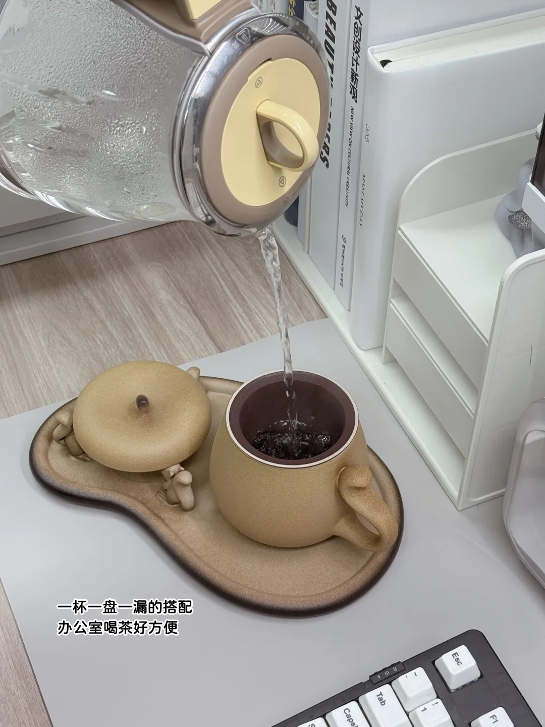 一直心心念念想在工位搞套茶具喝茶, 选了很久好看的都不是很方便,方便的又不太有仪式感。 这套算是很满意的了!1杯1盘1漏搞定办公室喝茶! 泡茶的茶漏可以直接放左边小松鼠上,又实用还很好玩儿😀 茶盘的设计滴水不会弄脏办公桌,还能放点小零食,很适合打工人了hhh 越看越好看,满意!