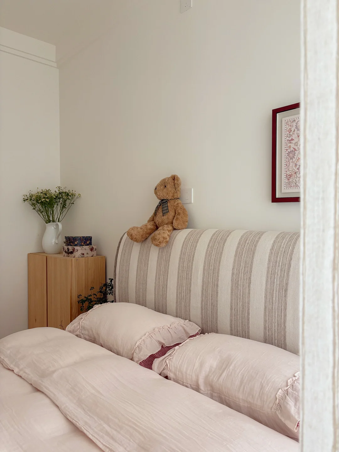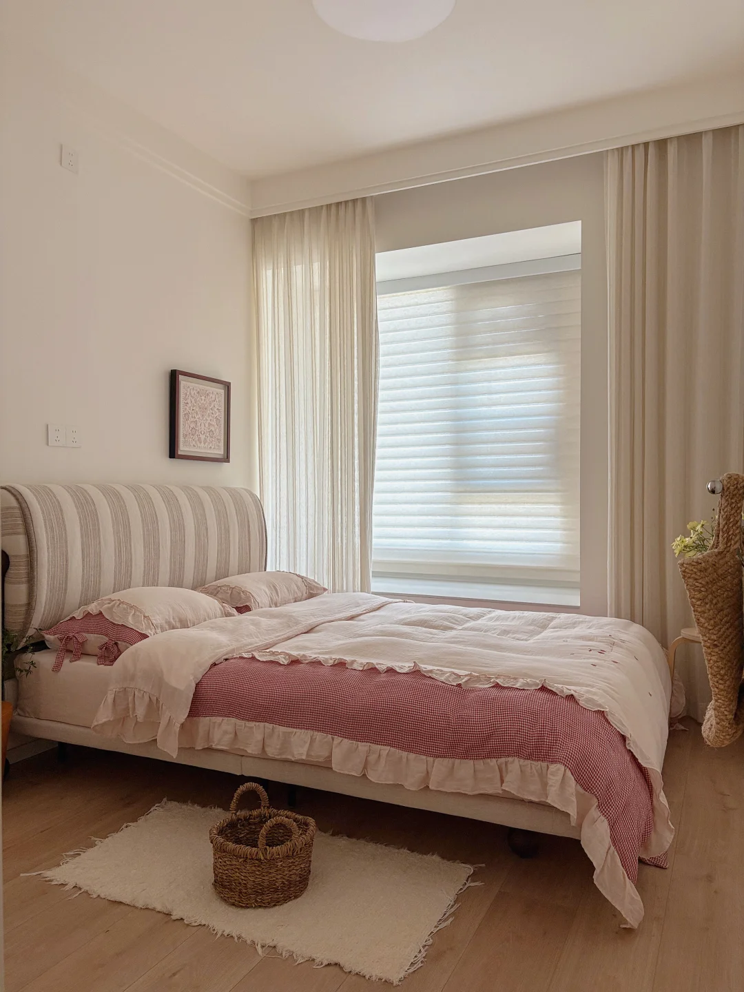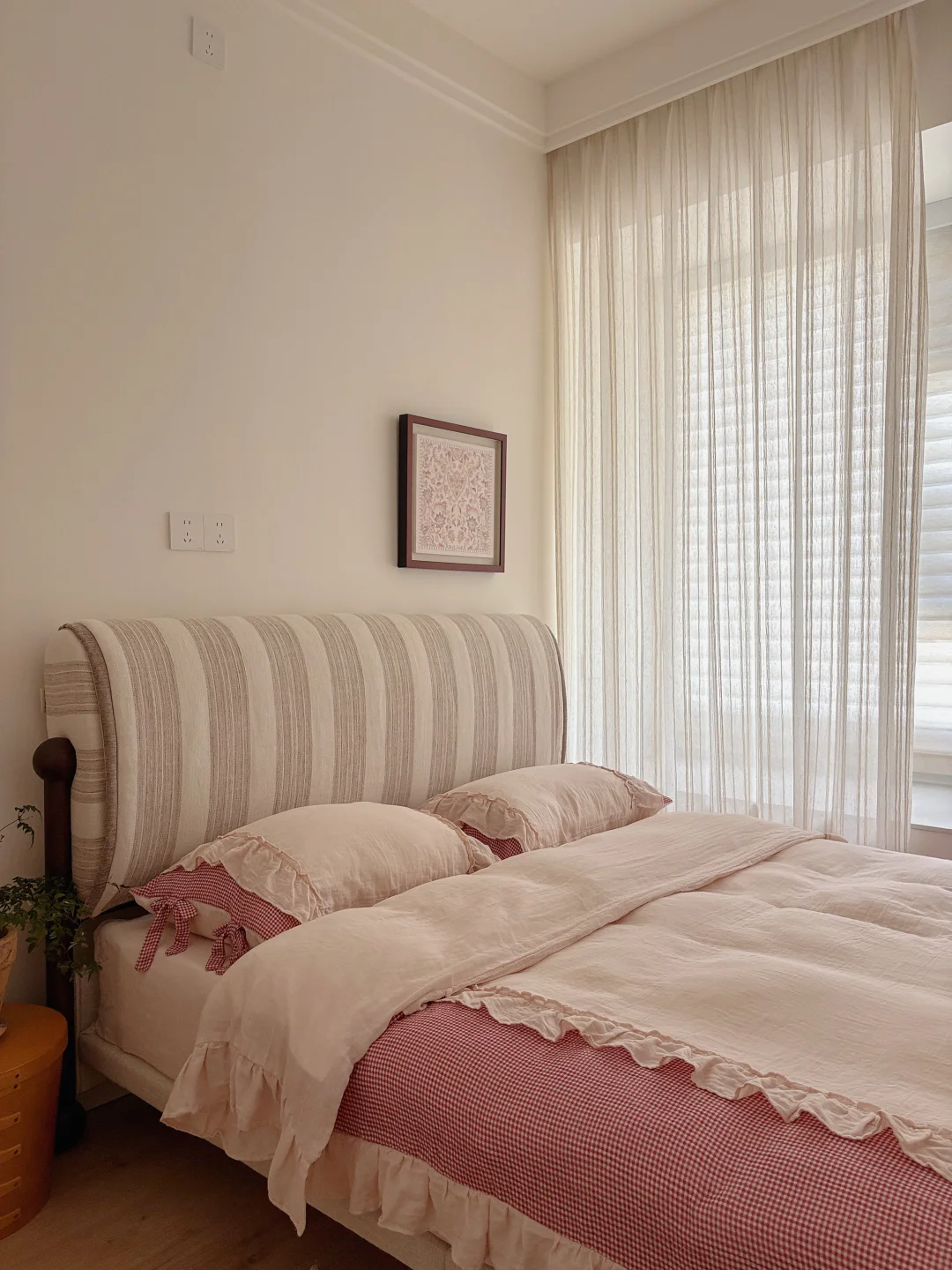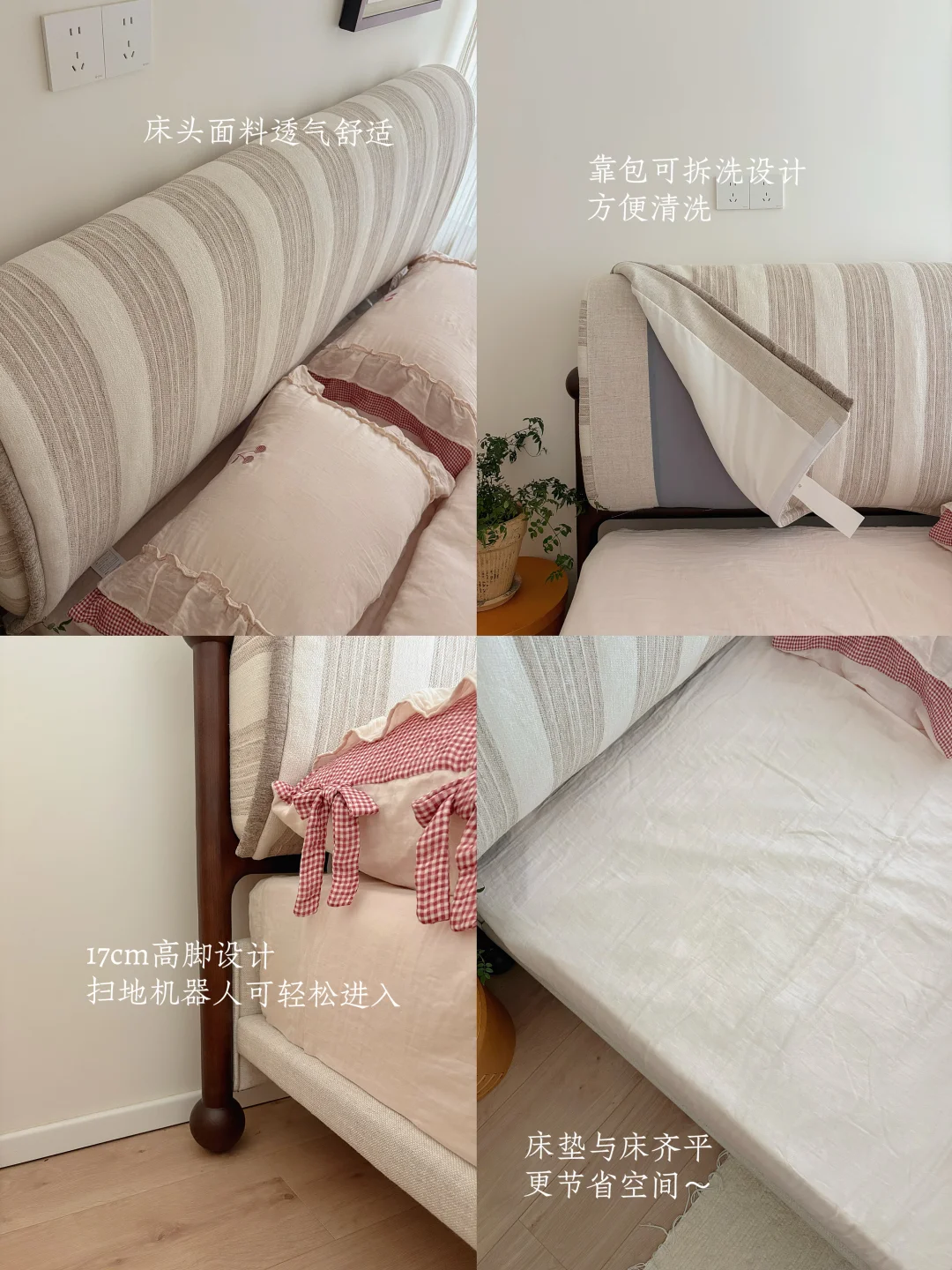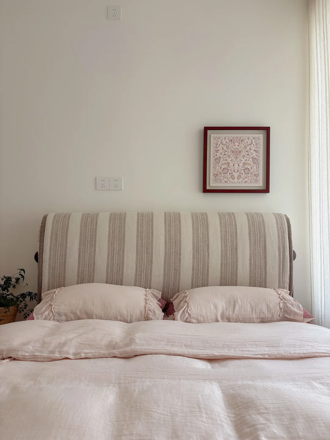 从刚换上的新鲜感到现在的日常陪伴,越睡越觉得选对了🥰 当初一眼沦陷的春枝白底色,现在看还是温柔到骨子里,天丝亚麻面料摸起来糯叽叽的,没有多余装饰,却自带一种松弛的高级感,和我家的奶fufu软装简直是天作之合。 用了一段时间才发现,品质是真的靠谱: • 加密实木排骨架真的稳,半夜翻身、娃蹦跳都听不到一点异响,承重也完全放心,商家还承诺终身质保,安全感拉满! • 床头靠包厚实,睡前靠着玩手机超舒服,用了三个月依旧饱满,完全没有塌陷,天然的面料,也很透气,夏天用不怕闷汗 • 细节设计更是满分: ✅靠包可拆洗,脏了直接拆洗,没有清洁焦虑 ✅17cm高床脚,扫地机器人能自由穿梭,而且床脚内收,也不怕磕碰 ✅齐边设计,小户型卧室瞬间多了半平米活动空间,视觉上也更通透开阔 每天醒来都觉得卧室又大又舒服~如果你的小户型也想换一张颜值与实力并存的床,支吾原野床真的可以闭眼冲!