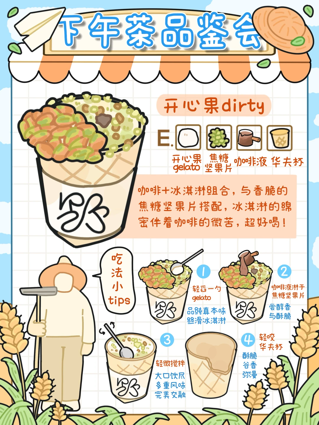 “初尝一口gelato的丝滑浓郁,再将咖啡☕️倒在焦糖坚果片上品味醇香与酥脆🌟,搅动咖啡与gelato完美融合后大口饮尽😋最后还能吃到外层酥脆的华夫杯,每一个环节都是新的味蕾盛宴💖”