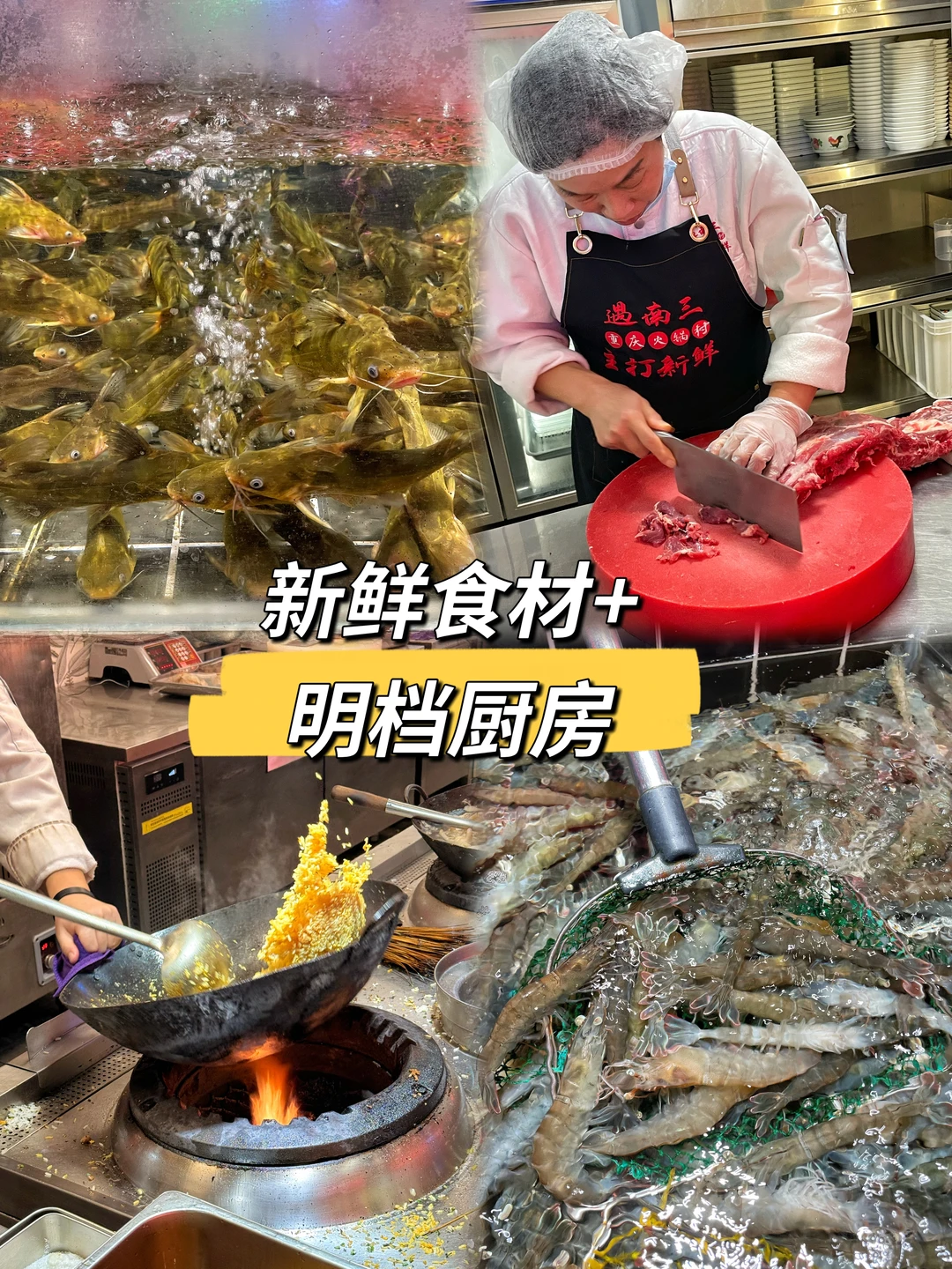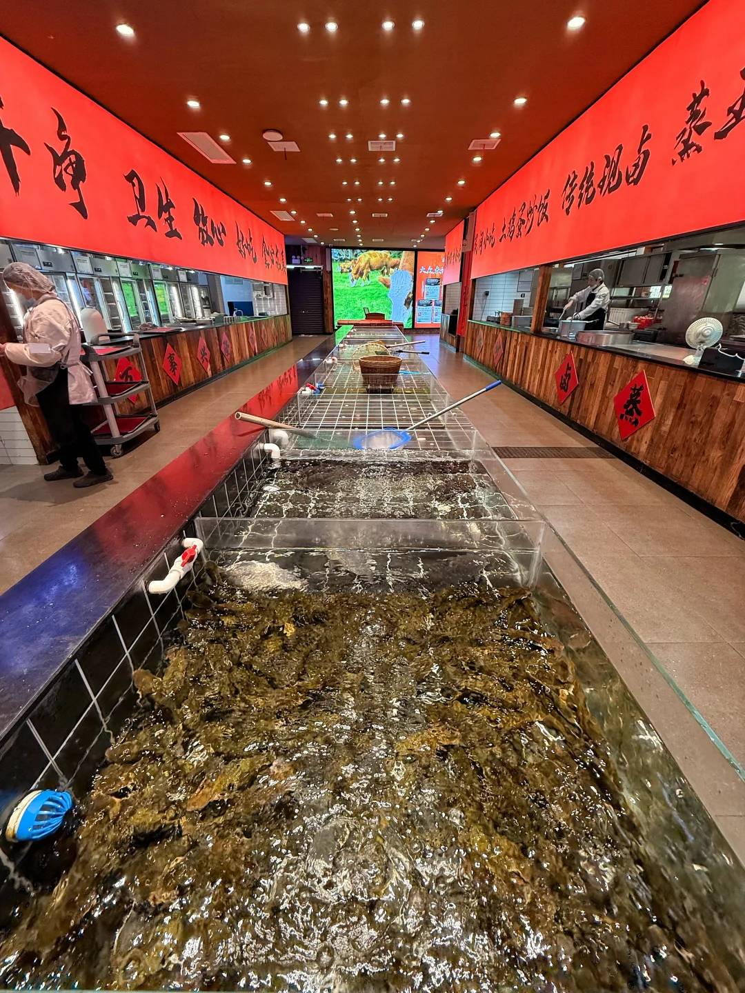 👉进店就看到了他们摆放整齐的食材和明档厨房,手工菜品,从切菜到烹饪,甚至是甜品饮料制作过程,一一呈现给顾客。水产池的鲍鱼,虾,黄鸭叫等也是现捞现做,新鲜出炉。