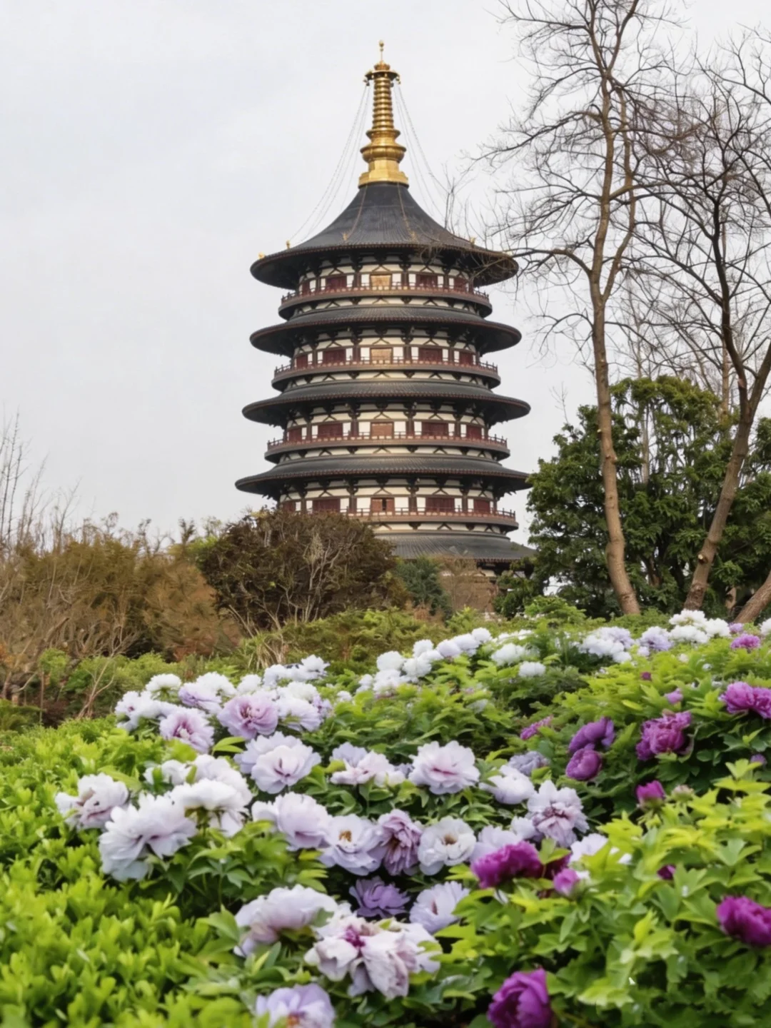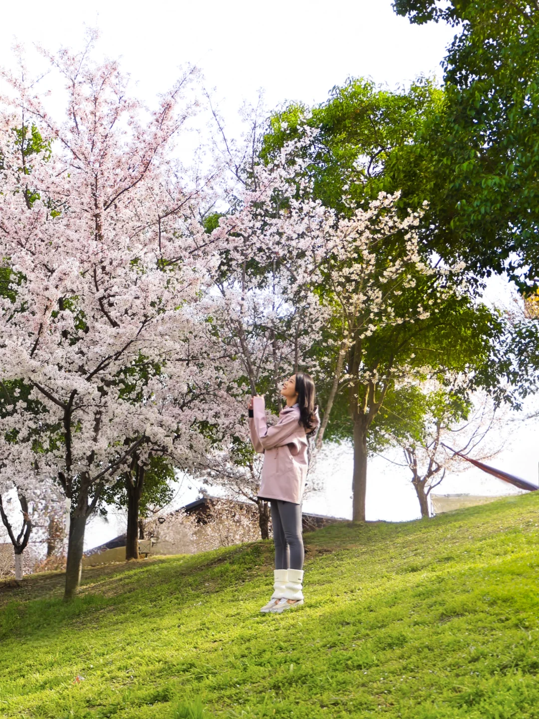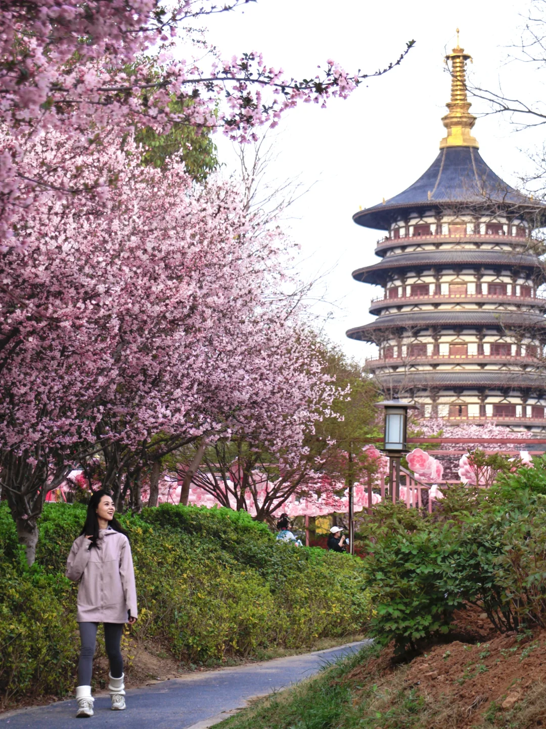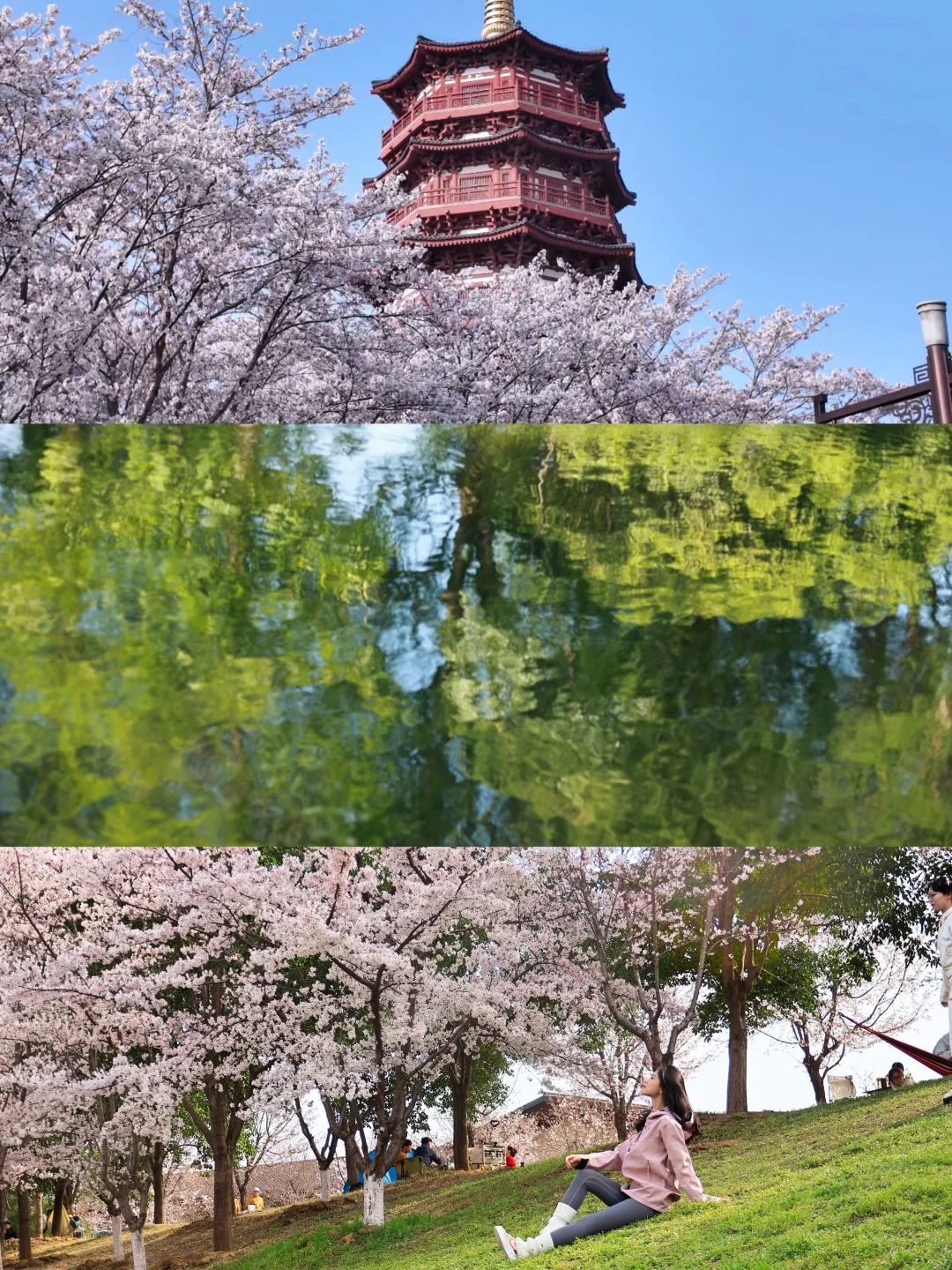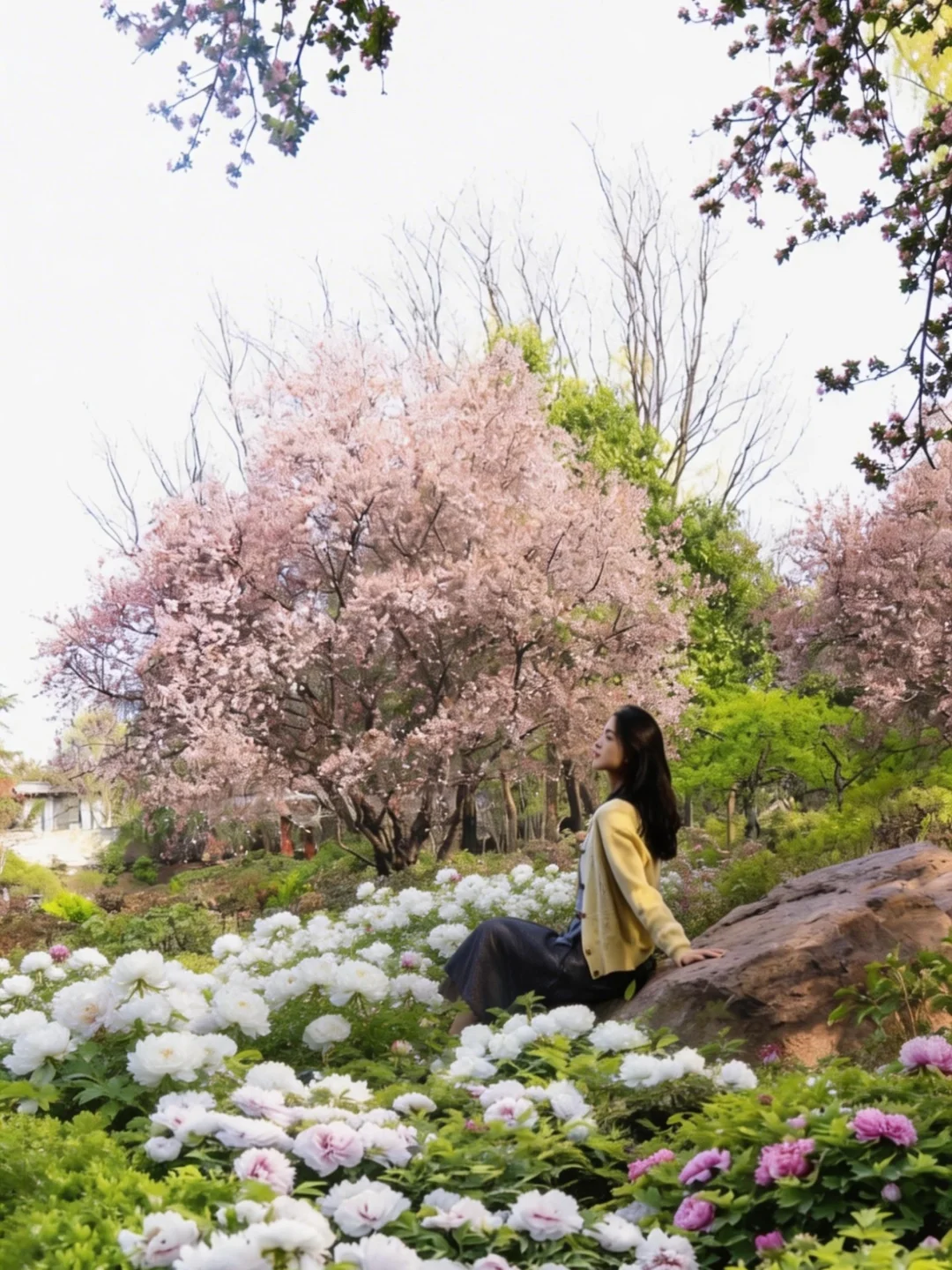 牡丹樱花绕湖而生,亭台水榭映花影