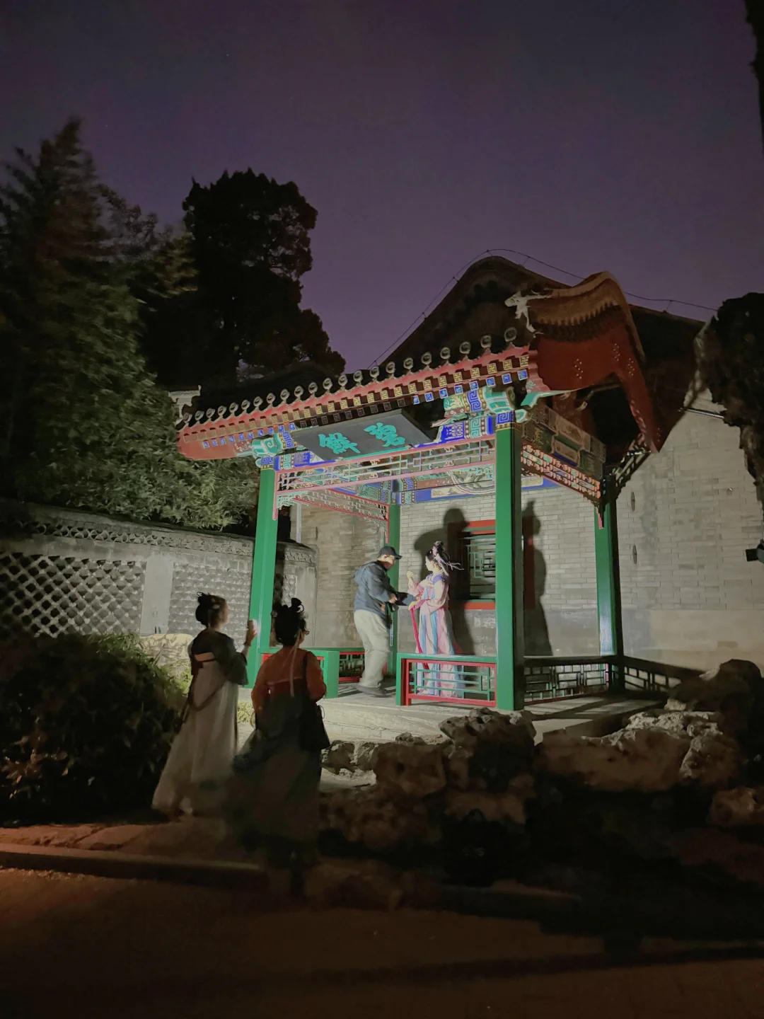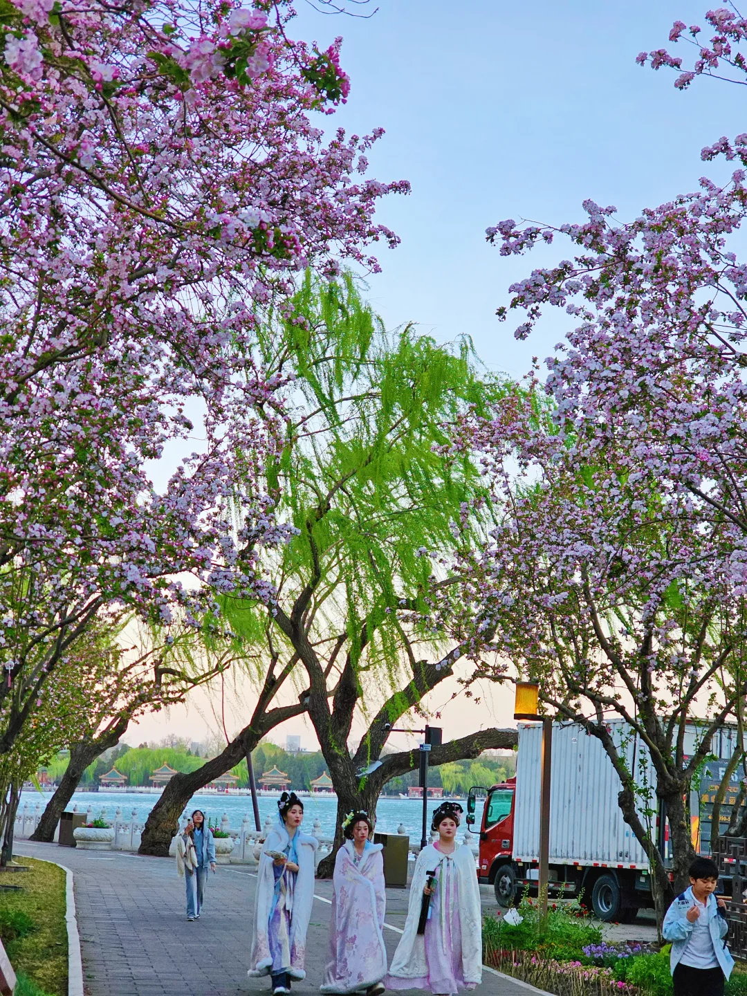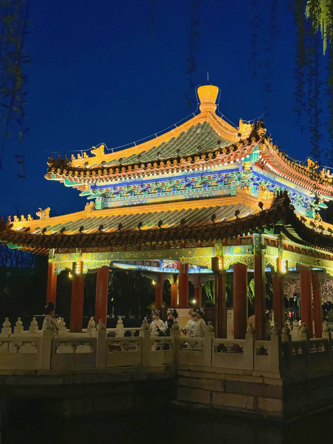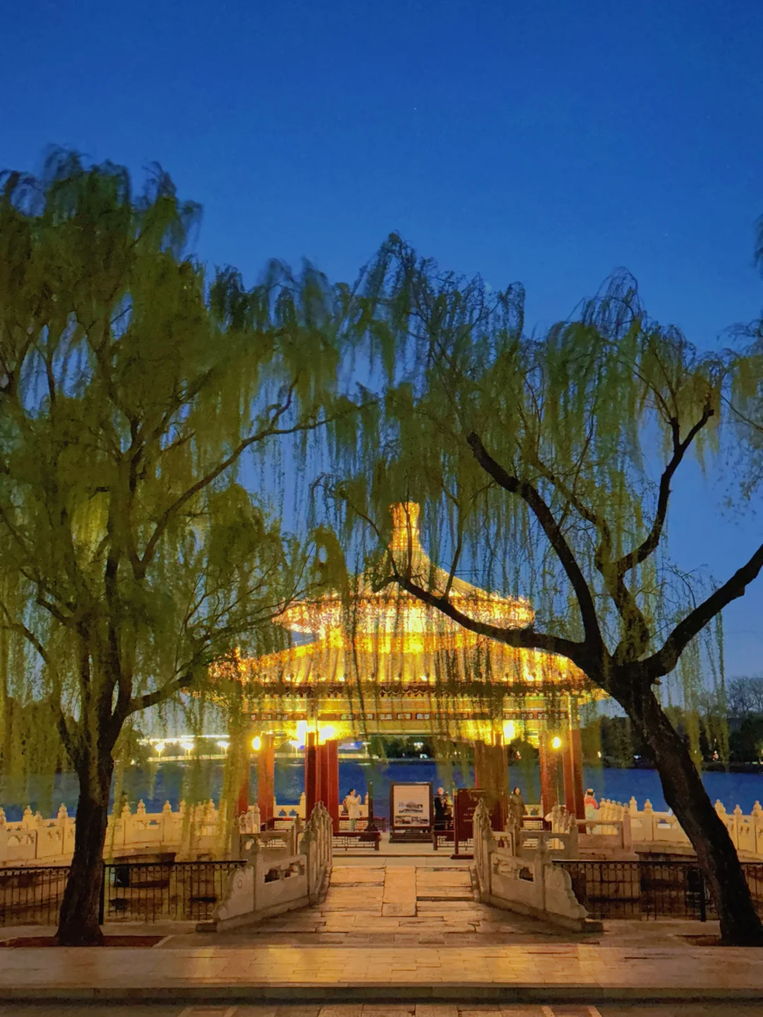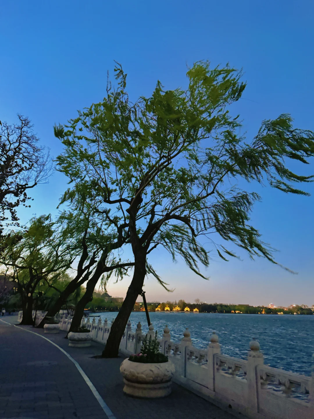 蓝调时刻,大风中飘扬的柳条和远处开灯的五龙亭,这才是中式审美的最高境界。