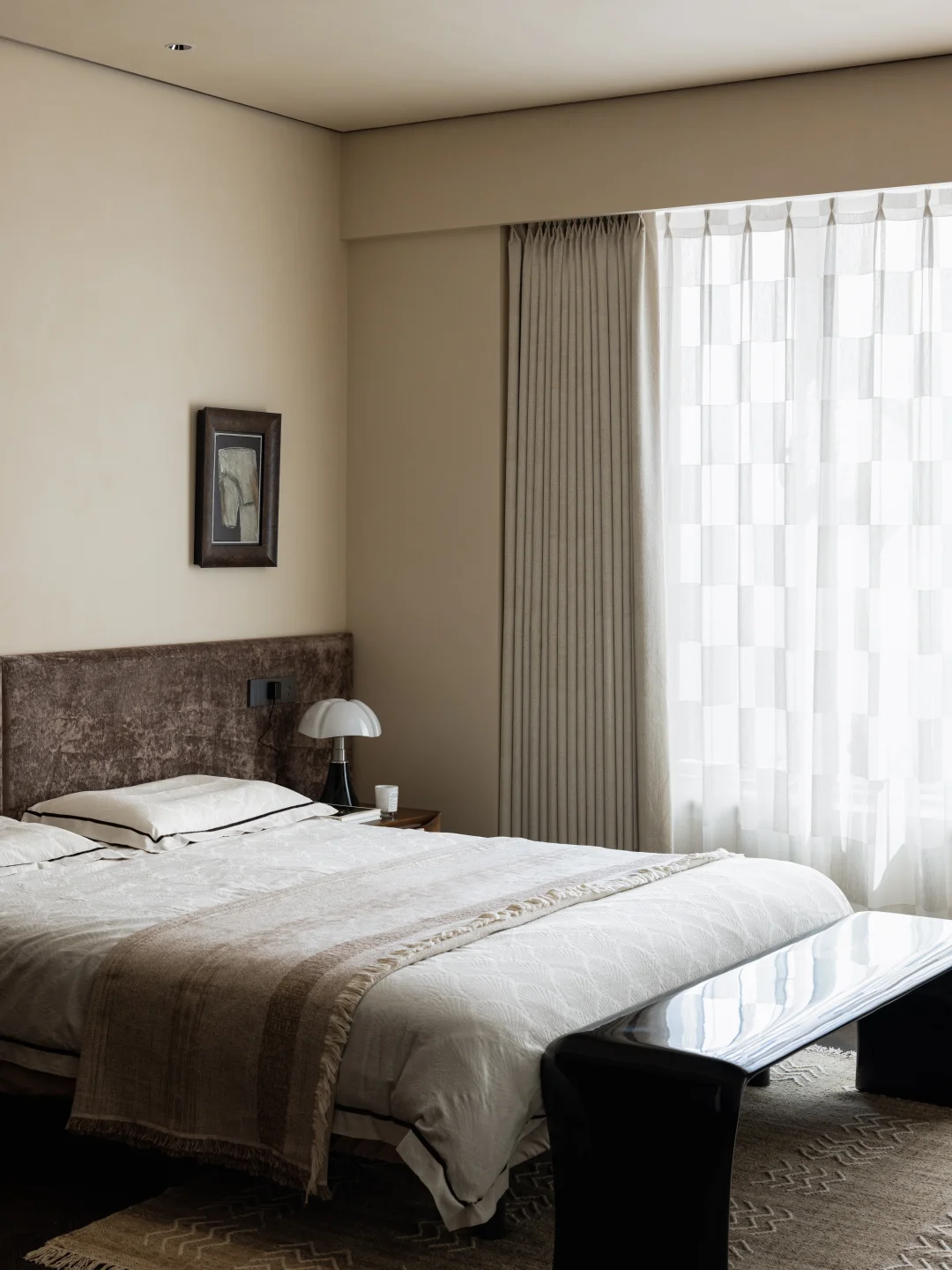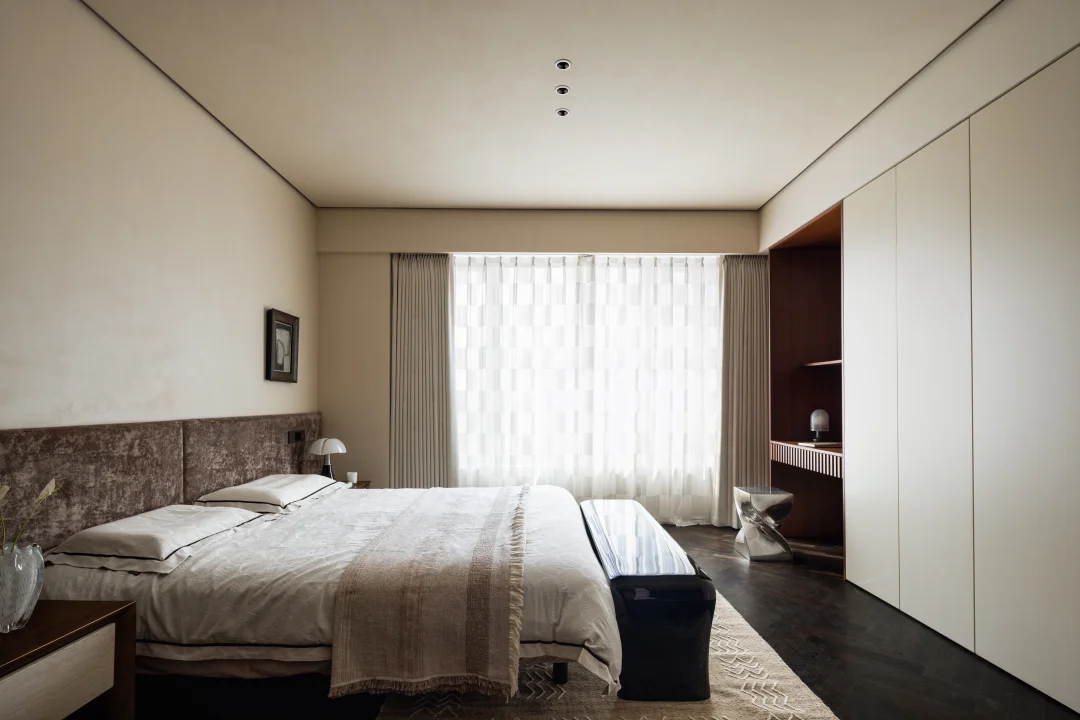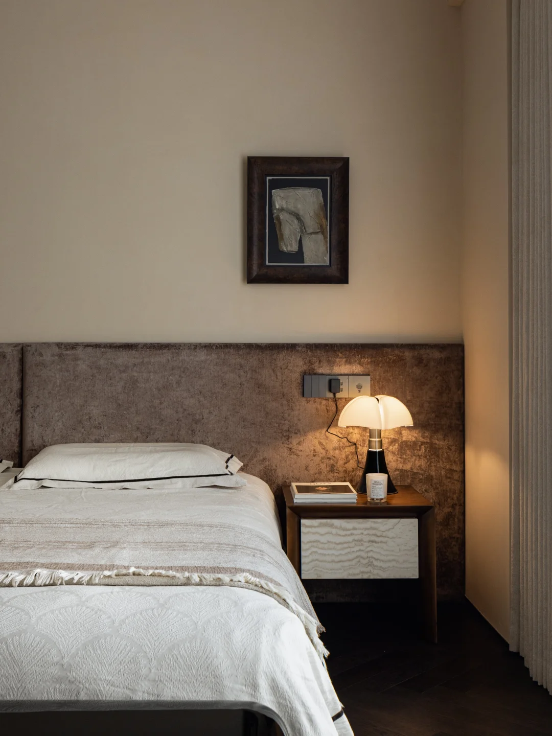 新作日曜之城大平层(卧室篇) 这间卧室,我们想让它像一幅安静的中古油画。 乌木色系打底,墙面用的是艺术肌理涂料 床靠背选了绒面材质,柔软地把身体接住,和乌木的沉稳刚好一柔一稳。 最妙的其实是床尾的梳妆台设计——一洞石面,金属凳,像给空间戴上“饰品 再挂上一幅画、搭几件软装单品,整个卧室就有了画廊般的松弛感。 硬装没大动,墙面只是换了肌理,但气质完全变了 装修软装精装房改造卧室主卧设计中古风买手店设计设计师款床背景梳妆台设计
