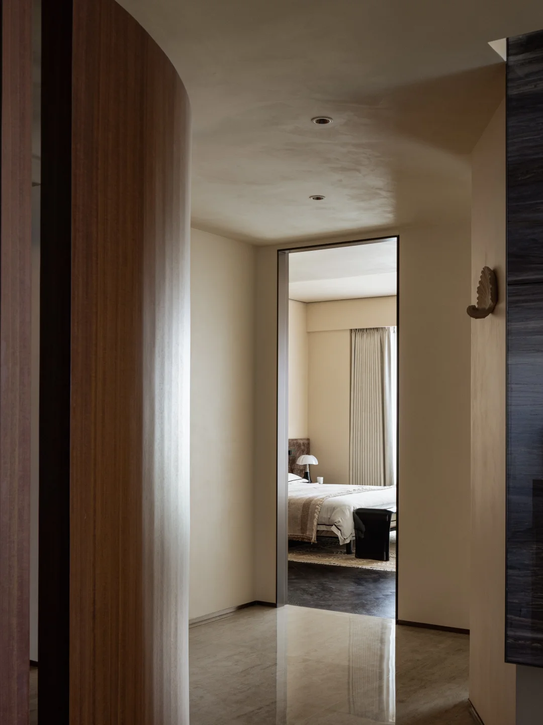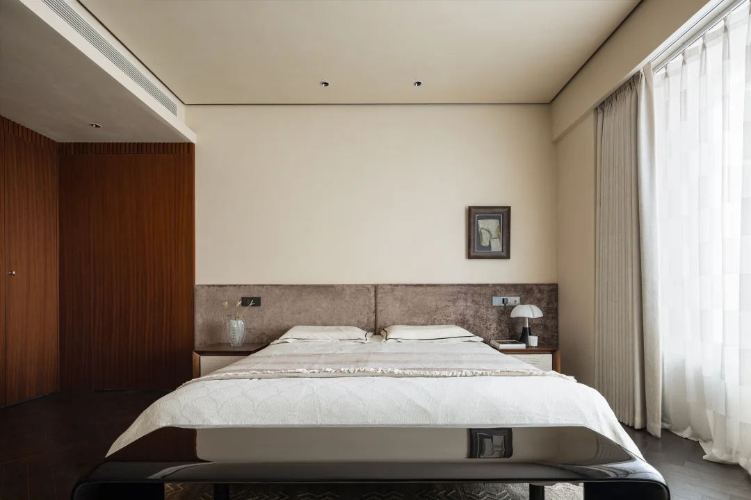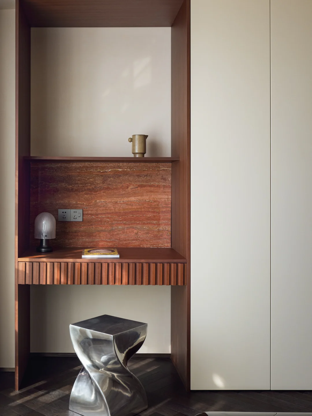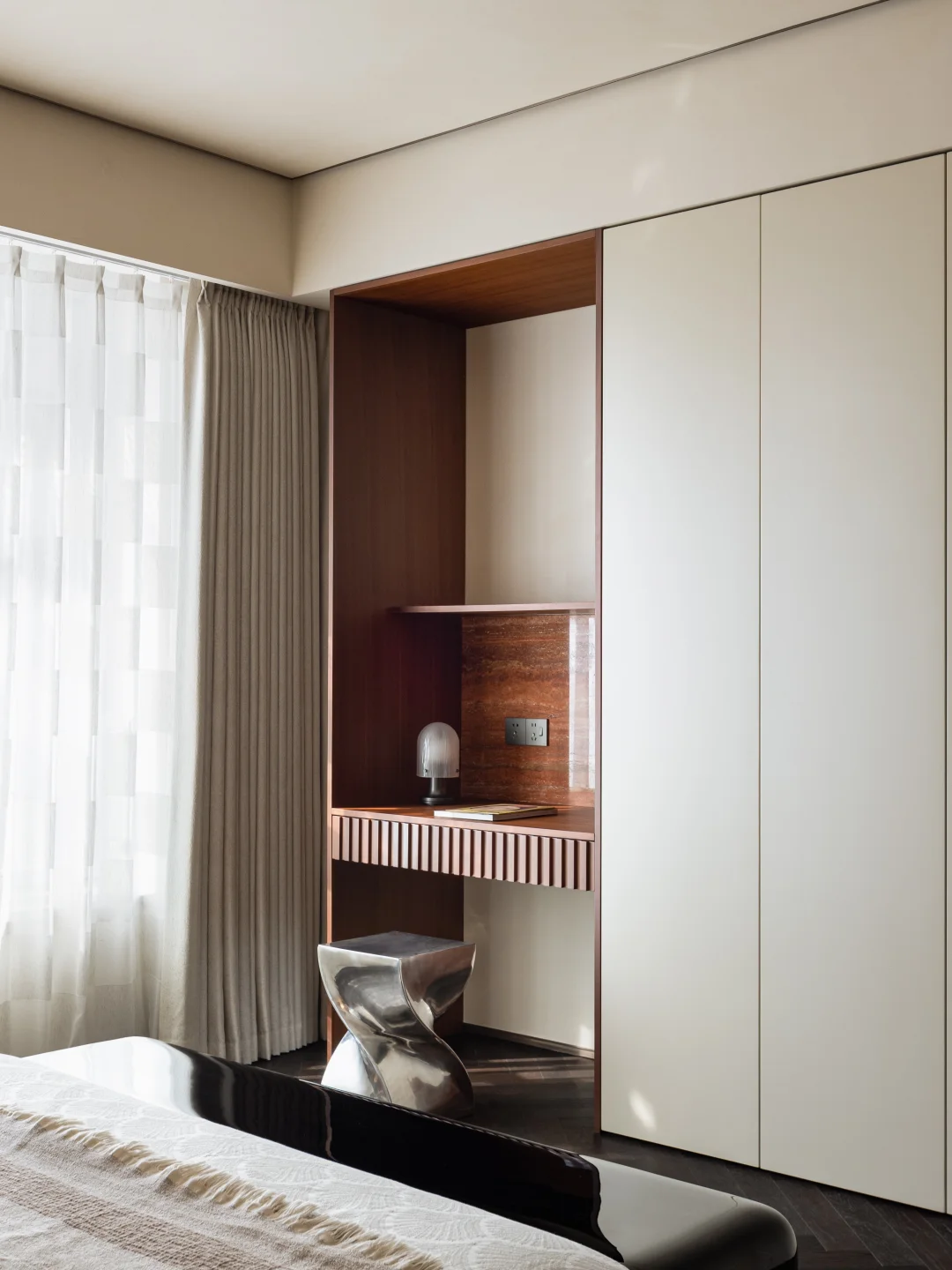 新作日曜之城大平层(卧室篇) 这间卧室,我们想让它像一幅安静的中古油画。 乌木色系打底,墙面用的是艺术肌理涂料 床靠背选了绒面材质,柔软地把身体接住,和乌木的沉稳刚好一柔一稳。 最妙的其实是床尾的梳妆台设计——一洞石面,金属凳,像给空间戴上“饰品 再挂上一幅画、搭几件软装单品,整个卧室就有了画廊般的松弛感。 硬装没大动,墙面只是换了肌理,但气质完全变了 装修软装精装房改造卧室主卧设计中古风买手店设计设计师款床背景梳妆台设计