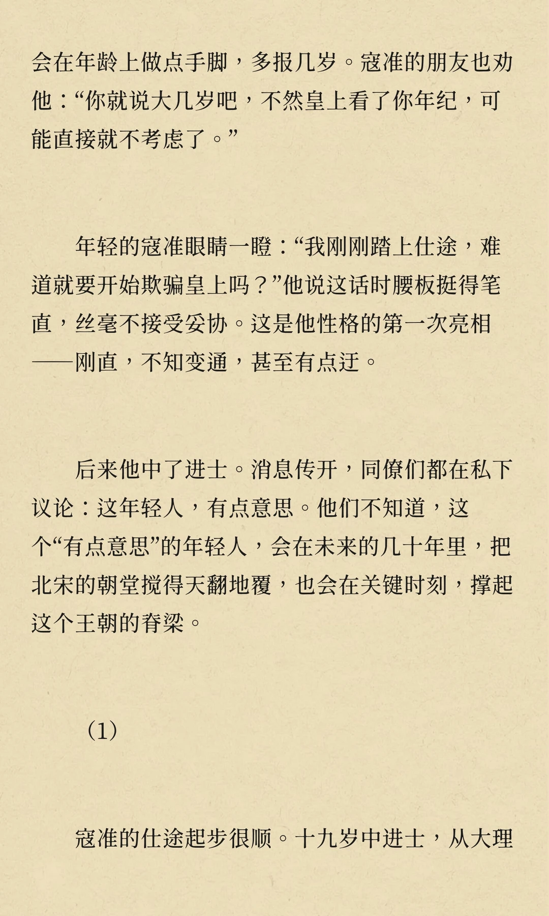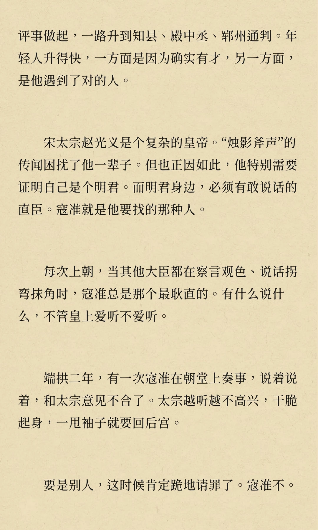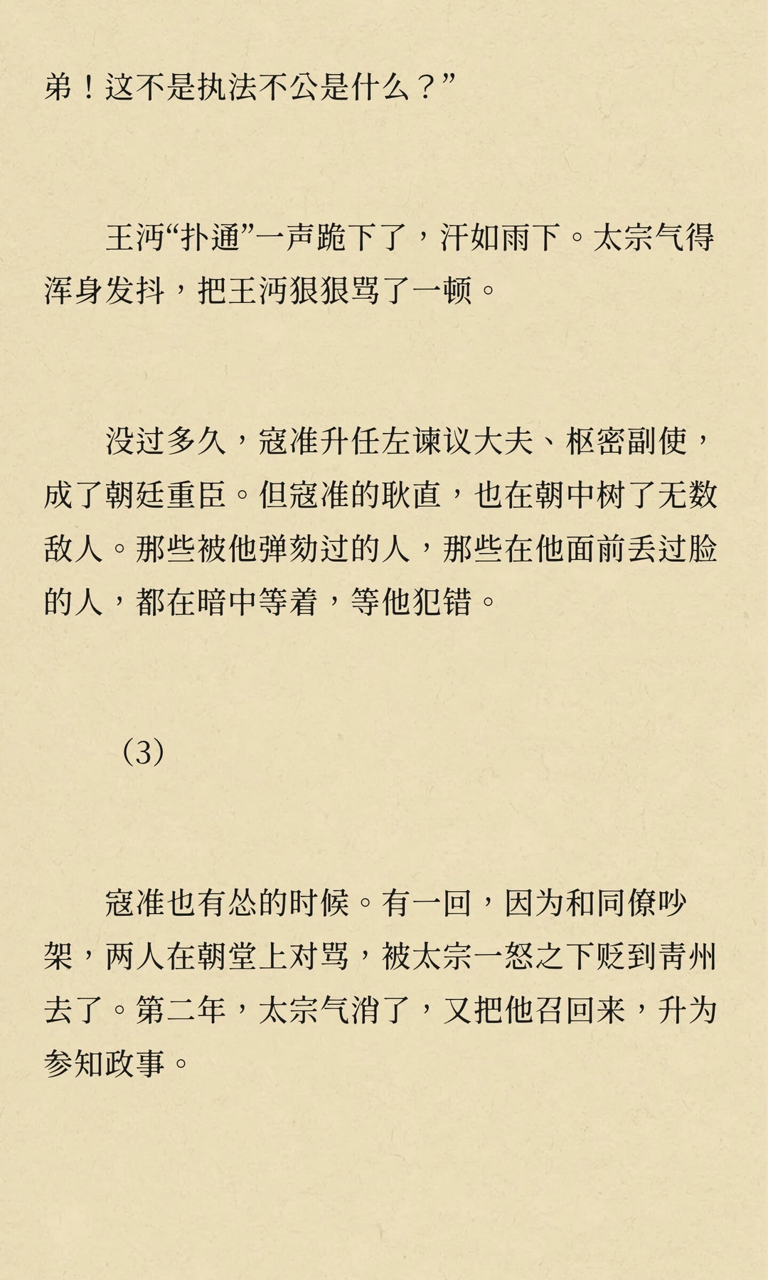 年轻时的寇准因直言不讳,得罪权贵,仕途波折。他直言不讳,甚至拽住宋太宗的龙袍。但他的耿直也让他得罪人,最终被贬。晚年,他因被陷害,客死他乡。