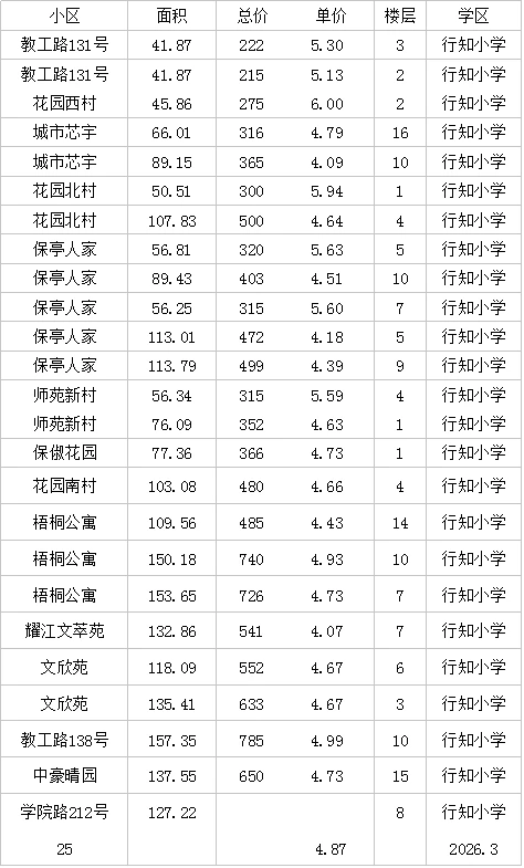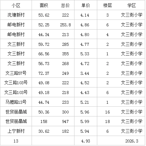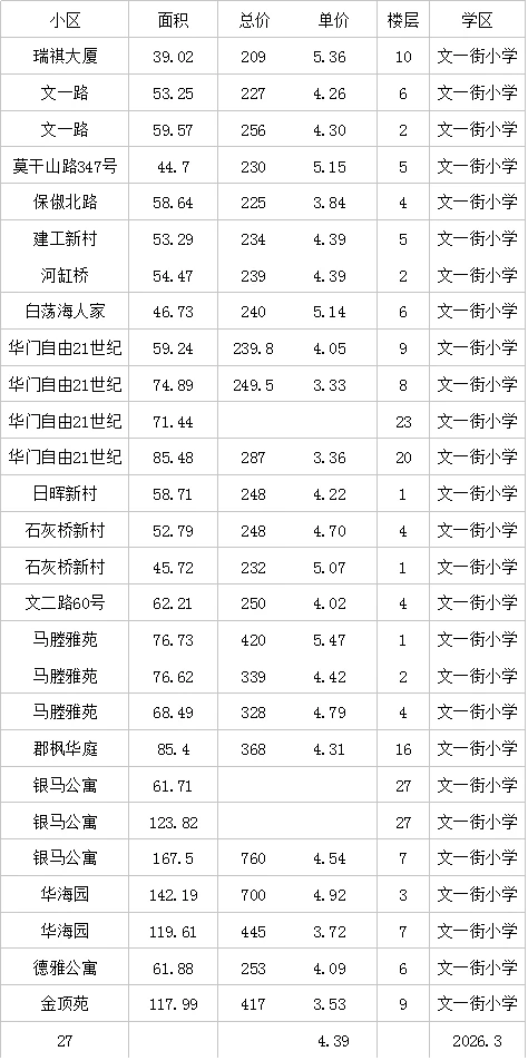 2026年3月文教四小成交明细,学军本部,行知,文三街,文一街成交数据