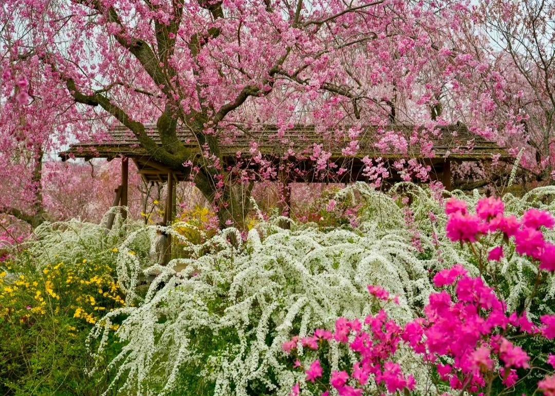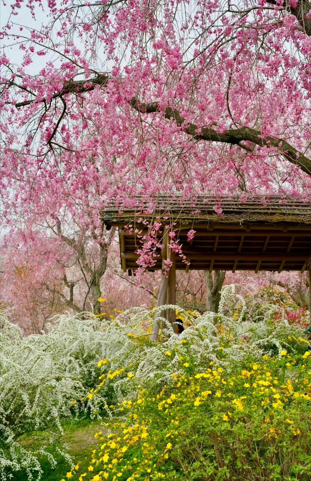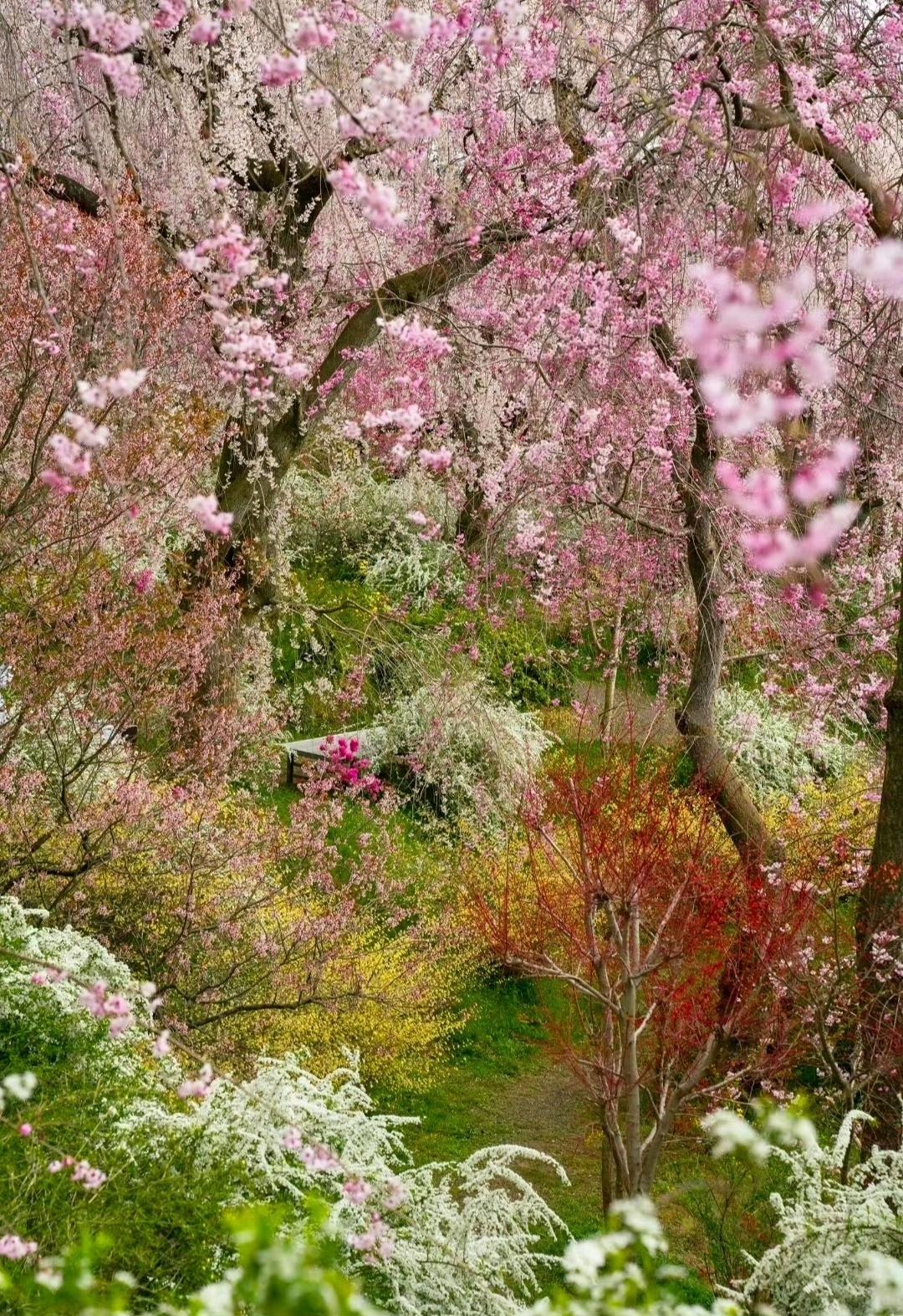 调色盘打翻在四月的春风里, 漫山的粉樱、雪柳与金盏花,揉碎了一整个春天的温柔。