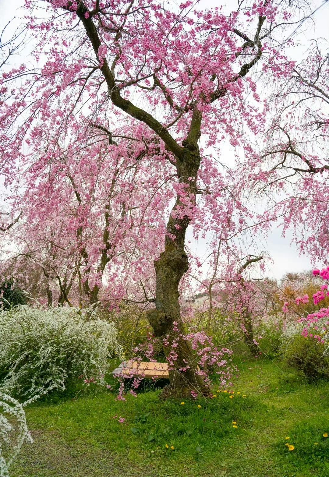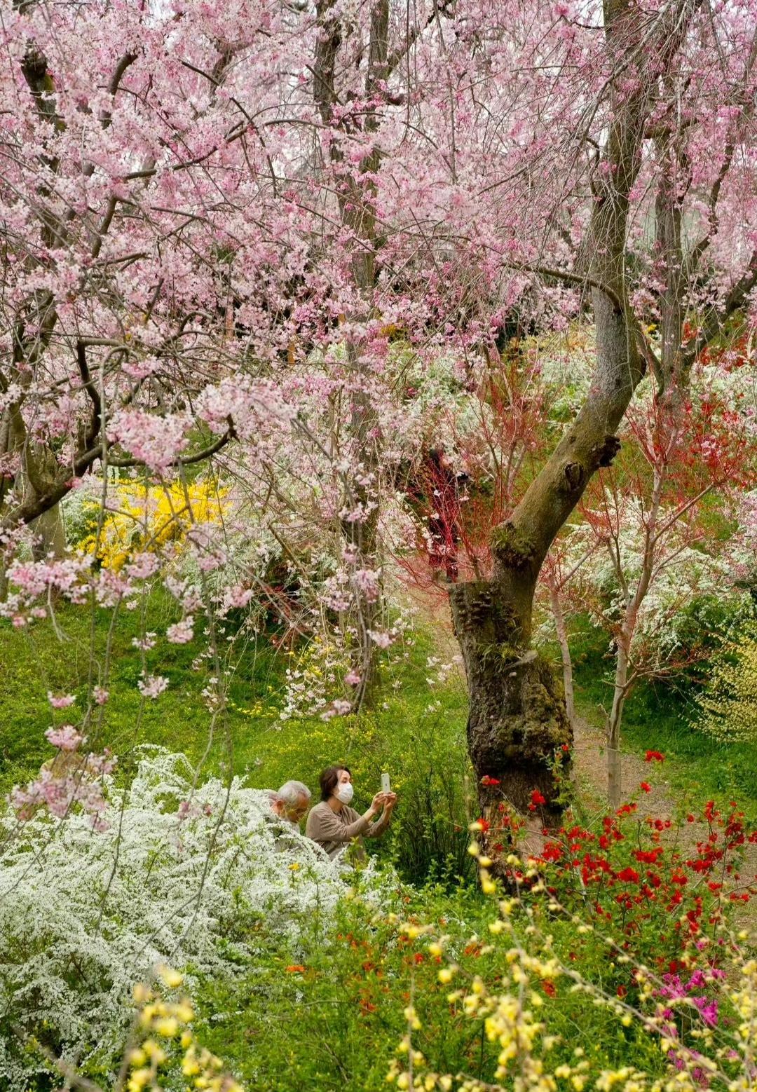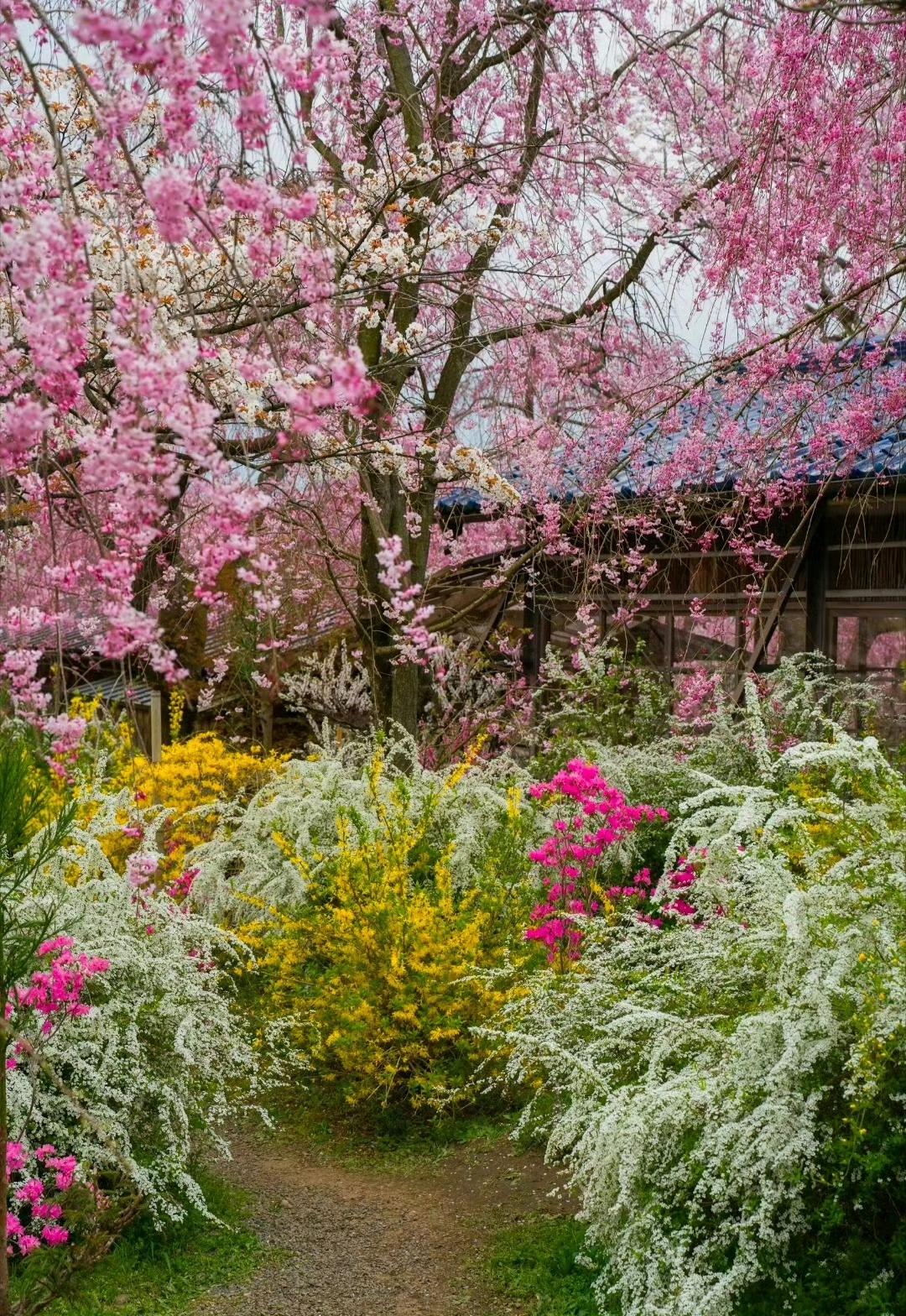 调色盘打翻在四月的春风里, 漫山的粉樱、雪柳与金盏花,揉碎了一整个春天的温柔。