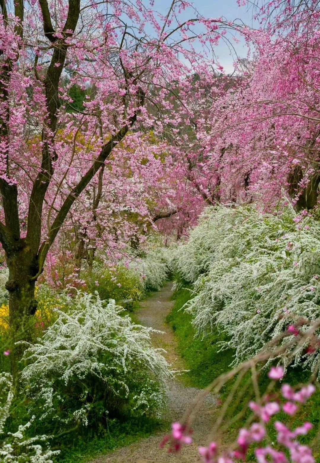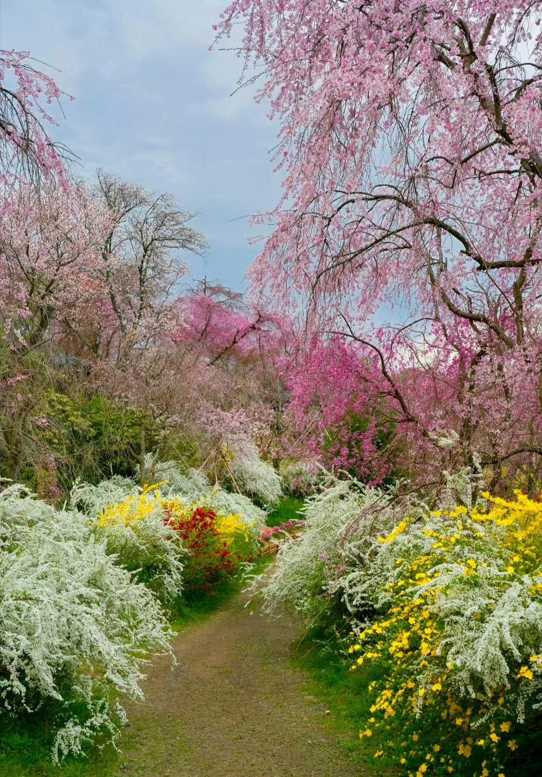 调色盘打翻在四月的春风里, 漫山的粉樱、雪柳与金盏花,揉碎了一整个春天的温柔。 原来所谓的人间四月天,从来都藏在这片被花树拥抱着的风里。