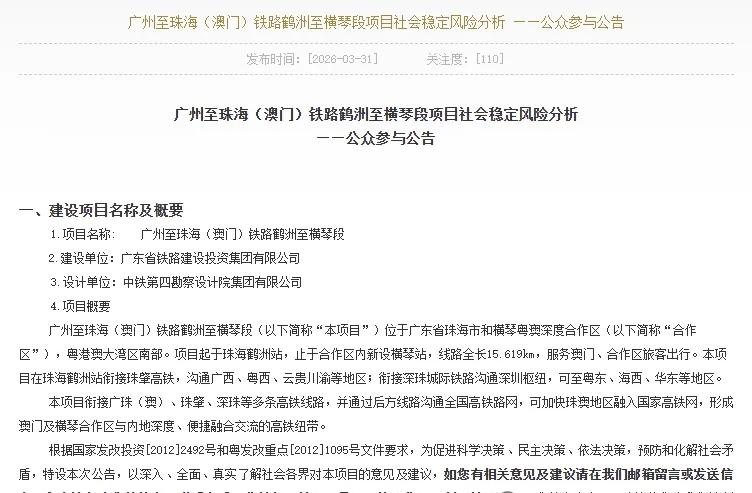 时速250公里直通澳门 广珠澳高铁关键段迎来重大进展 2026年4月2日,《广州至珠海(澳门)铁路鹤洲至横琴段海域使用论证报告书》评审前公示正式发布,标志着这条设计时速250公里、直接联通澳门与国家高铁网的核心线路,已进入可行性研究与初步设计批复的关键前期阶段,项目明确计划于2026年内开工建设。 作为京哈-京港澳高铁主通道的重要组成部分,广珠(澳)高铁鹤洲至横琴段已纳入《中长期铁路网规划》《“十四五”铁路发展规划》等多项国家级重点规划,是粤港澳大湾区基础设施互联互通的标志性工程。线路起于珠海鹤洲站,终至横琴粤澳深度合作区横琴站,新建正线全长约15.6公里,全线设2座车站,铁路等级为高速铁路,设计总工期5年,其中全线控制性工程鹤琴隧道盾构工区贯通工期约48个月。根据可研规划,线路近期、远期最大开行列车对数分别可达130对/日、142对/日,可充分匹配未来区域客流增长需求。 该项目的建设,是破解珠澳地区高铁通道瓶颈的核心举措。目前珠澳北向对外高铁出行主要依托设计时速200公里的广珠城际铁路,该线路运能已基本饱和,仅能开行4对跨线至京广高铁的客车,难以匹配区域中长途客流增长需求。根据客流预测,研究年度近、远期珠澳发展极北向客流将分别达到636万人次、746万人次,对应客车需求32对、38对,叠加广珠澳主轴庞大的城际客流,新建高标准高铁通道已成为区域发展的迫切需要。 项目建成后,将成为澳门与内地深度融合交流的高铁核心纽带。在广珠(澳)高铁全线贯通前,该段可衔接珠肇高铁、广湛高铁,形成途经佛山、江门的广州至珠海至澳门西向通路;全线建成后,将打通途经广州空港、番禺、南沙、中山的广珠澳高铁主通路,同时衔接深珠高铁等线路,串联广州、深圳两大国家级枢纽,辐射粤西、桂滇、川渝乃至全国高铁网,彻底打通澳门融入国家高铁网的快速通道。 这一项目的落地,不仅将全面补强粤港澳大湾区广珠澳主轴的交通承载能力,有力支撑大湾区“极点带动、轴带支撑”的空间发展格局,更将有效拓展澳门经济发展腹地,对助力澳门更好融入国家发展大局、保持澳门长期繁荣稳定具有重大而深远的意义。截至目前,项目已同步发布社会稳定风险分析公众参与公告,各项前期工作正稳步推进,为年内如期开工筑牢基础。