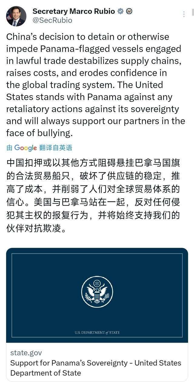 美国国务卿鲁比奥日前发文写道:“中国扣押或以其他方式阻碍悬挂巴拿马国旗的合法贸易船只,破坏了供应链的稳定,推高了成本,并削弱了人们对全球贸易体系的信心。美国与巴拿马站在一起,反对任何侵犯其主权的报复行为,并将始终支持我们的伙伴对抗欺凌。”我们中国从来没有扣押过任何一艘合法的巴拿马籍贸易船只,也没有故意阻碍正常的贸易往来。 这件事的起因要从巴拿马那边说起。过去近三十年里,中资企业在巴拿马的巴尔博亚港和克里斯托瓦尔港投入大量资金,把原来设施比较旧、吞吐量不高的码头逐步建成了现代化的枢纽。到2025年,这两个港口的年吞吐量已经超过450万标箱,占到巴拿马运河集装箱吞吐量的40%左右。它们每年给巴拿马政府上缴不少特许经营费,还创造了很多就业岗位,带动了当地物流和相关产业。双方合作本来一直比较平稳。 2025年,鲁比奥担任美国国务卿后,早期出访就去了巴拿马等地,强调地区合作和战略通道的重要性。2026年1月底,巴拿马最高法院以违宪为由,宣布那份长期合同无效。2月23日,巴拿马政府直接派人接管港口,切断系统权限,把临时运营权转给其他企业。这一系列动作发生在巴拿马与美国加强联系的背景下,美国方面此前多次表达过对运河地区影响力的关切。 从2026年3月8日开始,中国各大港口对停靠的巴拿马籍船舶启动专项安全检查。这属于港口国监督的正常工作,按照国际海事组织公约和全球航运惯例来办,主要检查船舶安全设施、消防救生设备、船员资质、排污合规等项目。巴拿马船籍注册政策相对宽松,历史上这类船舶的安全隐患比例比一些国家高一些,所以检查中发现问题后,会要求整改,整改不合格的就暂时滞留处理。 数据上看,3月8日到12日这五天,有28艘巴拿马籍船舶因为合规问题被滞留,占同期中国港口滞留外籍船舶总数的75.7%,比往年20%到25%的比例明显高。到3月下旬,滞留数量接近70艘。这些船大多是大型集装箱货轮,停运一天损失不小,很多航运公司开始考虑转籍选项。中远海运也暂停了巴尔博亚港的相关到离港服务,运河通行费每天损失超过80万美元。巴拿马政府感受到经济压力后,开始放出软化信号,希望通过对话解决问题。 鲁比奥在北京时间4月2日晚发的那条文,基本就是指责中国这些检查行动破坏供应链、增加成本、影响贸易信心,还说美国支持巴拿马主权,反对所谓报复和欺凌。中国外交部门明确回应,从来没有扣押任何合法巴拿马籍贸易船只,这些检查是依法行使主权、开展正常监督,完全符合国际规则,不是针对性报复。巴拿马先对长期合同做了单方面处理,中方采取的措施是维护自身合法权益的正当反制。 整个过程里,双方立场分明。美国把巴拿马的法院裁决说成维护法治和公共利益,中国则认为合同履行了近三十年,突然以违宪为由终止,背后有外部压力影响。巴拿马作为运河所在国,经济上依赖转口贸易和中国商品供应,这次港口变动和船舶检查直接影响到它的船籍收入和运河相关收益。船东们面临实际损失,部分船舶申请转籍,巴拿马船籍的吸引力短期内受到冲击。 从国际贸易角度看,巴拿马旗是全球最大的方便旗之一,很多国际航运公司用它注册船舶。加强安全检查本是常见做法,但集中针对某一国旗船舶时,就容易被解读为有针对性。东京谅解备忘录组织的公开数据也显示,3月份在中国港口被滞留检查的船舶中,巴拿马籍占比显著上升。船只通常滞留几天到十天不等,整改合格后放行,并没有长期扣押。 中国是巴拿马第一大贸易伙伴和进口来源国,科隆自贸区很大部分货源来自中国。巴拿马国内市场上的工业品和日用品不少靠中国供应,转口贸易离不开这些供应链。港口事件后,巴拿马政府在经济现实面前调整了姿态,与中方保持沟通渠道。中国继续按照国际公约开展港口监督,同时强调维护企业合法权益。香港长和旗下公司已就港口合同终止提起国际仲裁,索赔金额达到20亿美元以上,双方还在法律层面继续交涉。